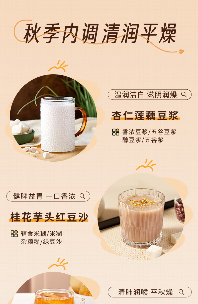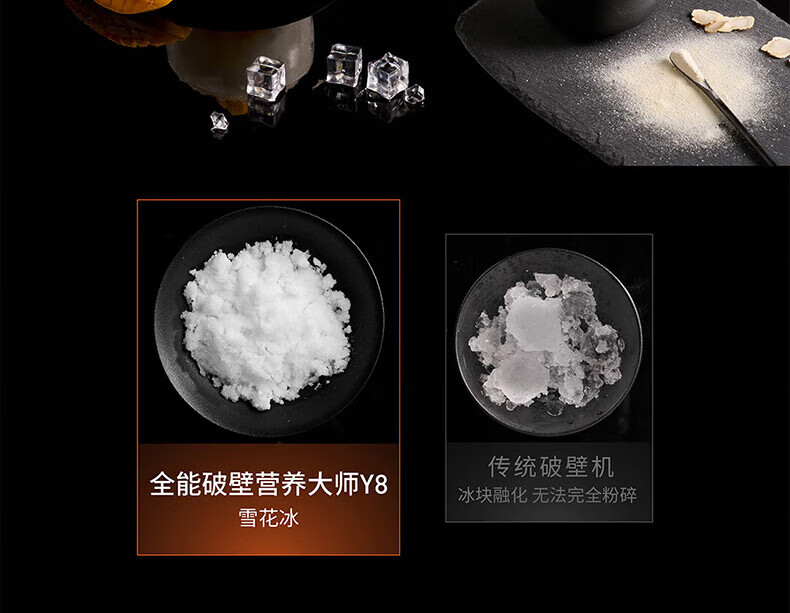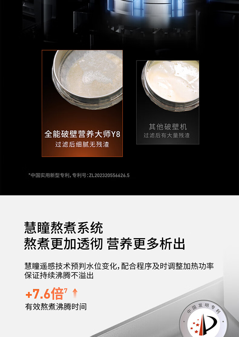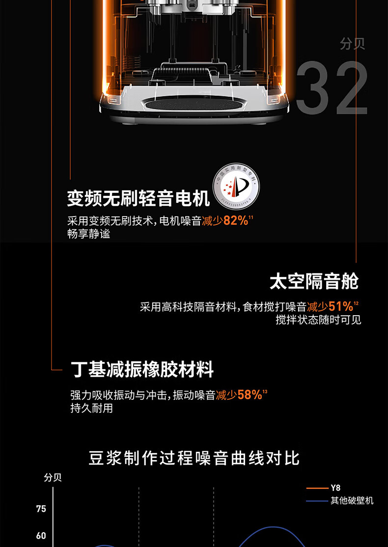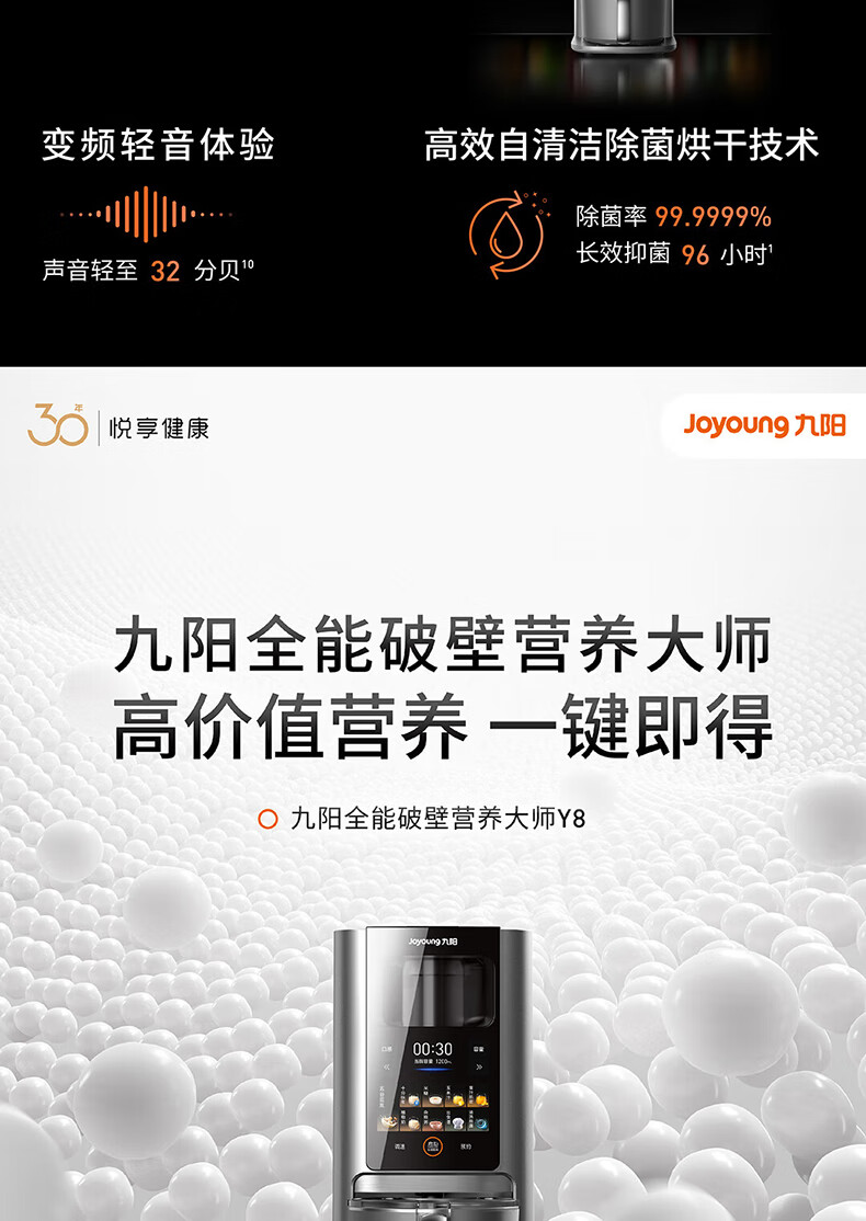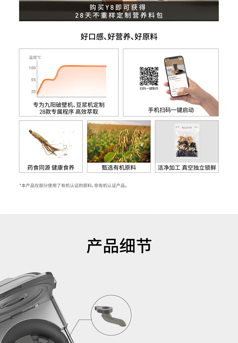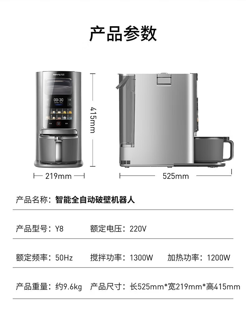 Y8功能:五谷豆浆,十分快浆,米糊,玉米汁,果汁奶昔,植物奶,杂粮粥,云食谱,清洗除菌,调速,预约 容量: 热饮300-1200毫升 冷饮300-1500 热饮4H自动保温 北京时间预约 变频无刷电机 35000高速电机 智能语音 Y9 功能:(五谷浓浆,杂粮米糊,坚果浓浆,快速豆浆,辅食浓汤,细腻果汁,高纤果汁、热烘除菌)+(容量,预约,调速,自清洗)+(绞肉,和面,磨粉,冰沙,原汁,打发) 热饮:0.3-1.2L,冷饮:0.3-0.8L 北京时间预约 可拆卸出水嘴,磁吸式轻松拆卸,清洗方便,变频无刷电机,35000高速电机,智能联网,智能语音