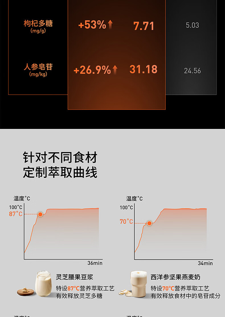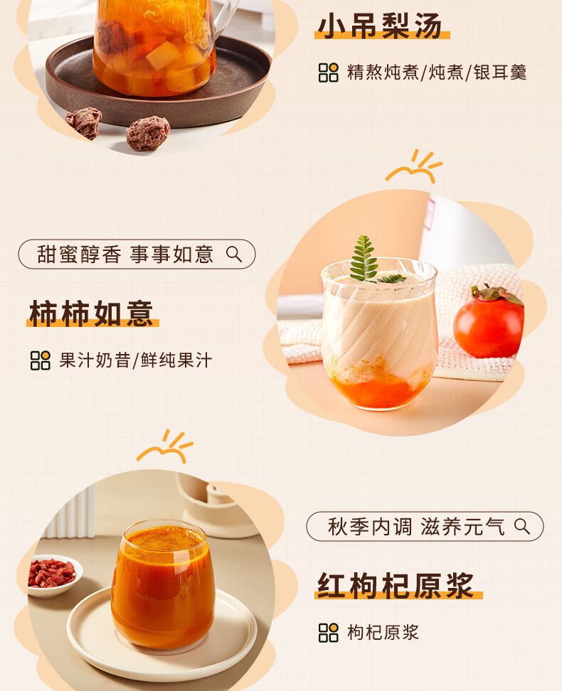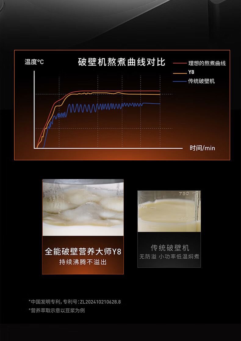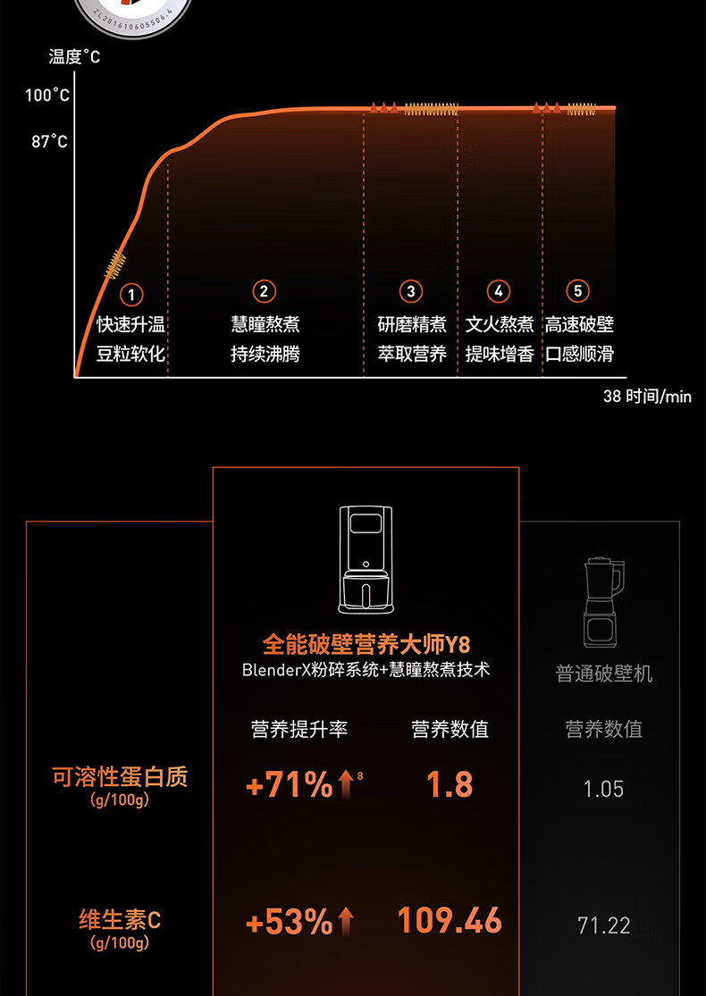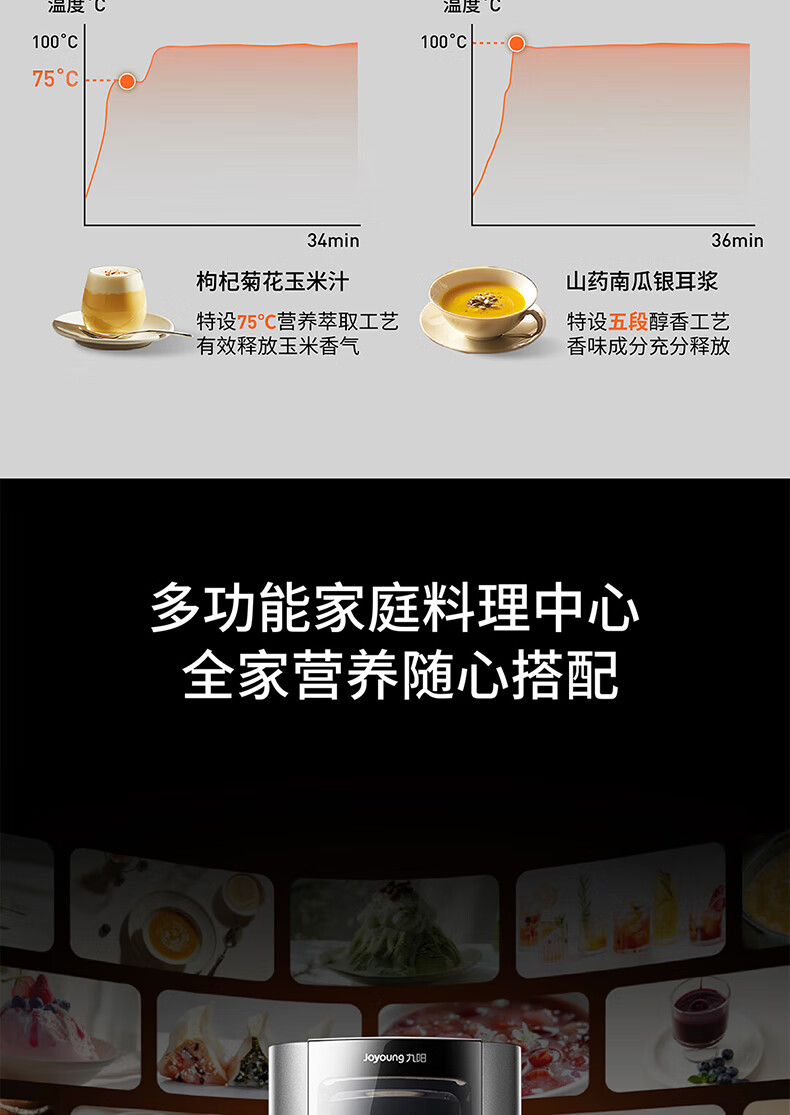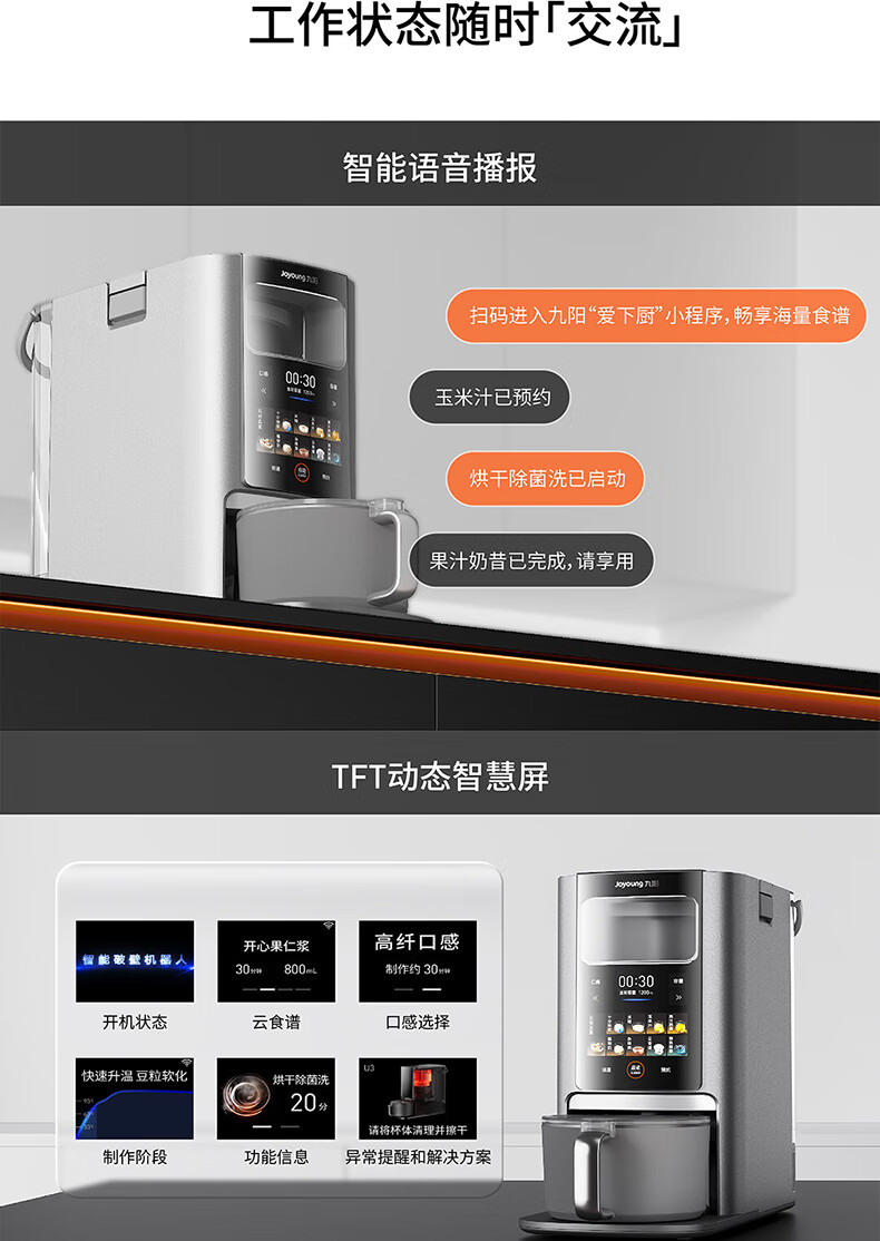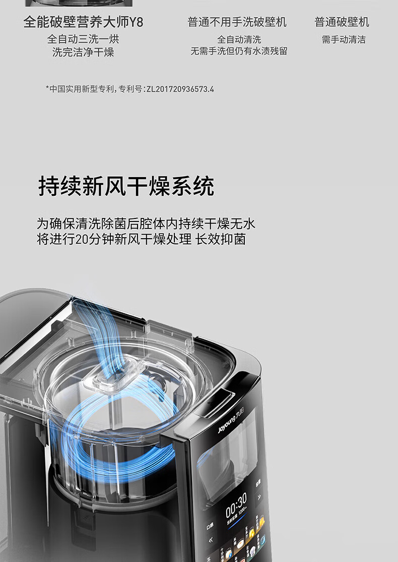 Y8功能:五谷豆浆,十分快浆,米糊,玉米汁,果汁奶昔,植物奶,杂粮粥,云食谱,清洗除菌,调速,预约 容量: 热饮300-1200毫升 冷饮300-1500 热饮4H自动保温 北京时间预约 变频无刷电机 35000高速电机 智能语音 Y9 功能:(五谷浓浆,杂粮米糊,坚果浓浆,快速豆浆,辅食浓汤,细腻果汁,高纤果汁、热烘除菌)+(容量,预约,调速,自清洗)+(绞肉,和面,磨粉,冰沙,原汁,打发) 热饮:0.3-1.2L,冷饮:0.3-0.8L 北京时间预约 可拆卸出水嘴,磁吸式轻松拆卸,清洗方便,变频无刷电机,35000高速电机,智能联网,智能语音