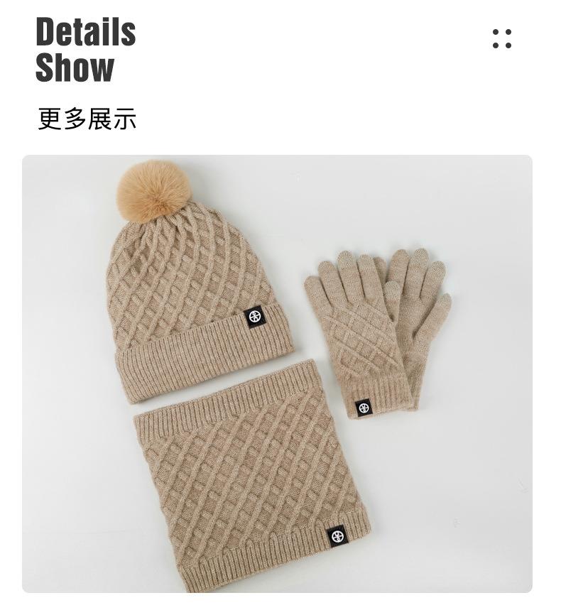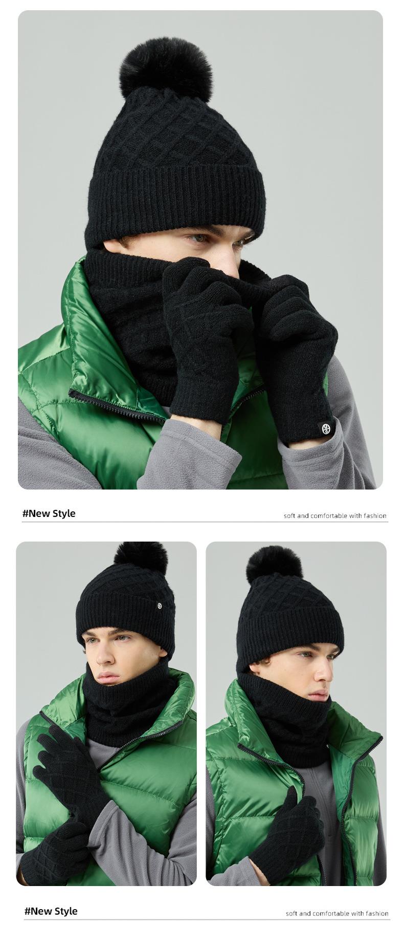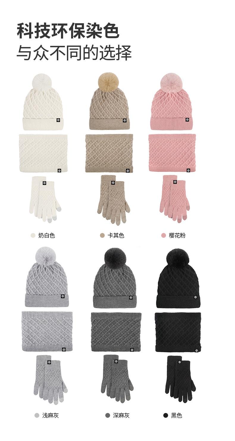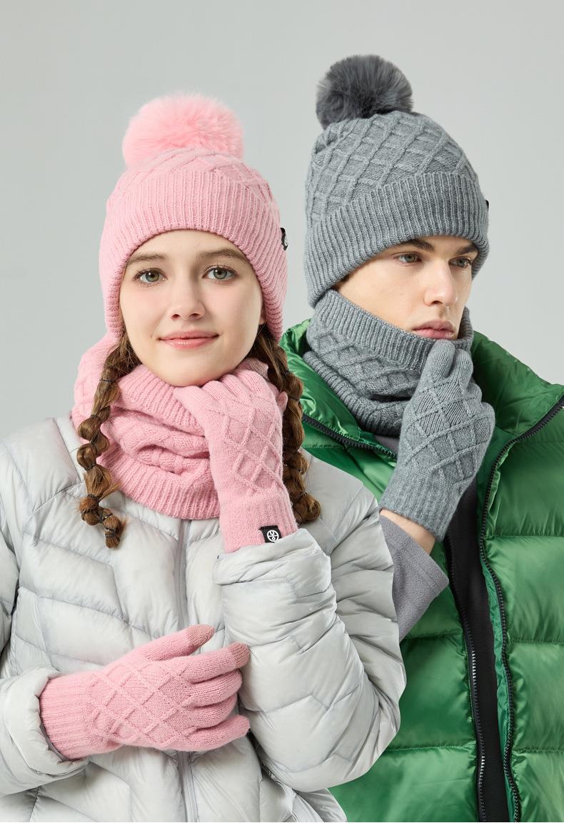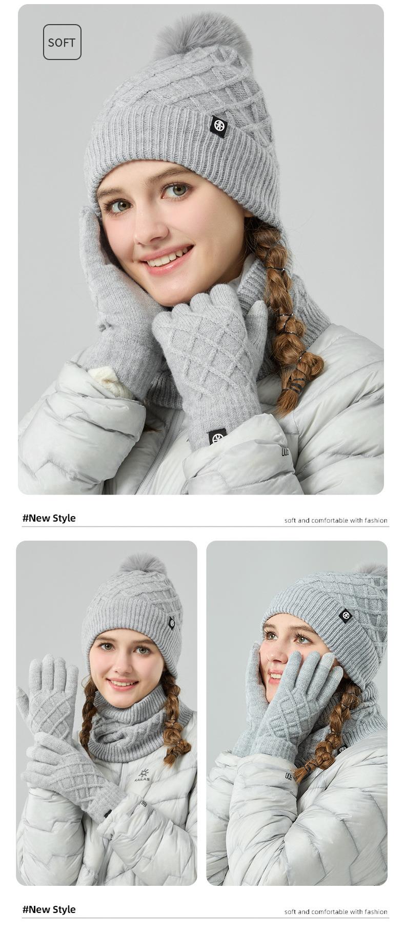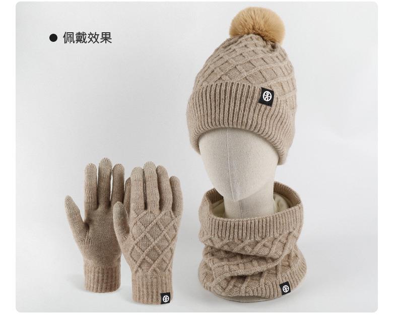 帽子围巾手套三件套冬季亚马逊加绒户外保暖毛球针织帽子三件套装