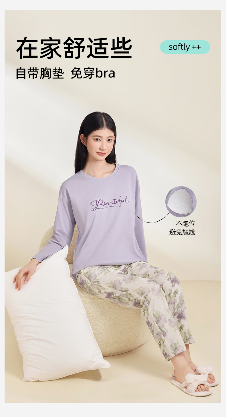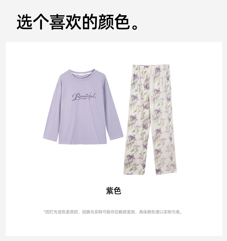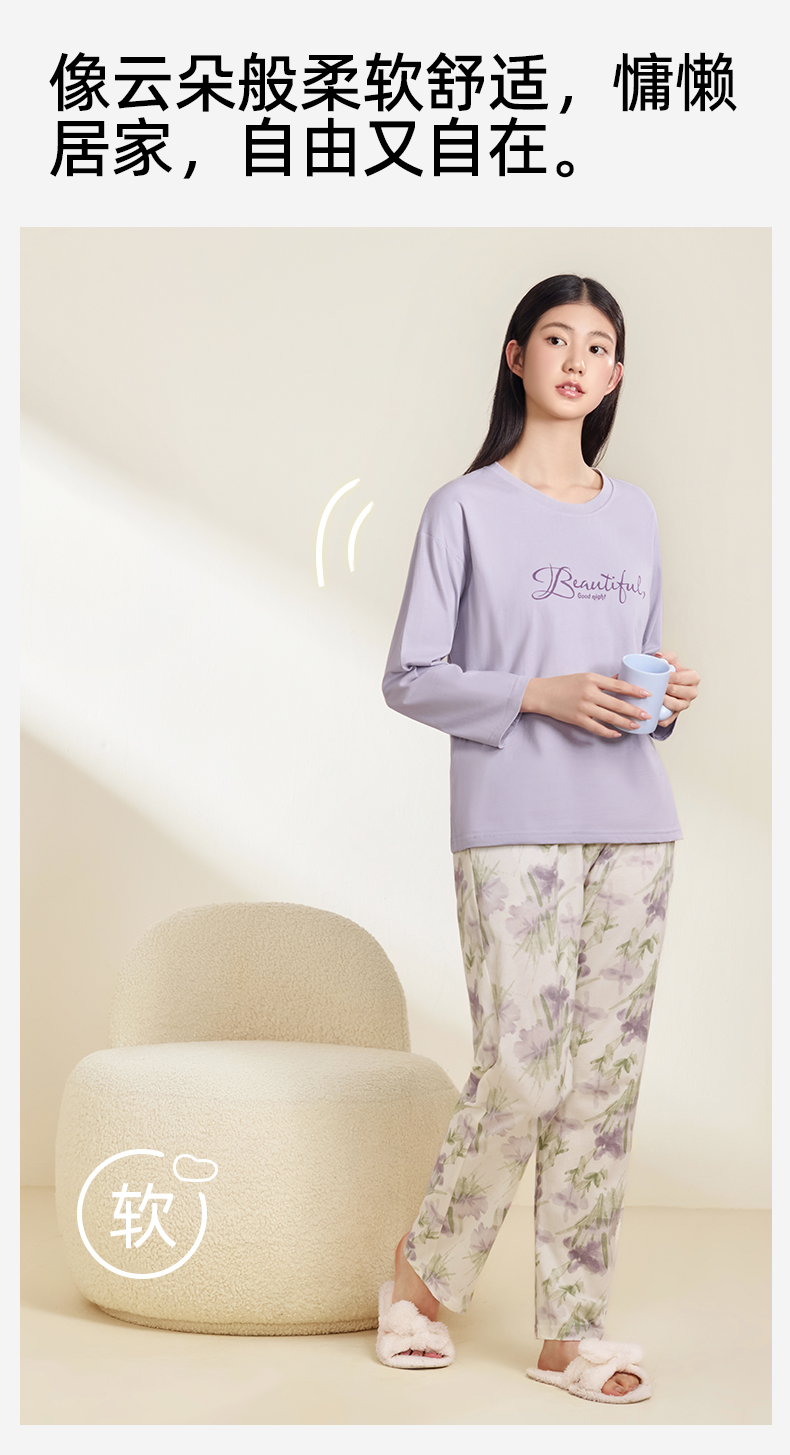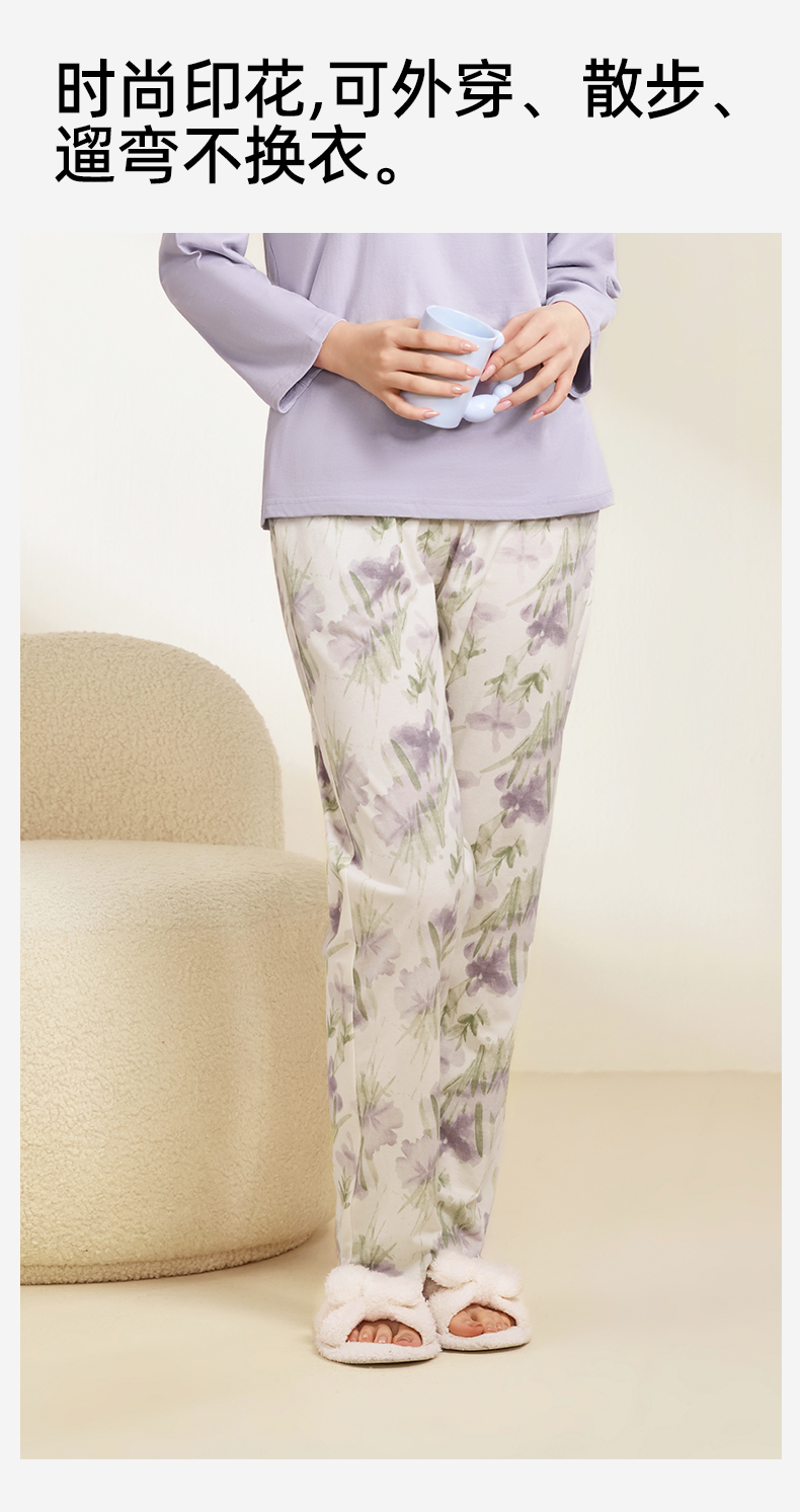 【带杯垫】熳洁儿 早秋新款纯棉家居服圆领套装撞色治愈紫植物花卉25763203