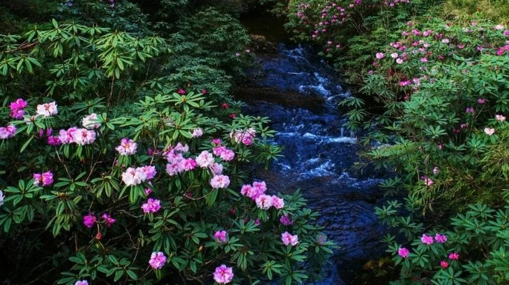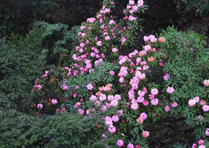 五月的瓦屋山杜鹃花成为了主角,品种多样,成簇开放,娇艳的杜鹃花在阳光下展现诱人的身姿,红如胭脂,粉如裙带,白如堆雪……姿态万千,令人心生怜爱。