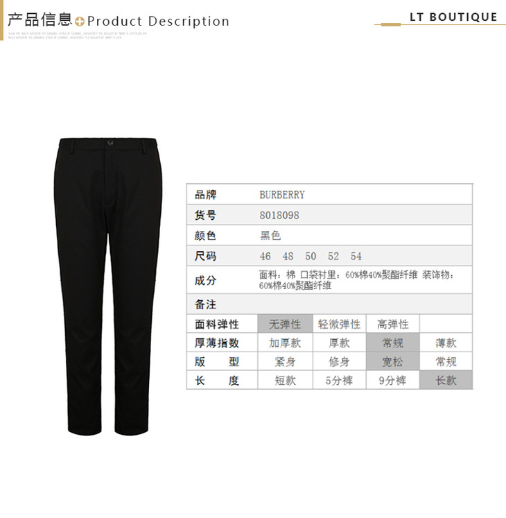 【二】BURBERRY 巴宝莉 男士修身棉质斜纹棉布休闲裤 黑色 8018098 A1189