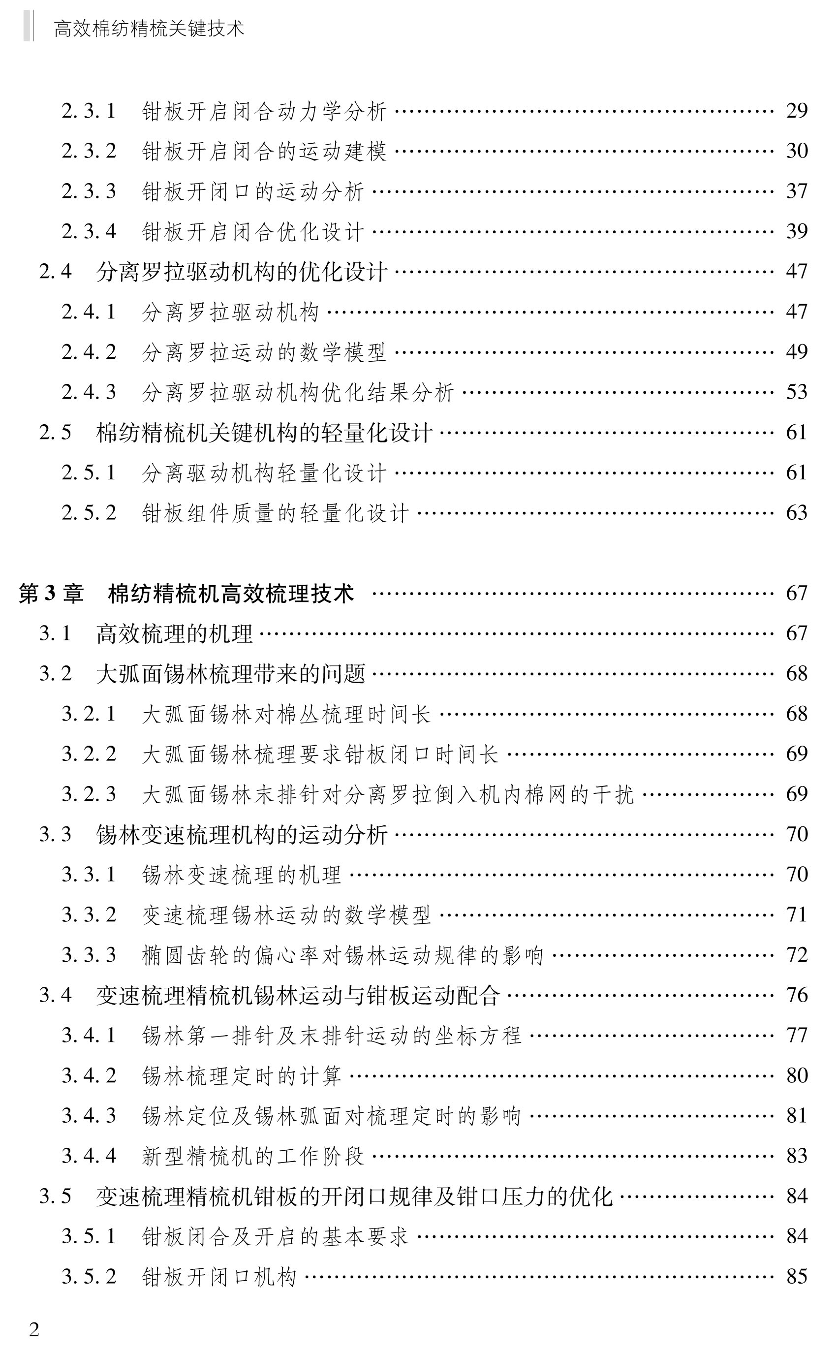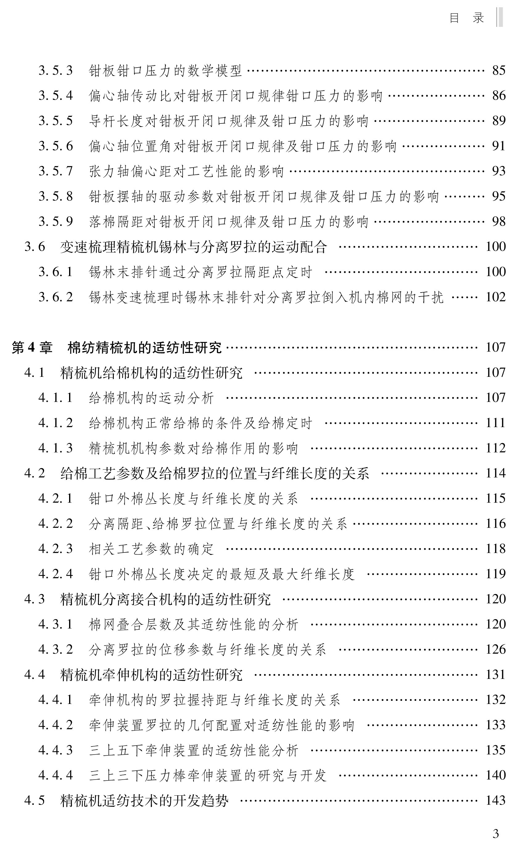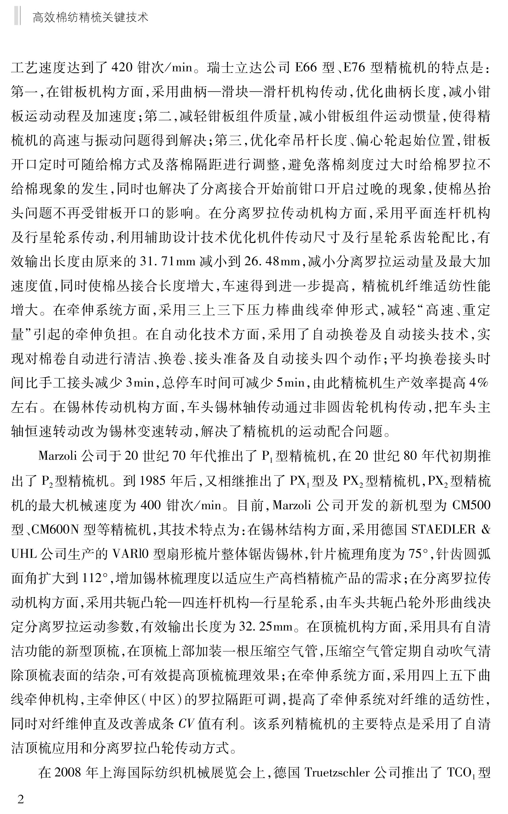 高效棉纺精梳关键技术通过建立精棉机驱动机构的运动学及动力模型,运用优化设计的方法,开发了钳板及分离罗拉驱动机构、椭圆齿轮驱动式锡林变速机构,突破了高速精梳机驱动机构的加速度大、惯量大、振动大、耗电量大的技术瓶颈,解决了锡林大弧面高效梳理的难题,扩展了精梳机对原料品种、纤维长度及纱支的适纺范围。本书主要对高效棉纺精梳机的高速化、高效梳理、扩展适纺范围、平衡优化设计等关键技术进行阐述与分析,介绍高速驱动机构、大弧面锡林梳理等方面的创新方案设计及特点等。“高效能棉纺精梳关键技术及其产业应用”获得2014年国科技进步二等奖。