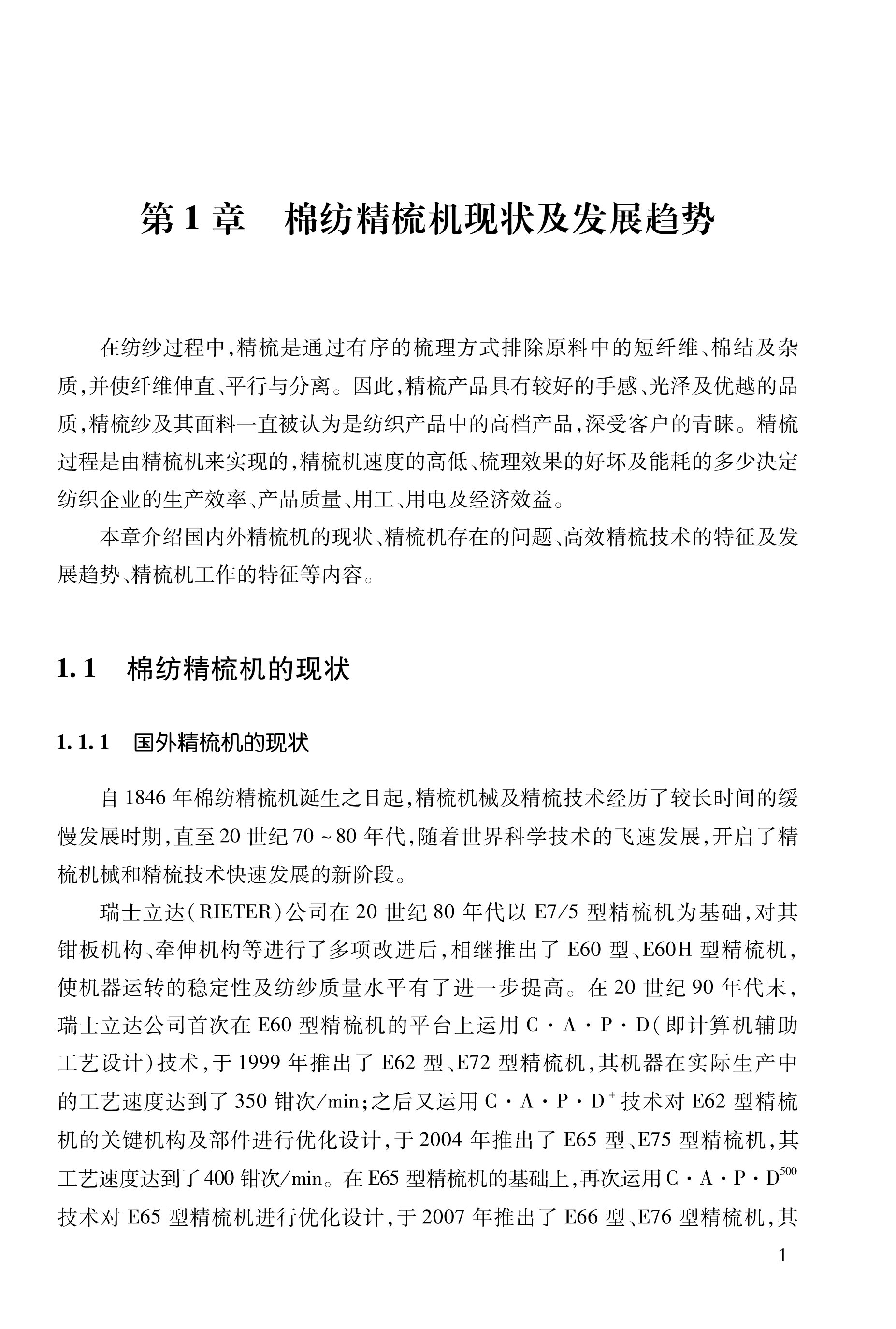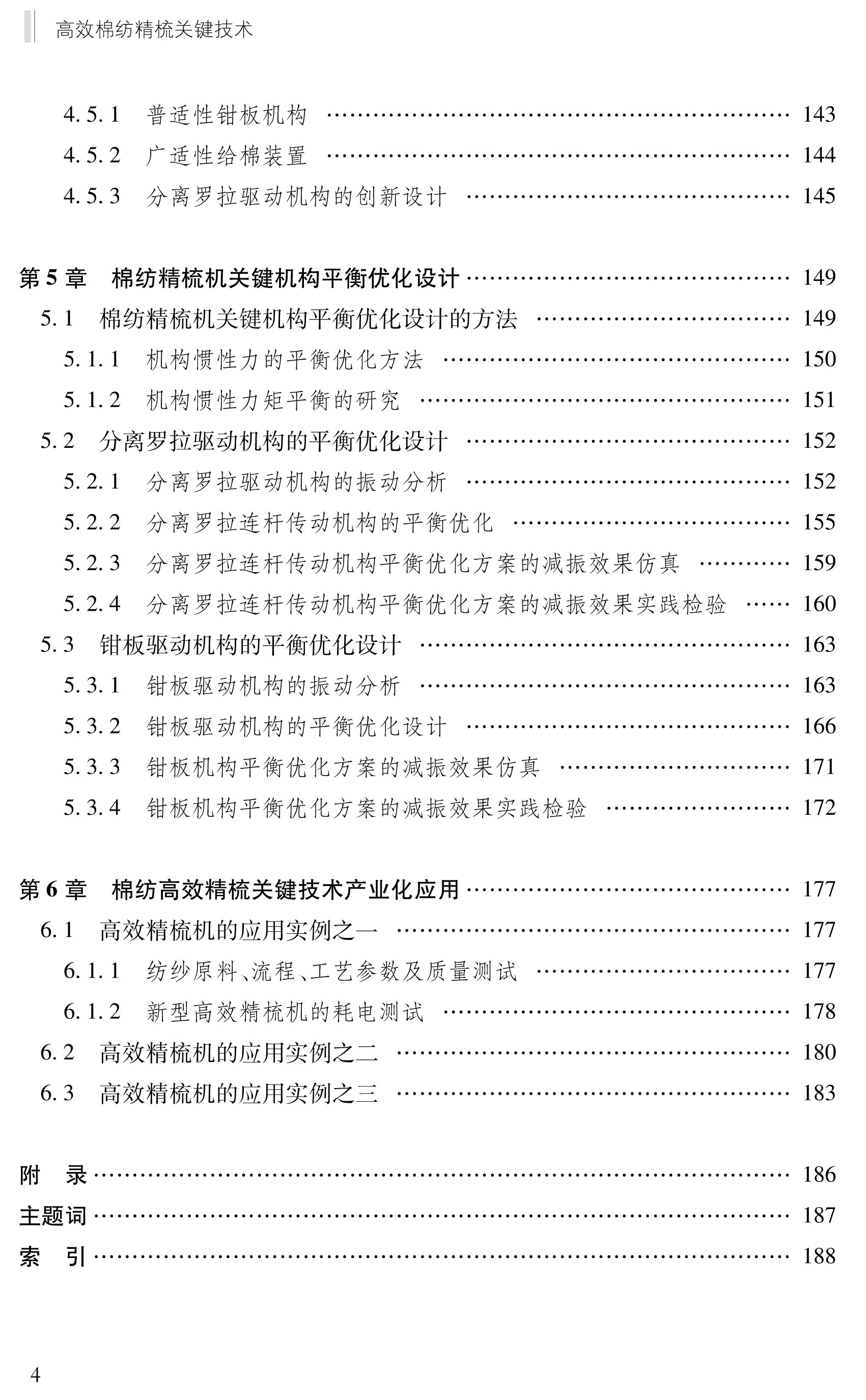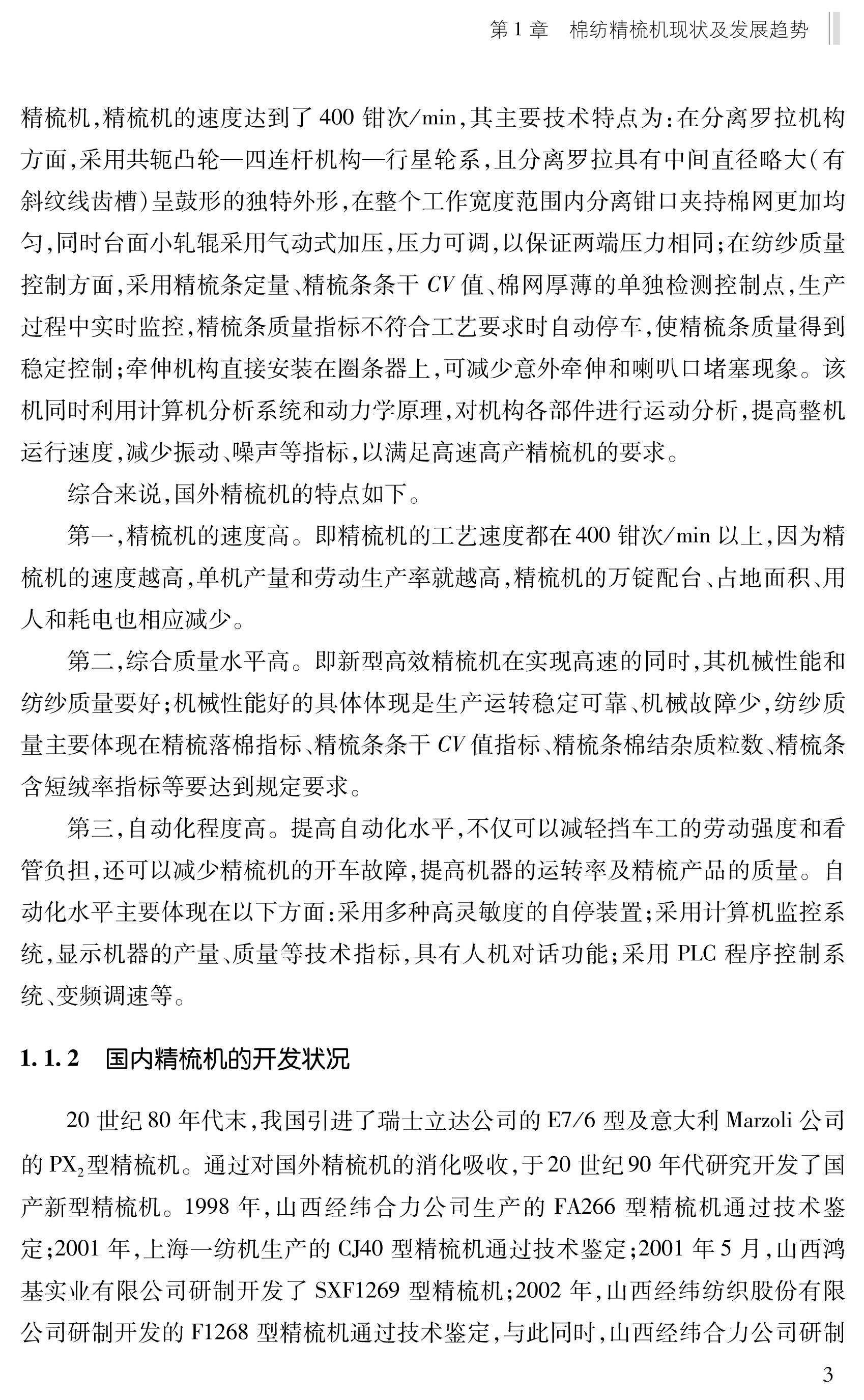高效棉纺精梳关键技术通过建立精棉机驱动机构的运动学及动力模型,运用优化设计的方法,开发了钳板及分离罗拉驱动机构、椭圆齿轮驱动式锡林变速机构,突破了高速精梳机驱动机构的加速度大、惯量大、振动大、耗电量大的技术瓶颈,解决了锡林大弧面高效梳理的难题,扩展了精梳机对原料品种、纤维长度及纱支的适纺范围。本书主要对高效棉纺精梳机的高速化、高效梳理、扩展适纺范围、平衡优化设计等关键技术进行阐述与分析,介绍高速驱动机构、大弧面锡林梳理等方面的创新方案设计及特点等。“高效能棉纺精梳关键技术及其产业应用”获得2014年国科技进步二等奖。