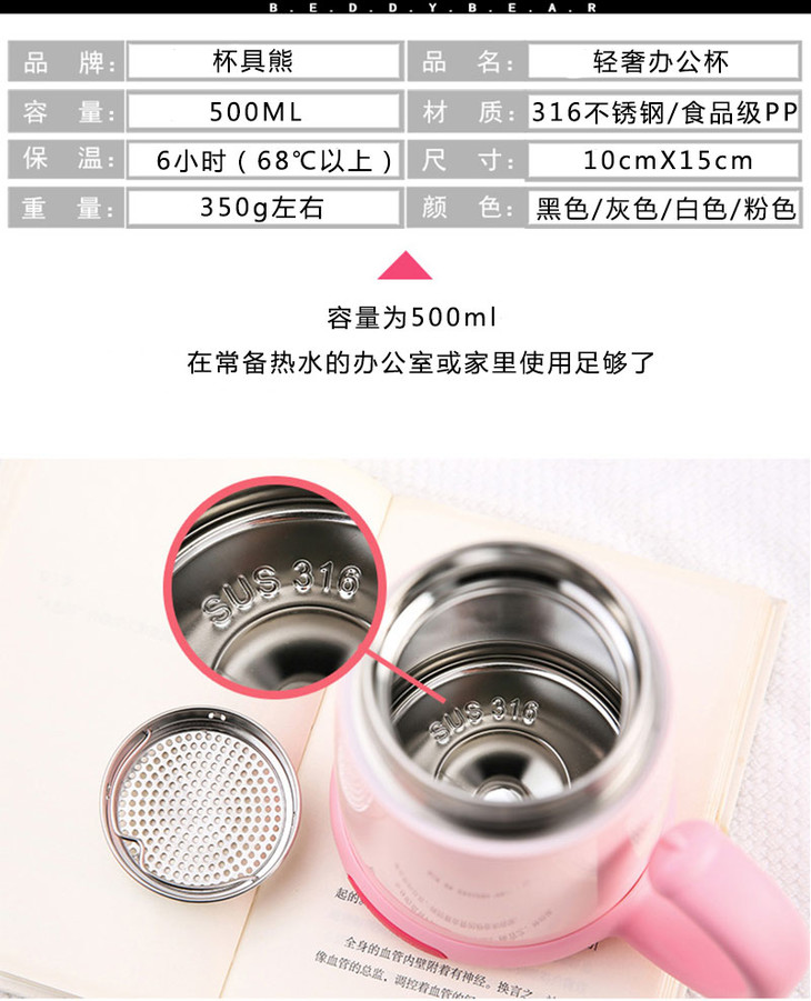 韩国杯具熊BeddyBear办公杯保温杯新款500ML四色选