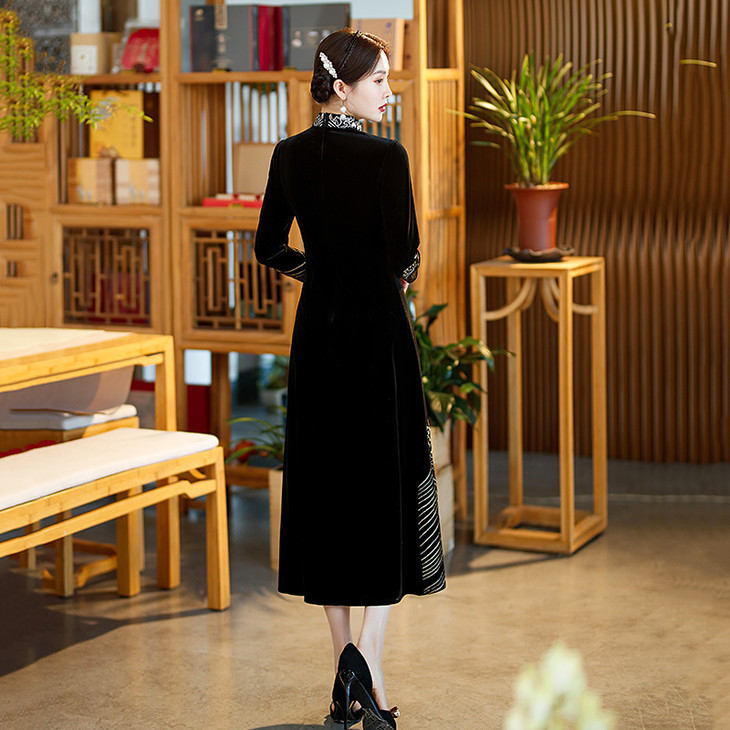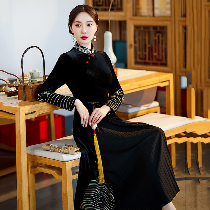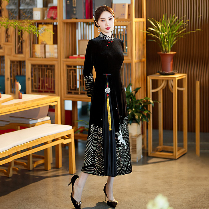 绣花金丝绒奥黛改良旗袍2024新款春秋新中式国风复古长袖连衣裙SC13682