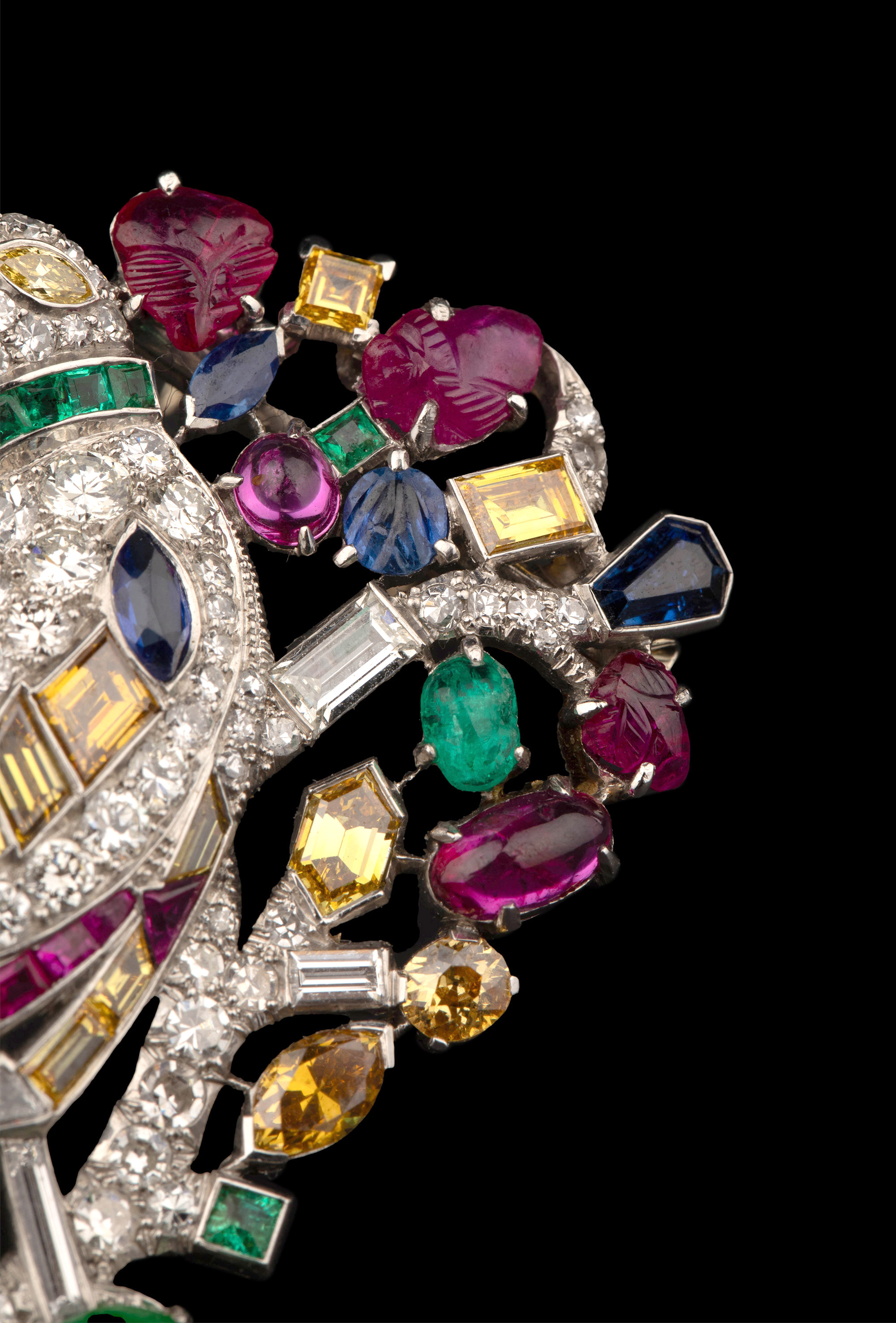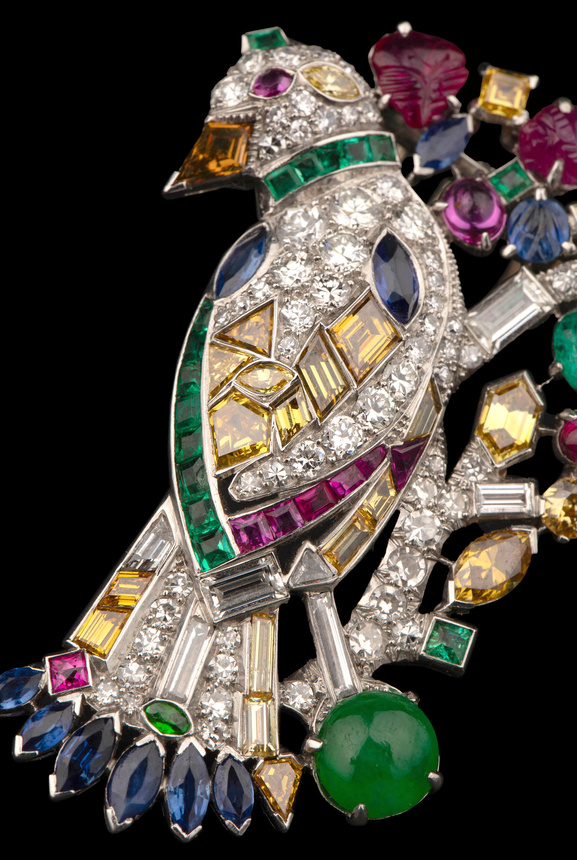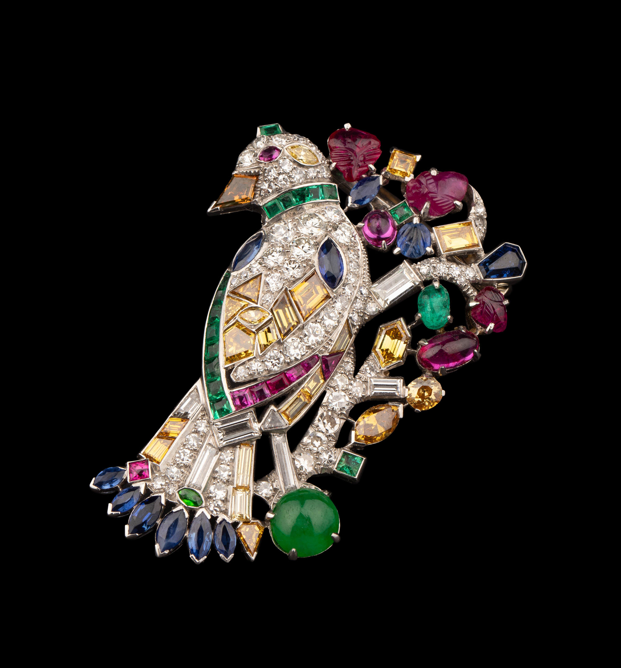 20世纪欧洲出品天堂鸟造型铂金镶嵌红宝石黄钻蓝宝石祖母绿及钻石胸针