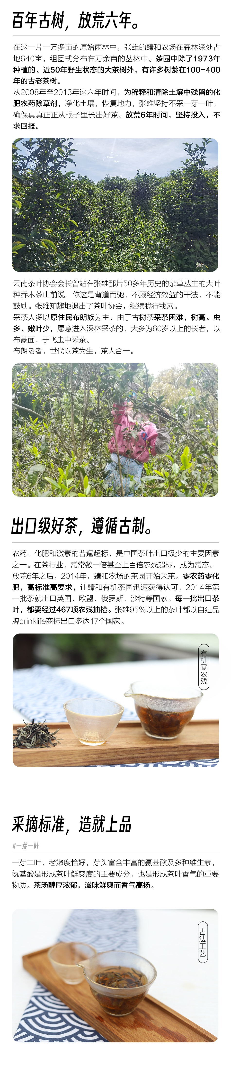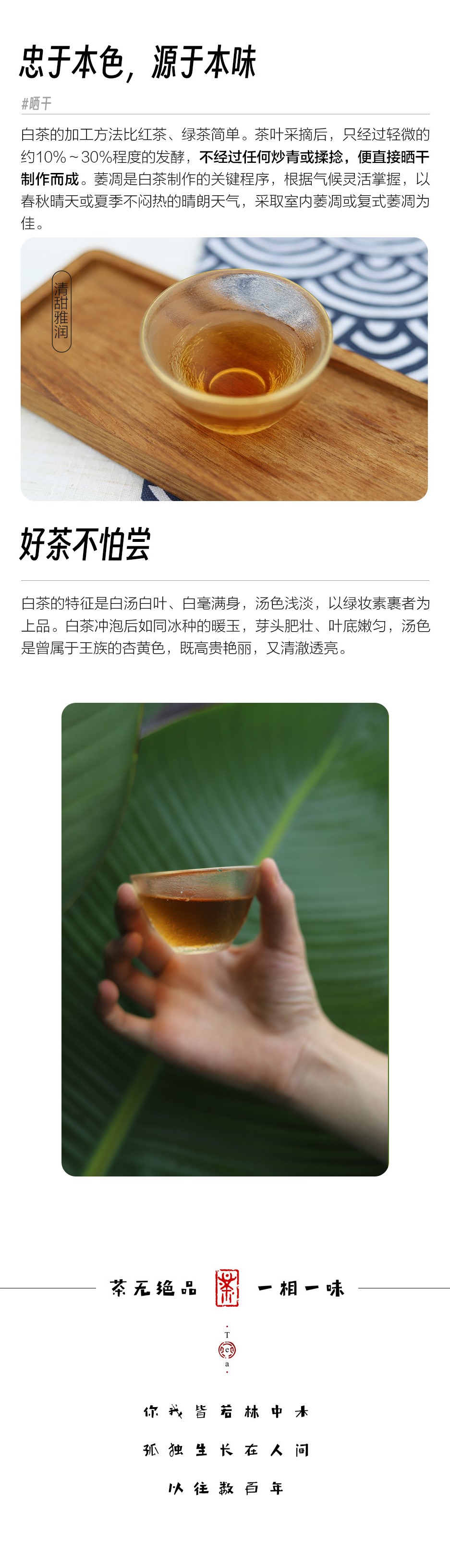| 【新农人】:张雄 【配料】:大叶种实生苗乔木 【品种】:大树白茶、大树白茶茶饼 【规格】:礼盒装50g/罐,简装50g/袋,茶饼357g 【加工工艺】:日晒型 【生产日期】:见包装印码处 【保质期】在符合标准要求的条件下,适宜长期保存,越陈越香 【生产地址】:云南省普洱市思茅区思茅港镇 【采摘标准】:一芽二叶 【储存方式】:清洁、通风、干燥、避光、无异味的环境下保存 【树龄】:100-300年 【安全】:有机标准放荒野生茶园,连续多年出口欧盟级别,多项农残零检出