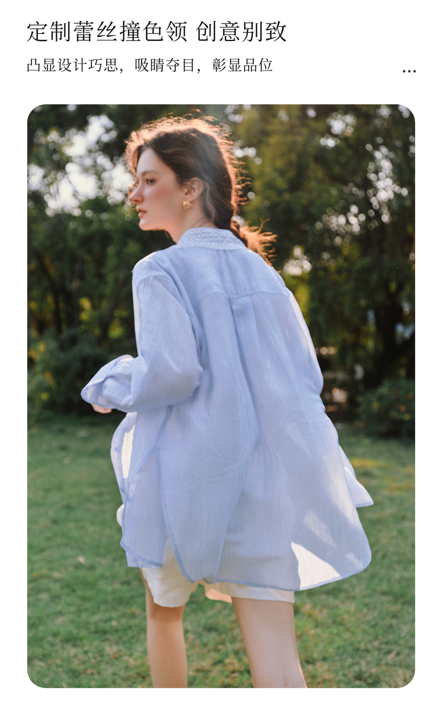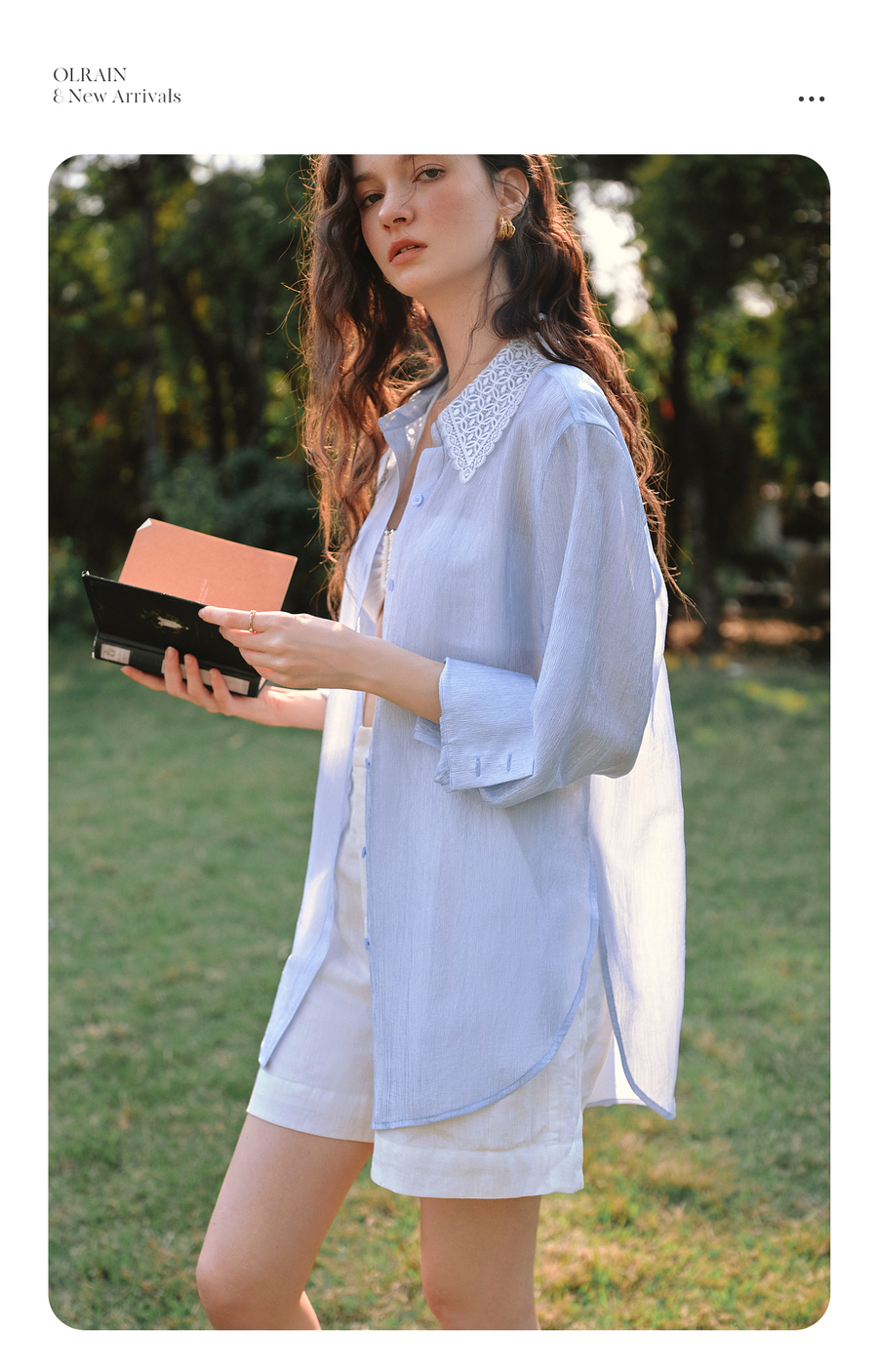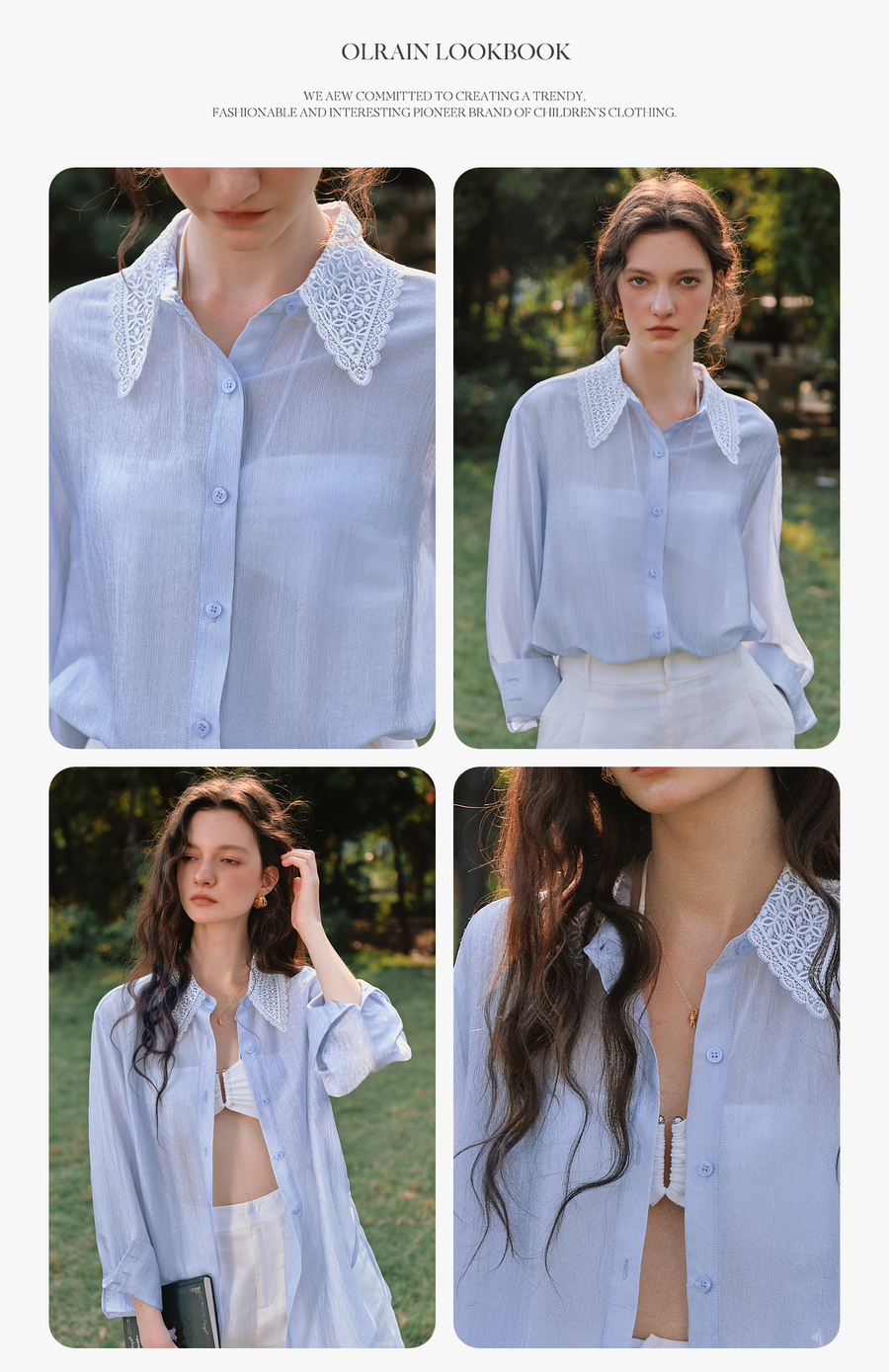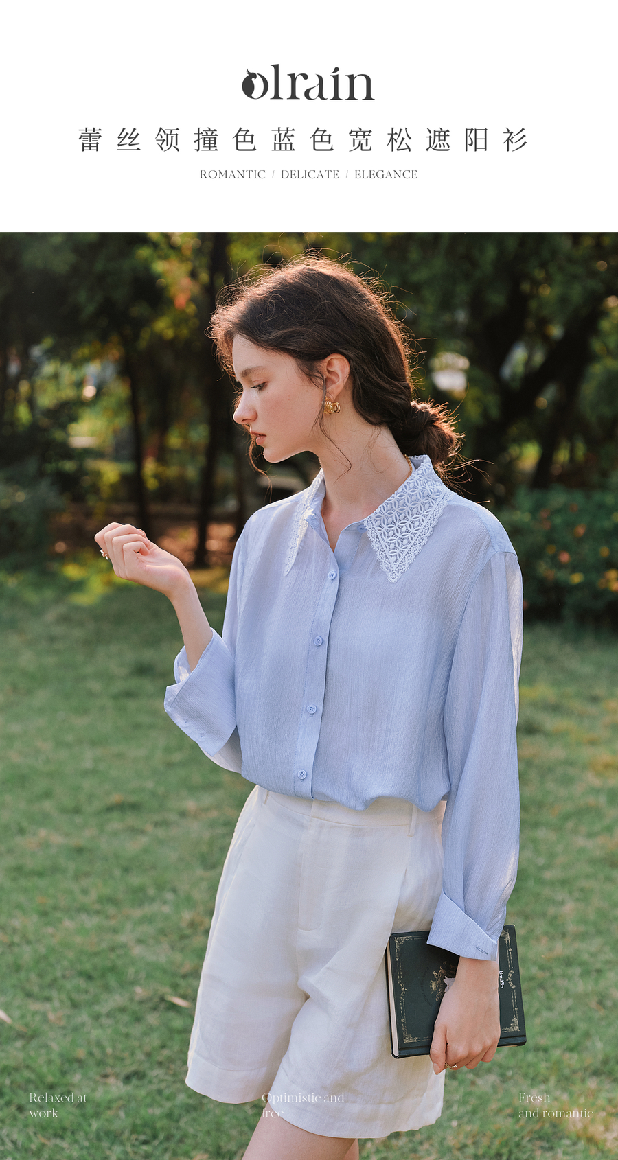 OLrain欧芮儿蕾丝领撞色蓝色宽松衬衫女夏季2025新款慵懒长袖上衣