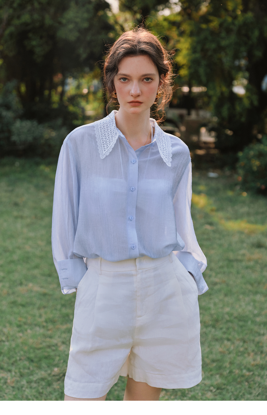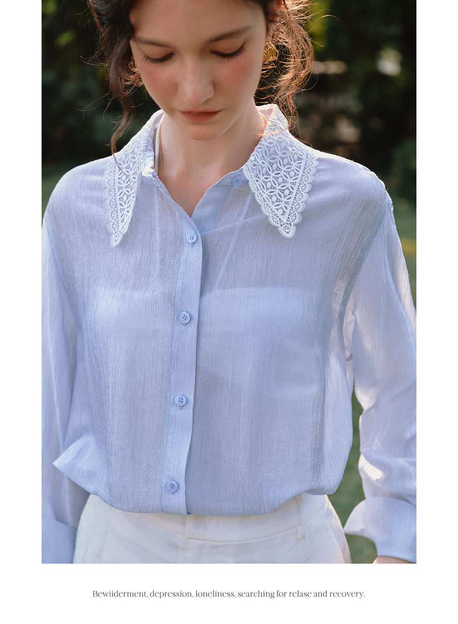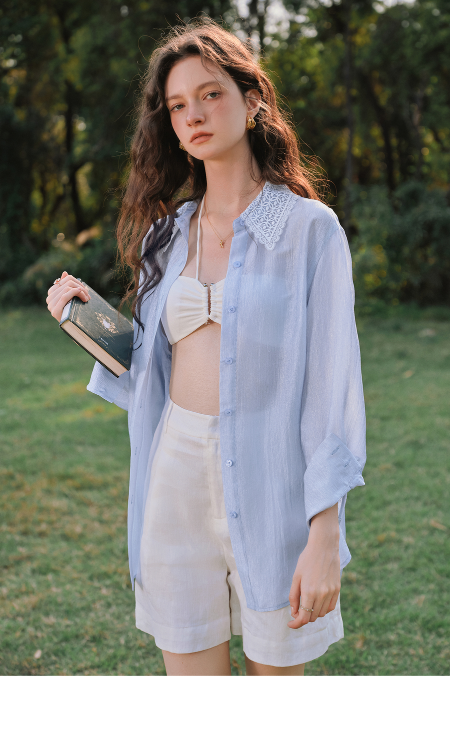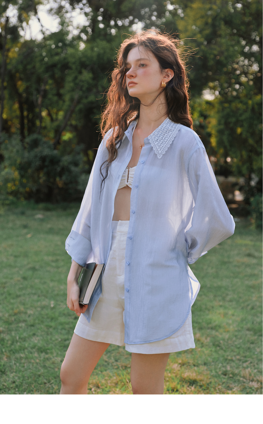 OLrain欧芮儿蕾丝领撞色蓝色宽松衬衫女夏季2025新款慵懒长袖上衣