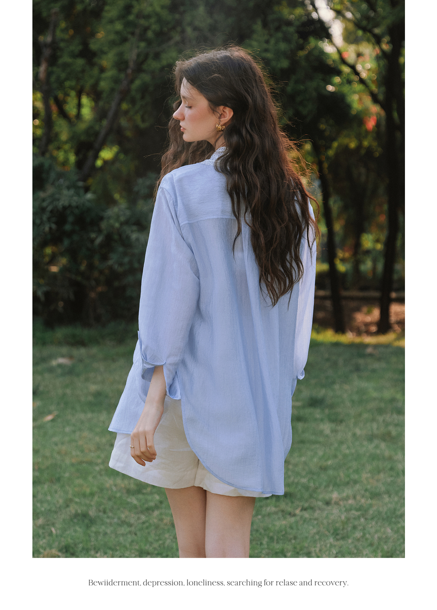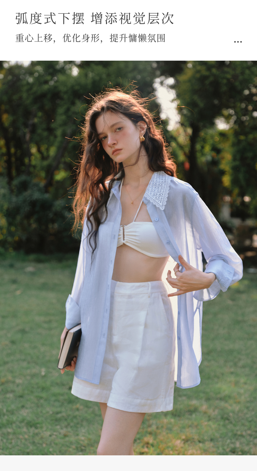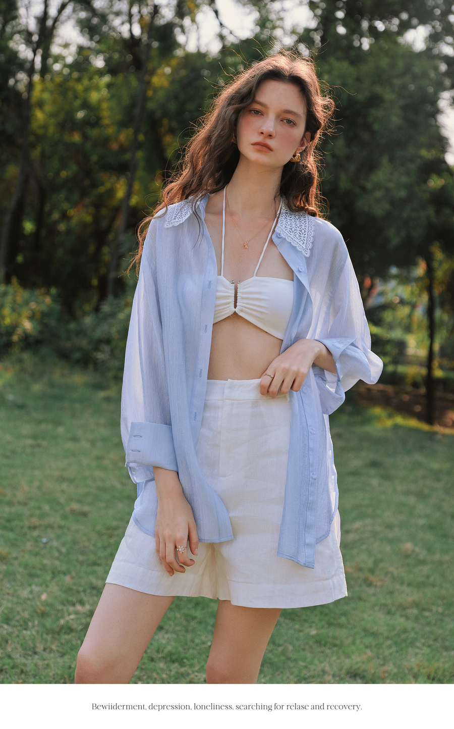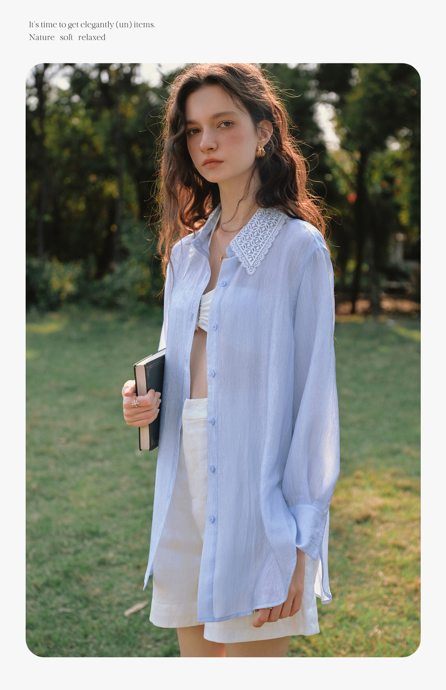 OLrain欧芮儿蕾丝领撞色蓝色宽松衬衫女夏季2025新款慵懒长袖上衣