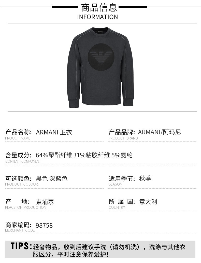 阿玛尼(EMPORIO ARMANI)男装 运动简约舒适字母印花logo男士长袖卫衣 98758