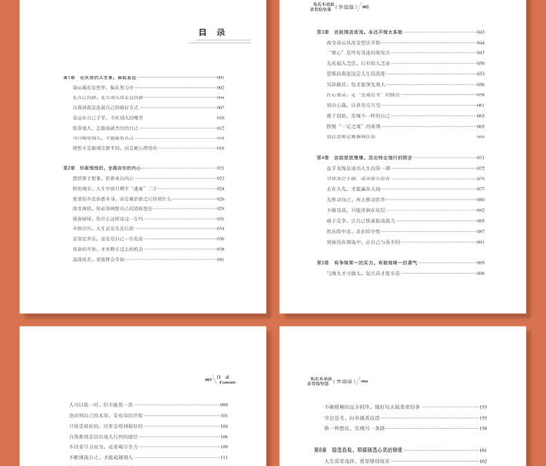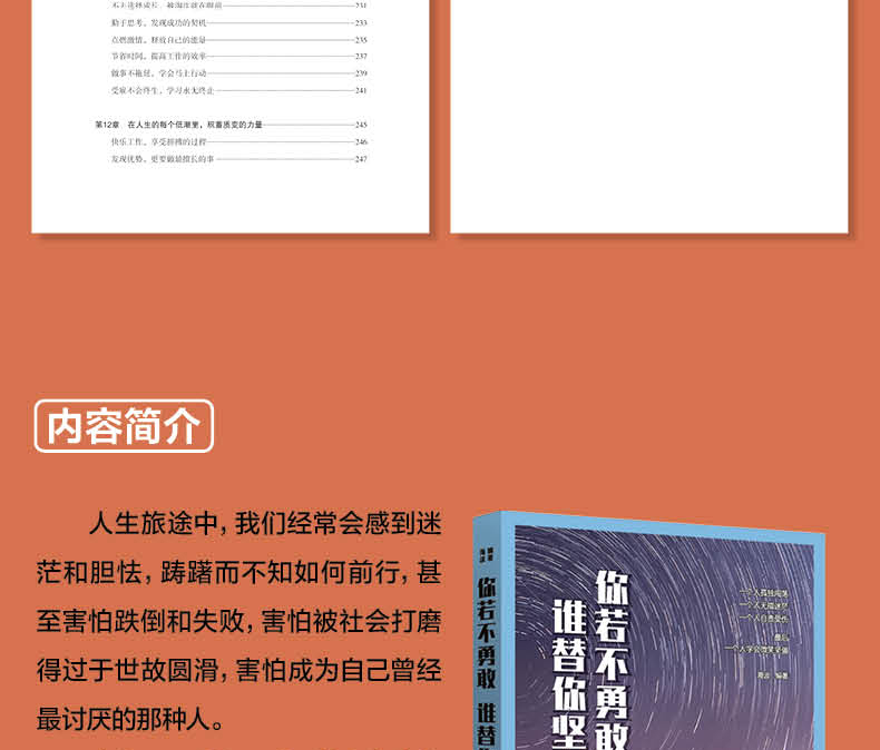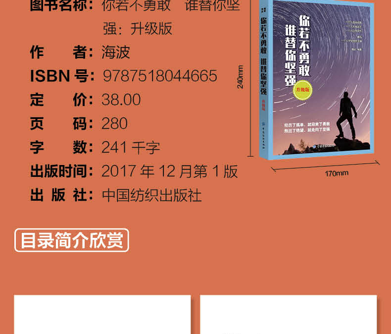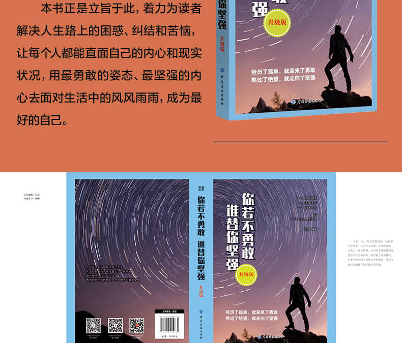 《你若不勇敢 谁替你坚强 升级版》正是立旨于此,着力为读者解决人生路上的困惑、纠结和苦恼,让每个人都能直面自己的内心和现实状况,用*勇敢的姿态、*坚强的内心去面对生活中的风风雨雨,成为*好的自己。
