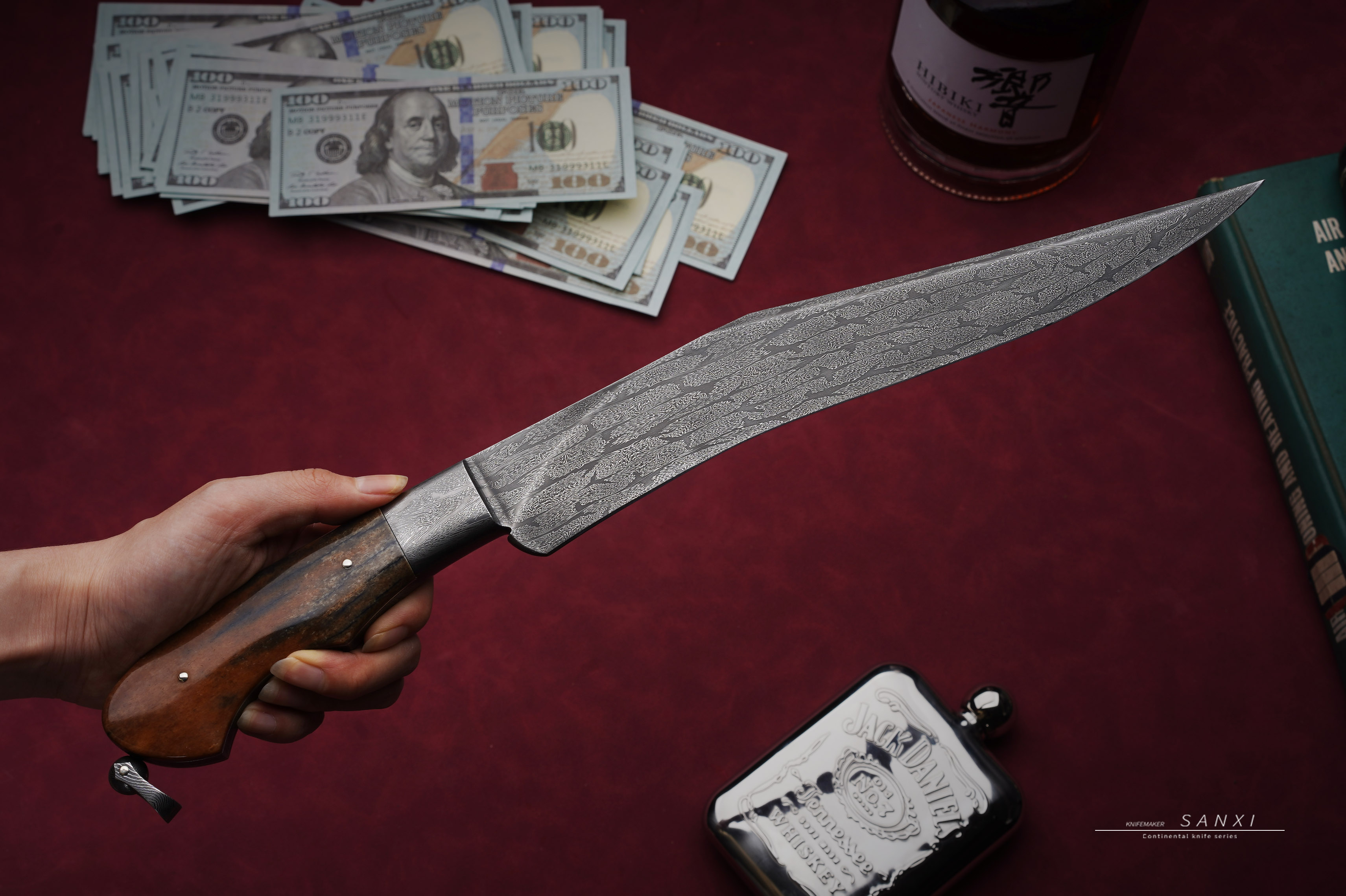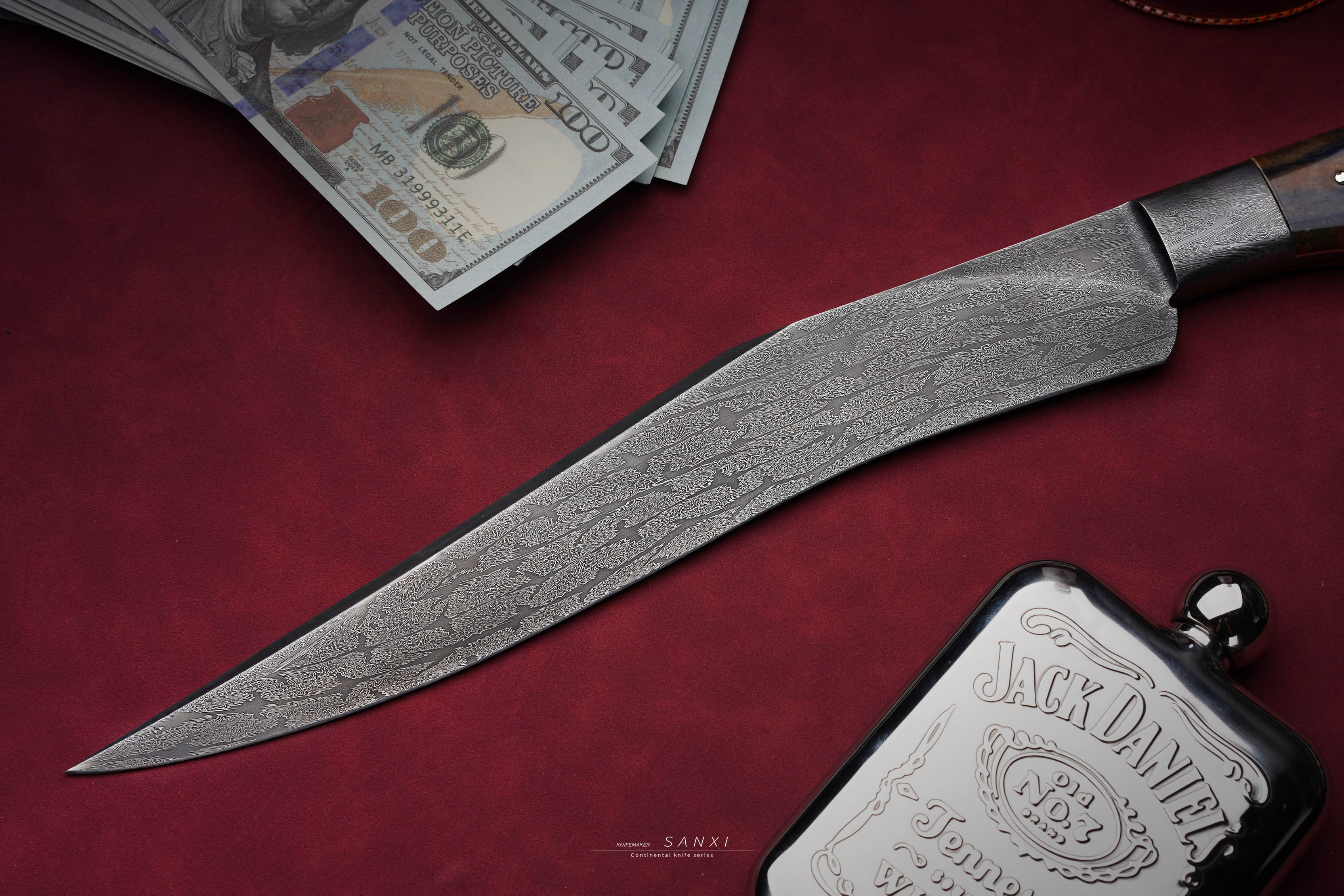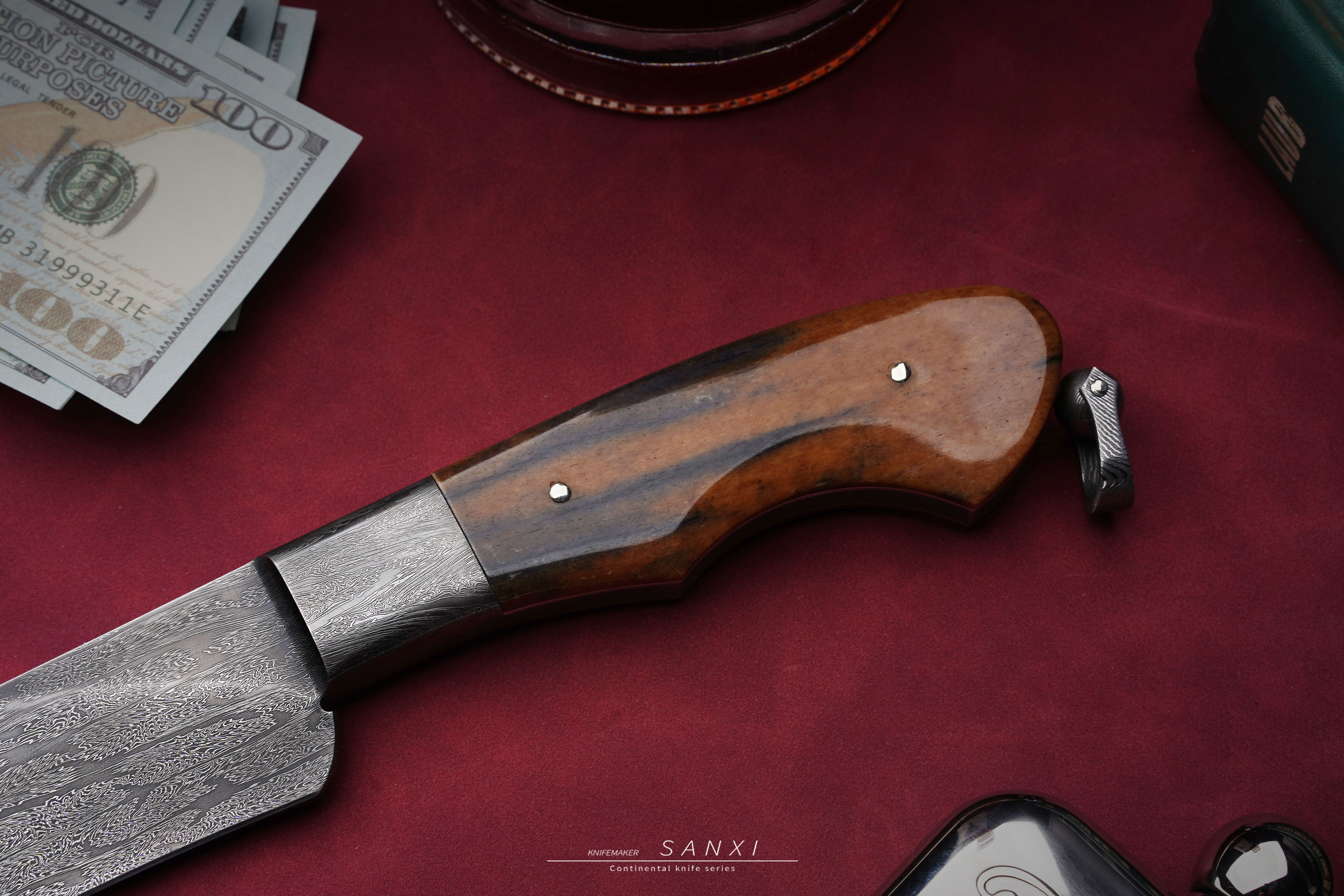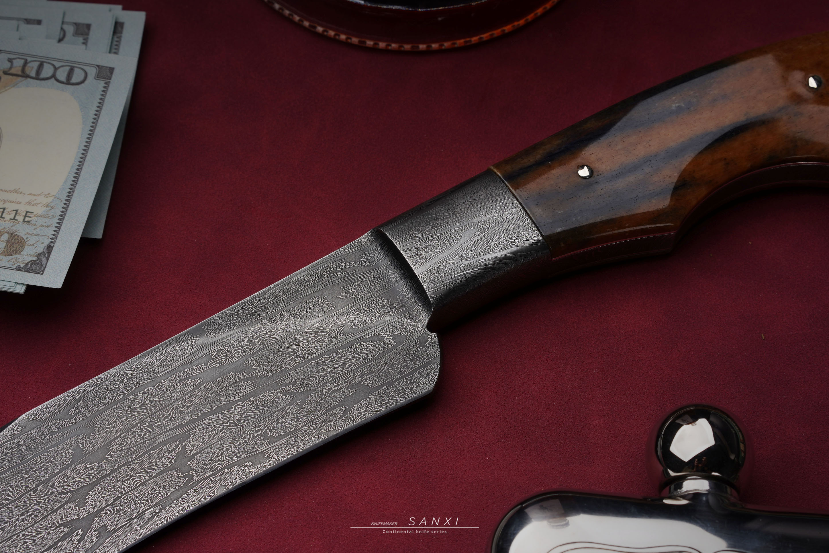 高工师傅制作,手工味道正,折叠锻打一体博弈,护手和刀条是一体的,非常考验锻打的水平,复杂拼接大马花纹,用了两块玉化猛马