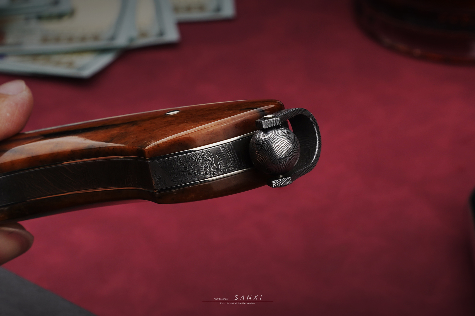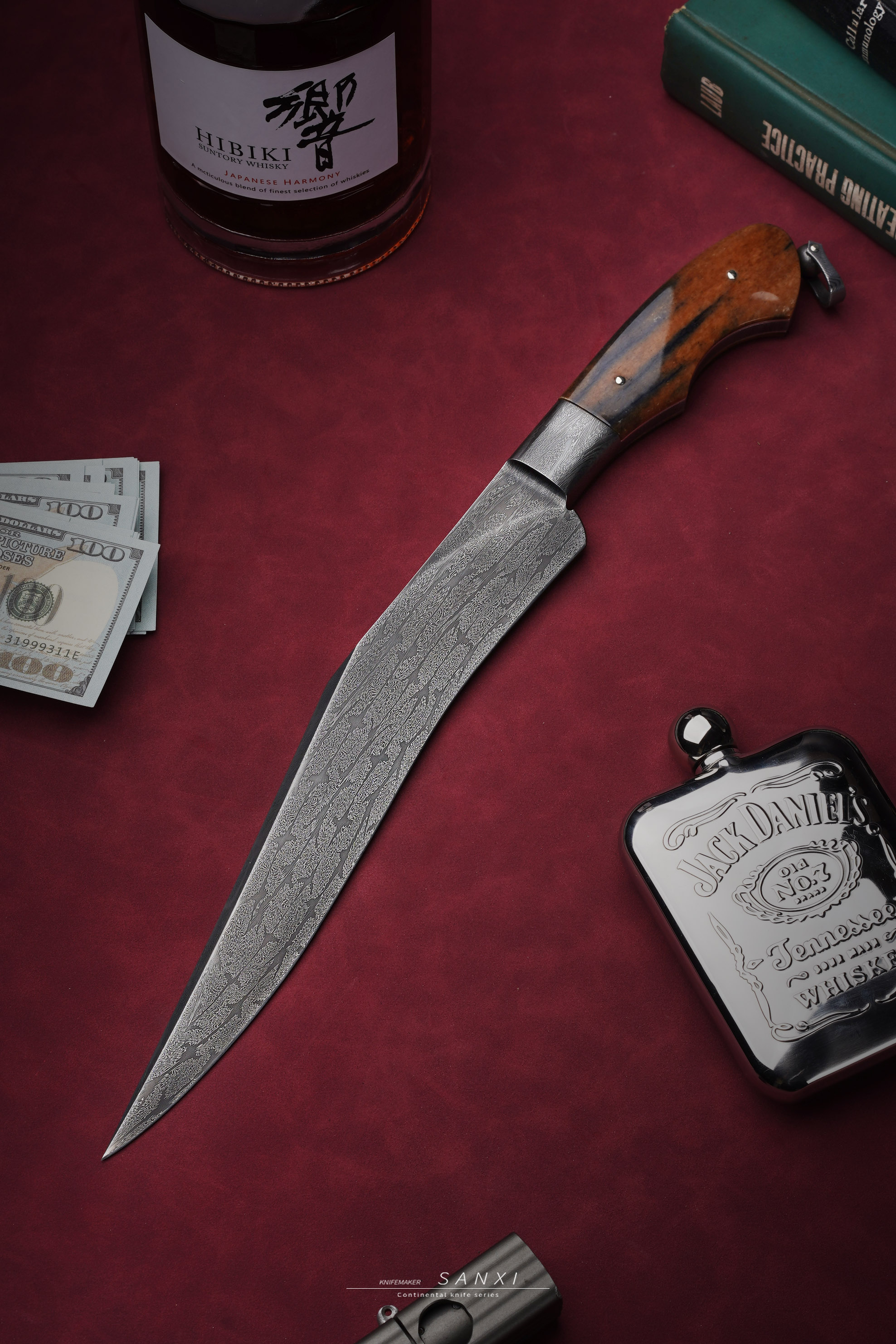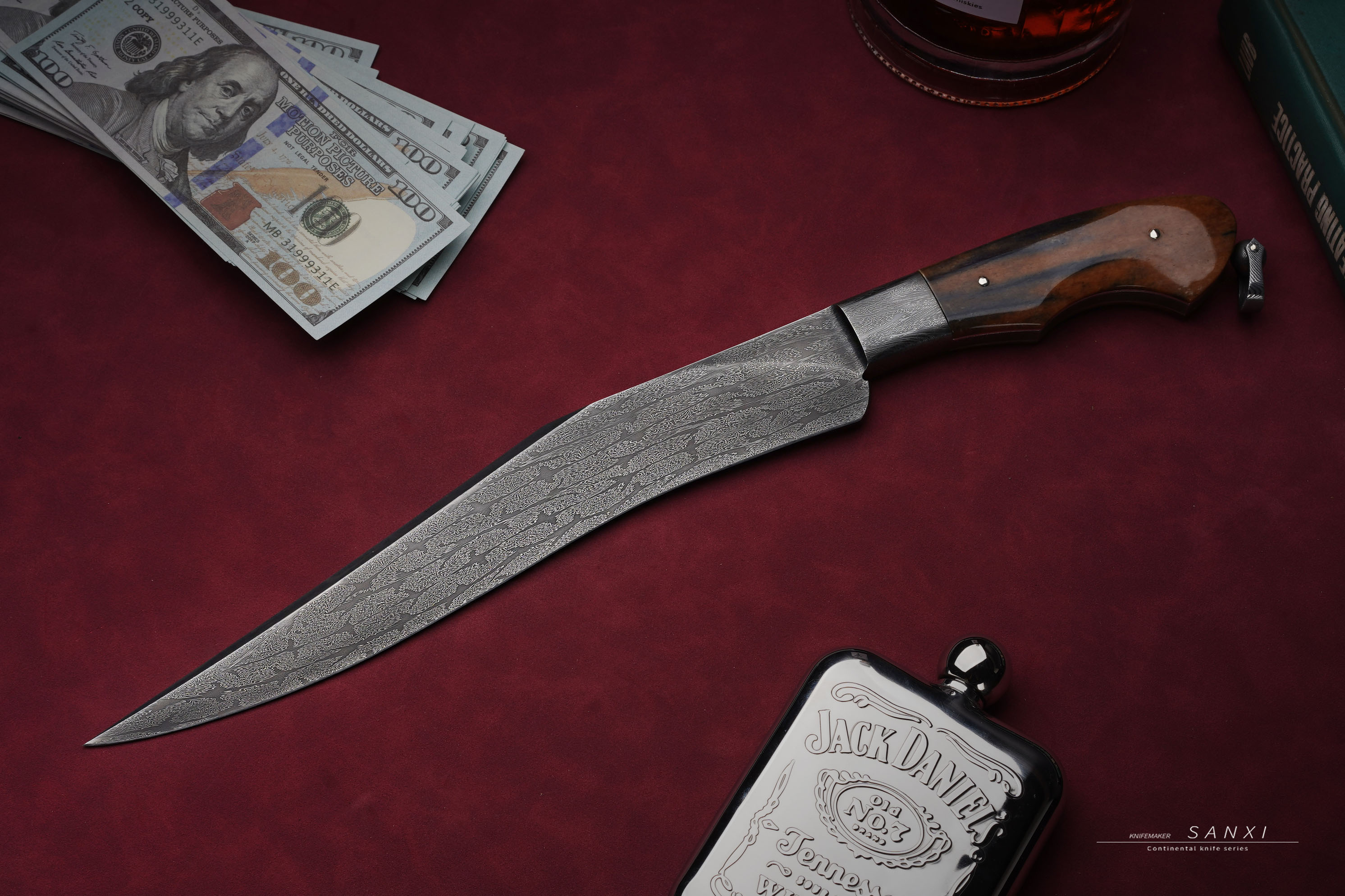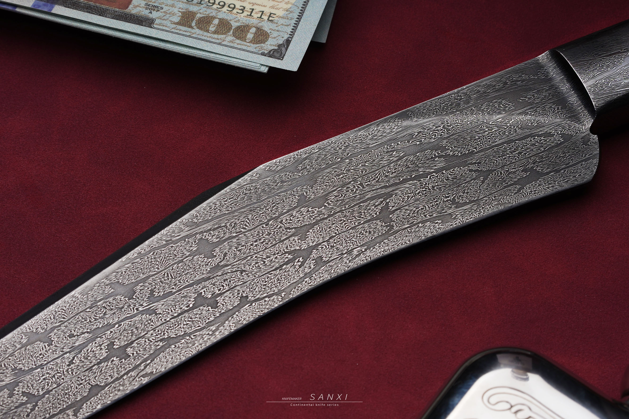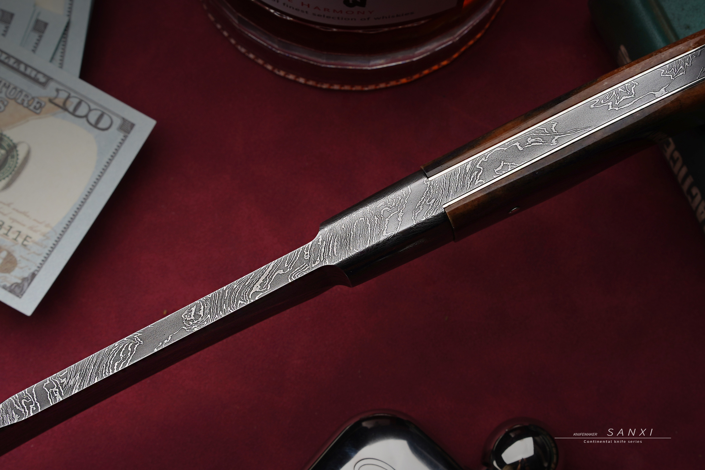 高工师傅制作,手工味道正,折叠锻打一体博弈,护手和刀条是一体的,非常考验锻打的水平,复杂拼接大马花纹,用了两块玉化猛马