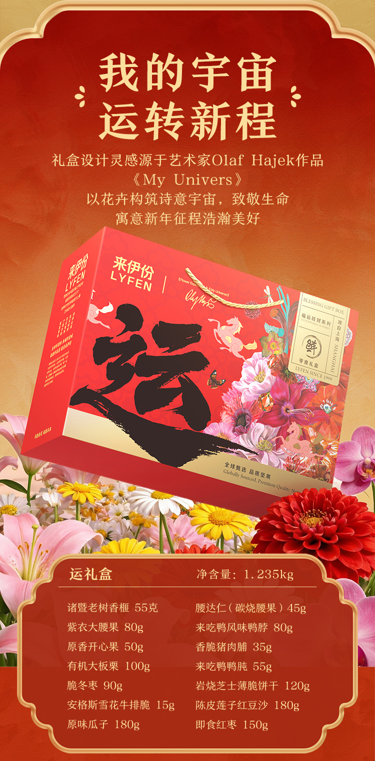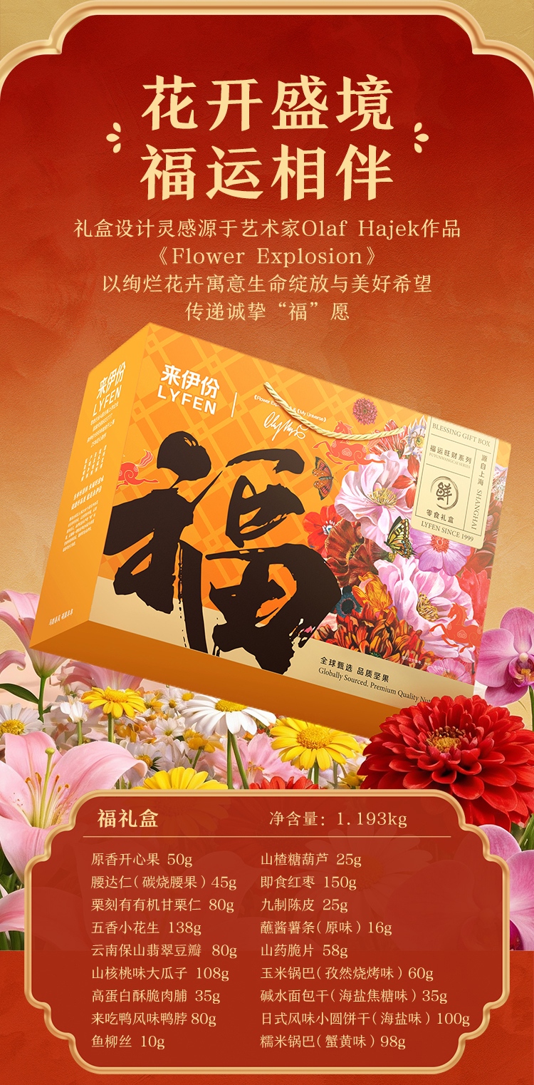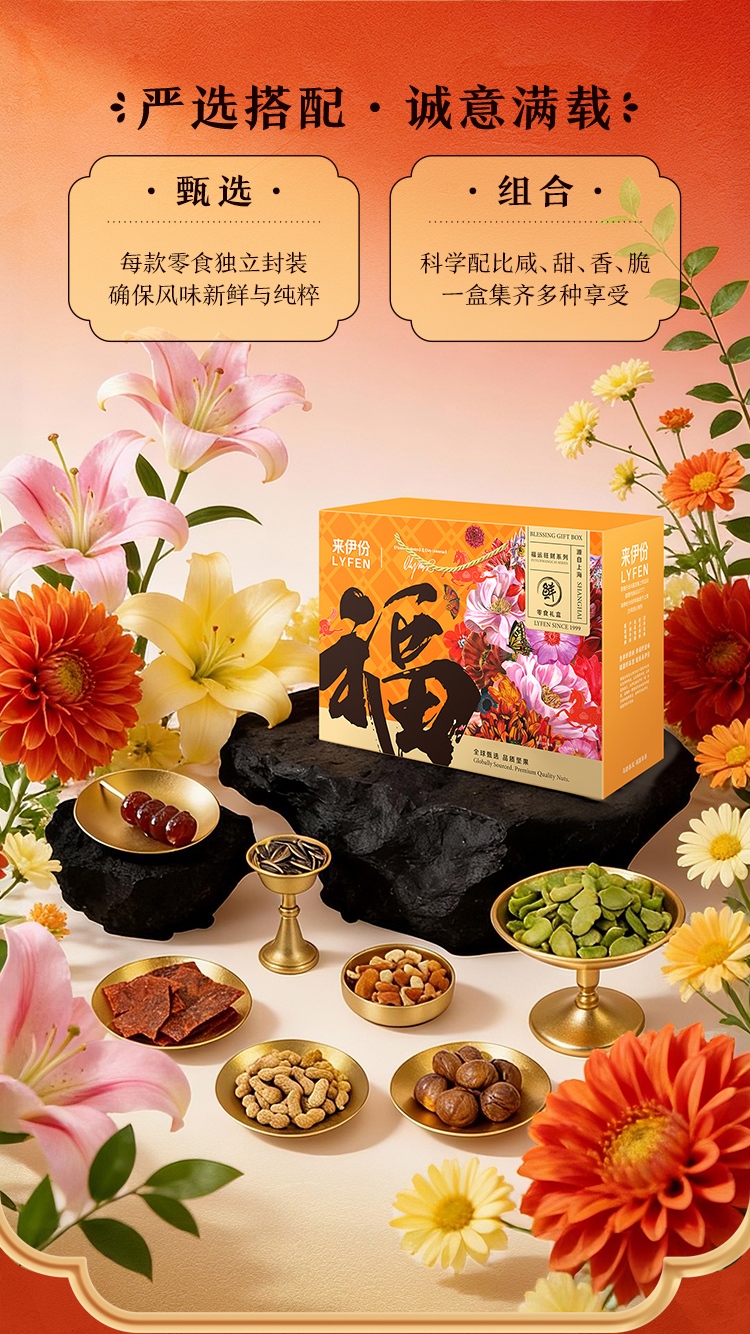 【来伊份 福运零食礼盒】 红金艺术礼盒+马年专属设计 坚果肉脯果干全cover 从脆到糯从咸到甜
