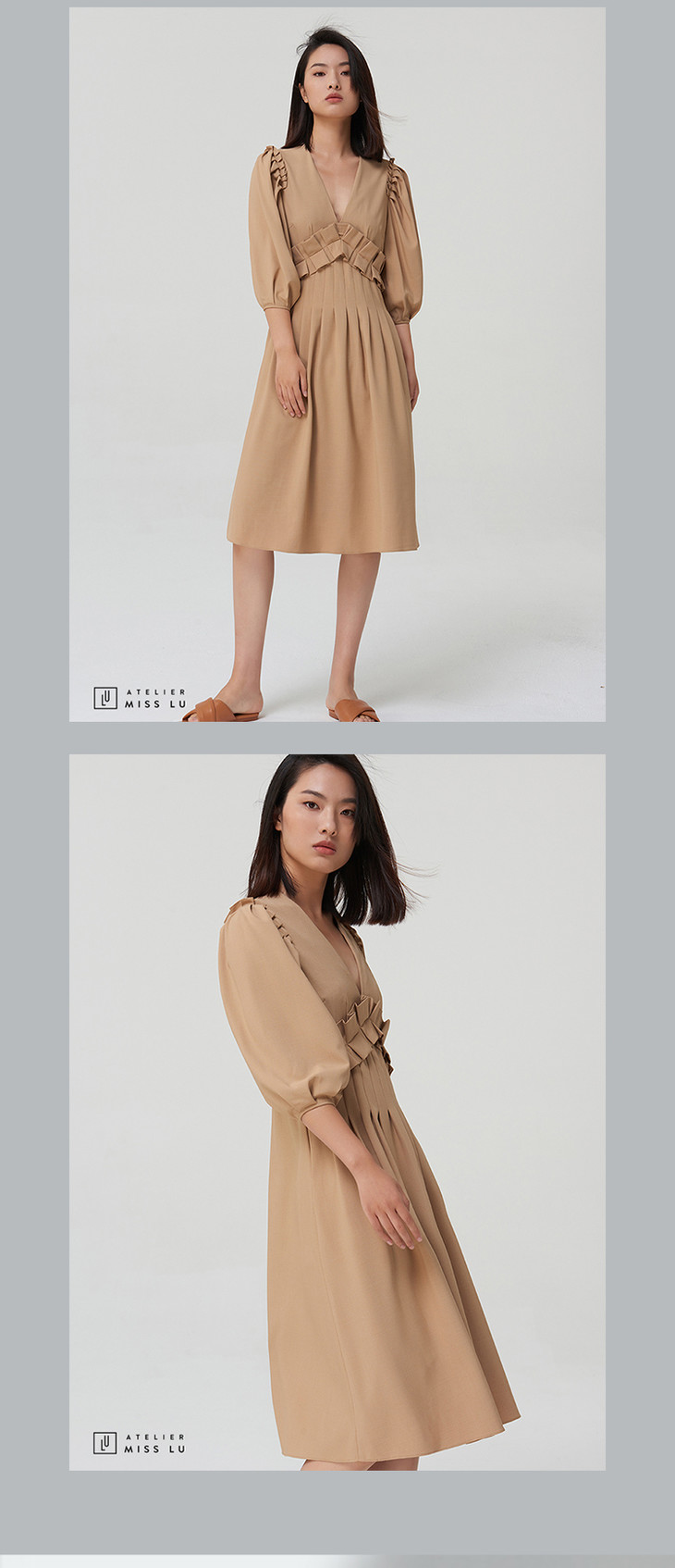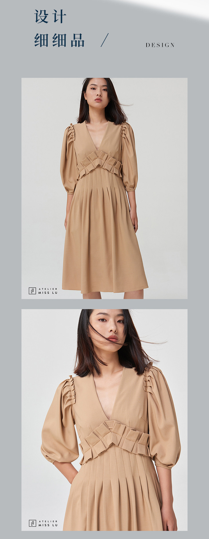 【宝藏ONE PIECE】浅驼压褶V领设计感连衣裙
