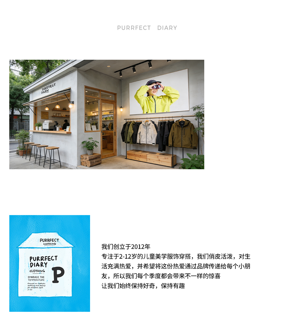 - Purrfect-Diary专注于贴近自然随性的穿着概念,轻奢平价的童装文化传播,在产品设计上更加注重婴童穿着的舒适性、安全性、更出众的国际化品牌,将欧美的育婴文化在中国进行深入的传播与推广。