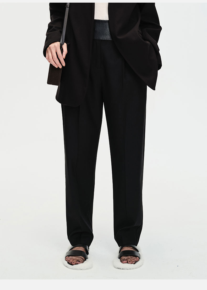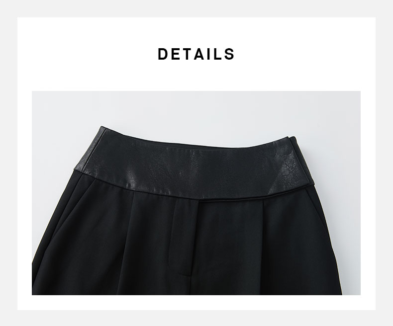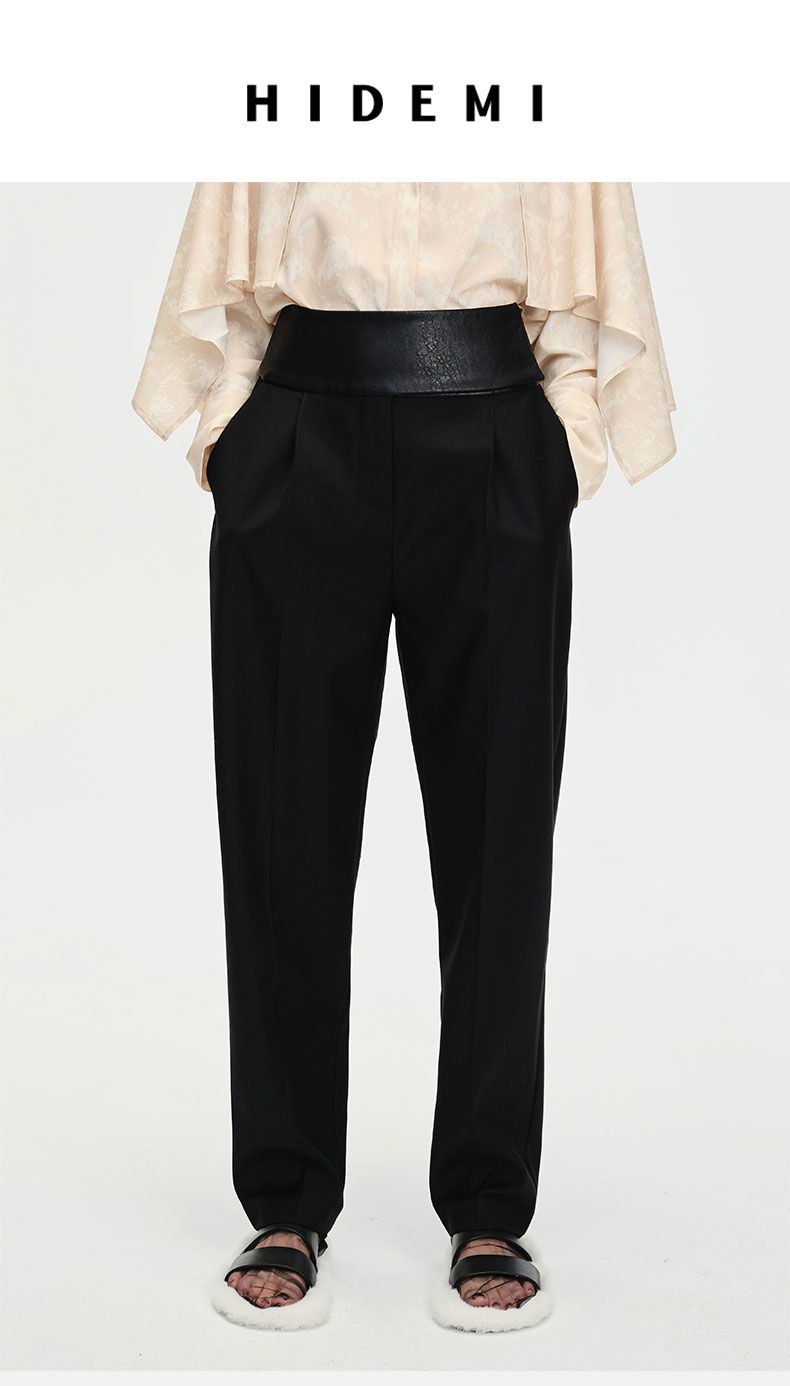 HIDEMI⿊⾊简约显瘦拼⽪⾼腰微锥形裤