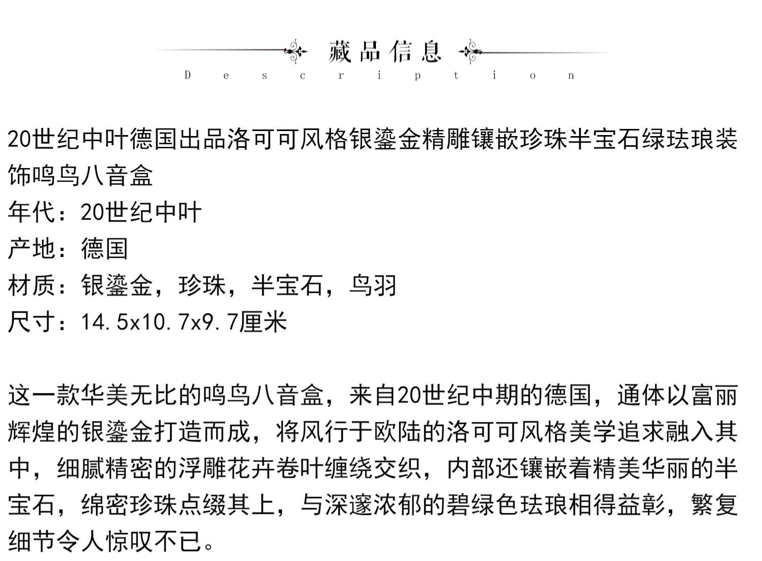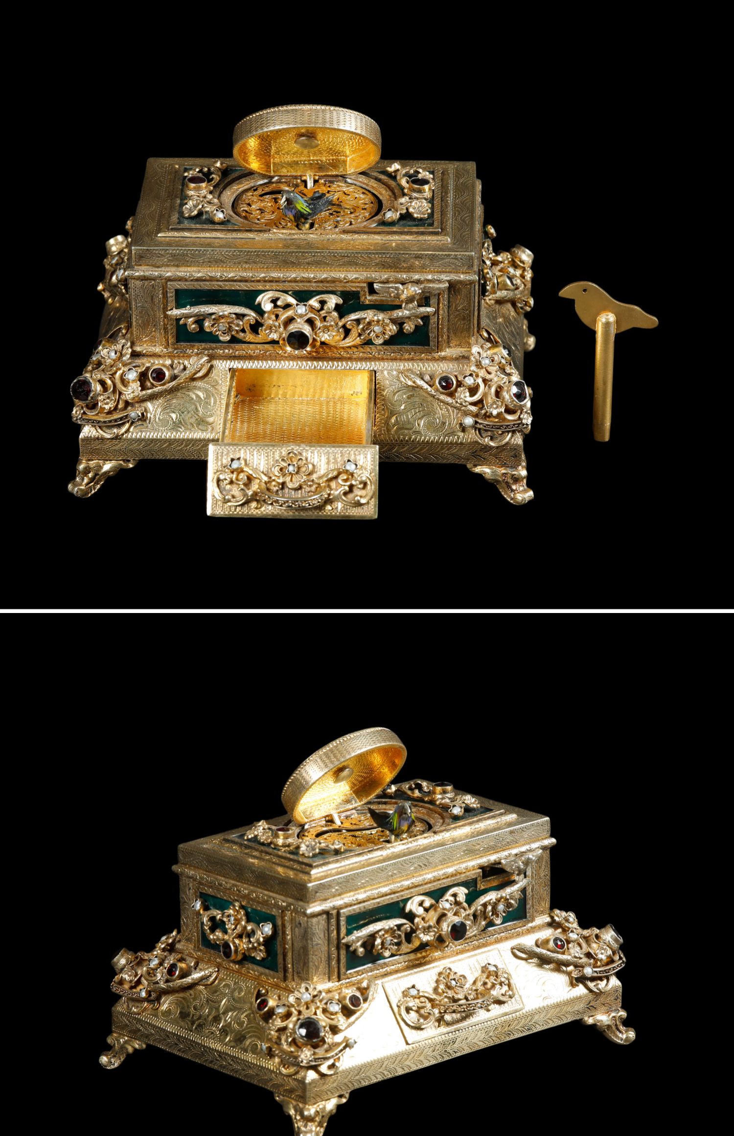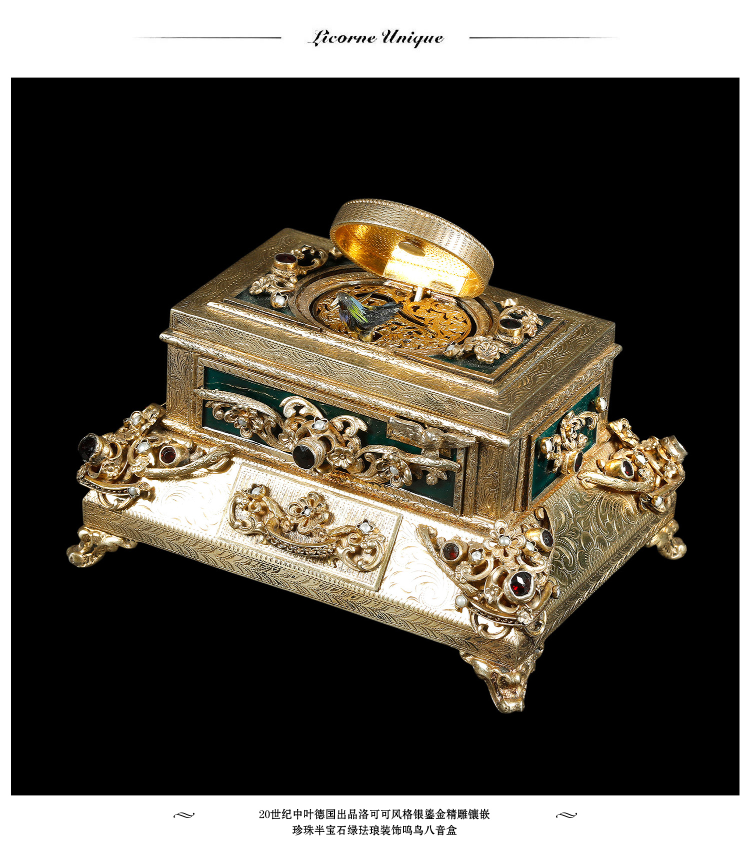 独角鹿西洋古董洛可可风格银鎏金镶珍珠半宝石绿珐琅鸣鸟八音盒