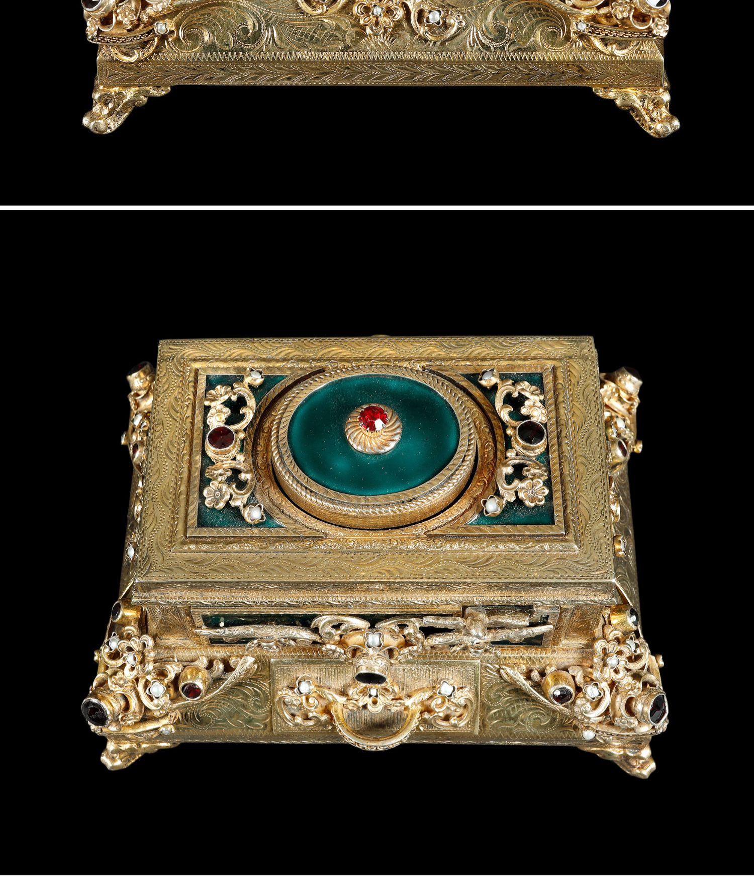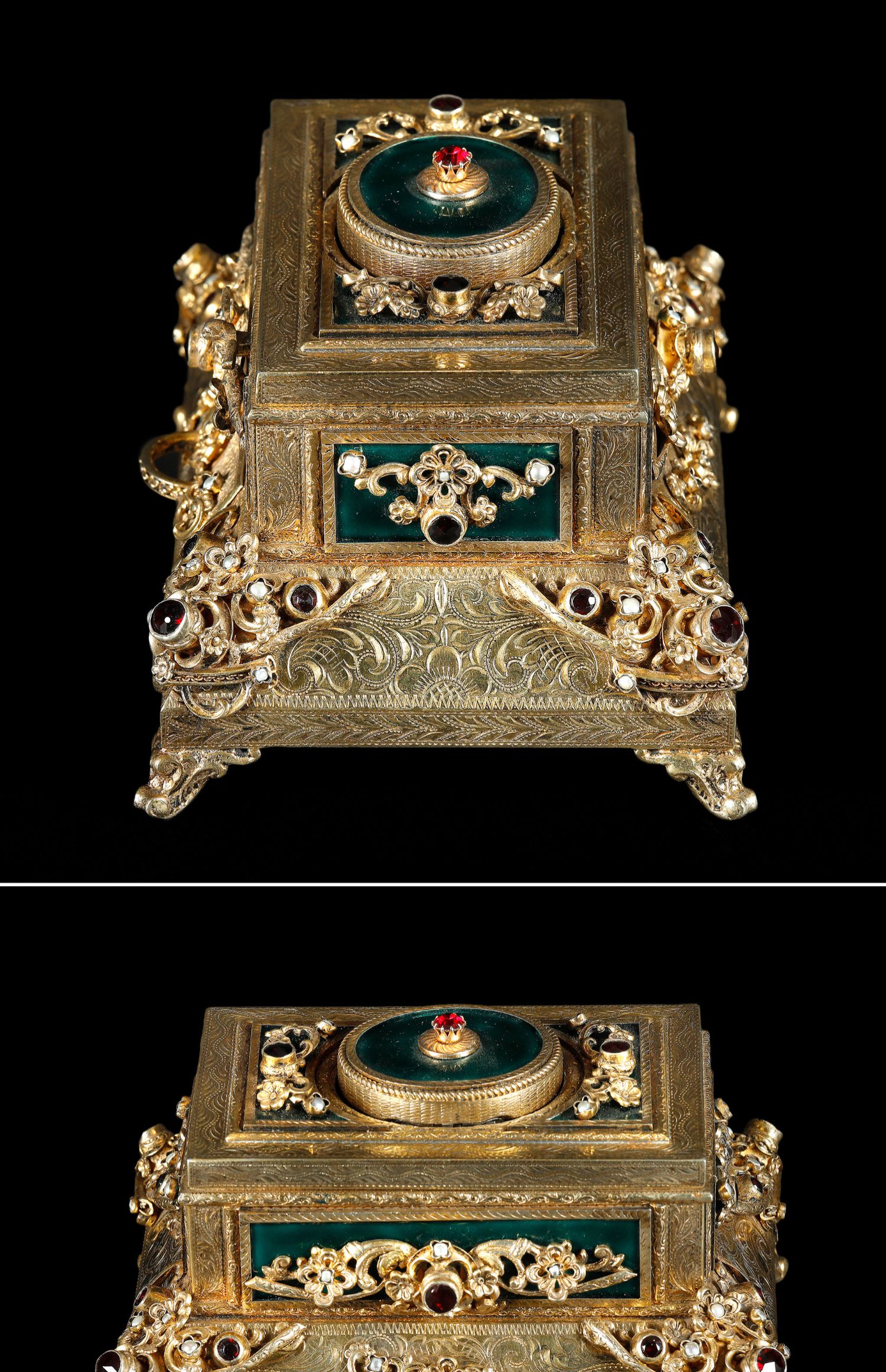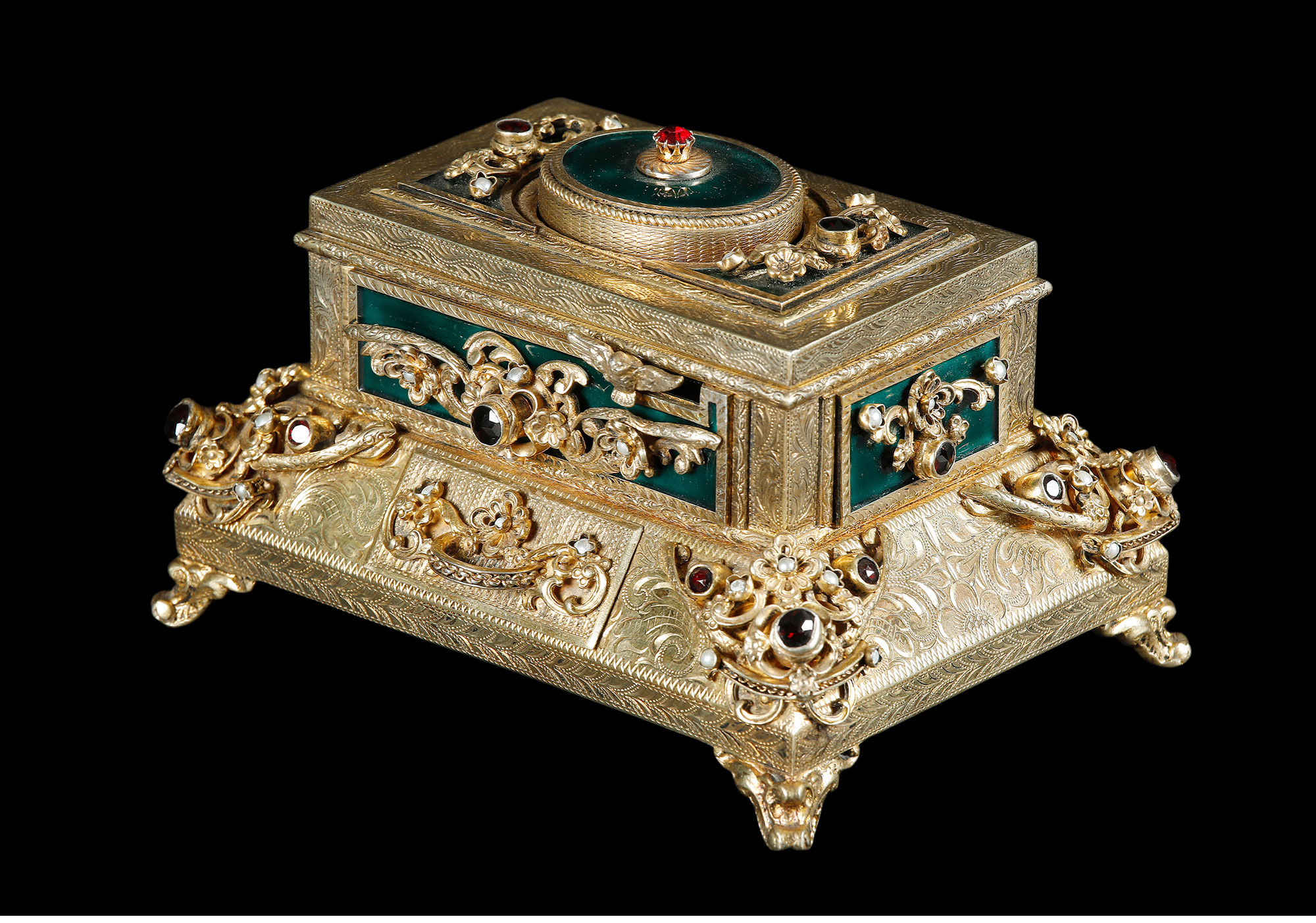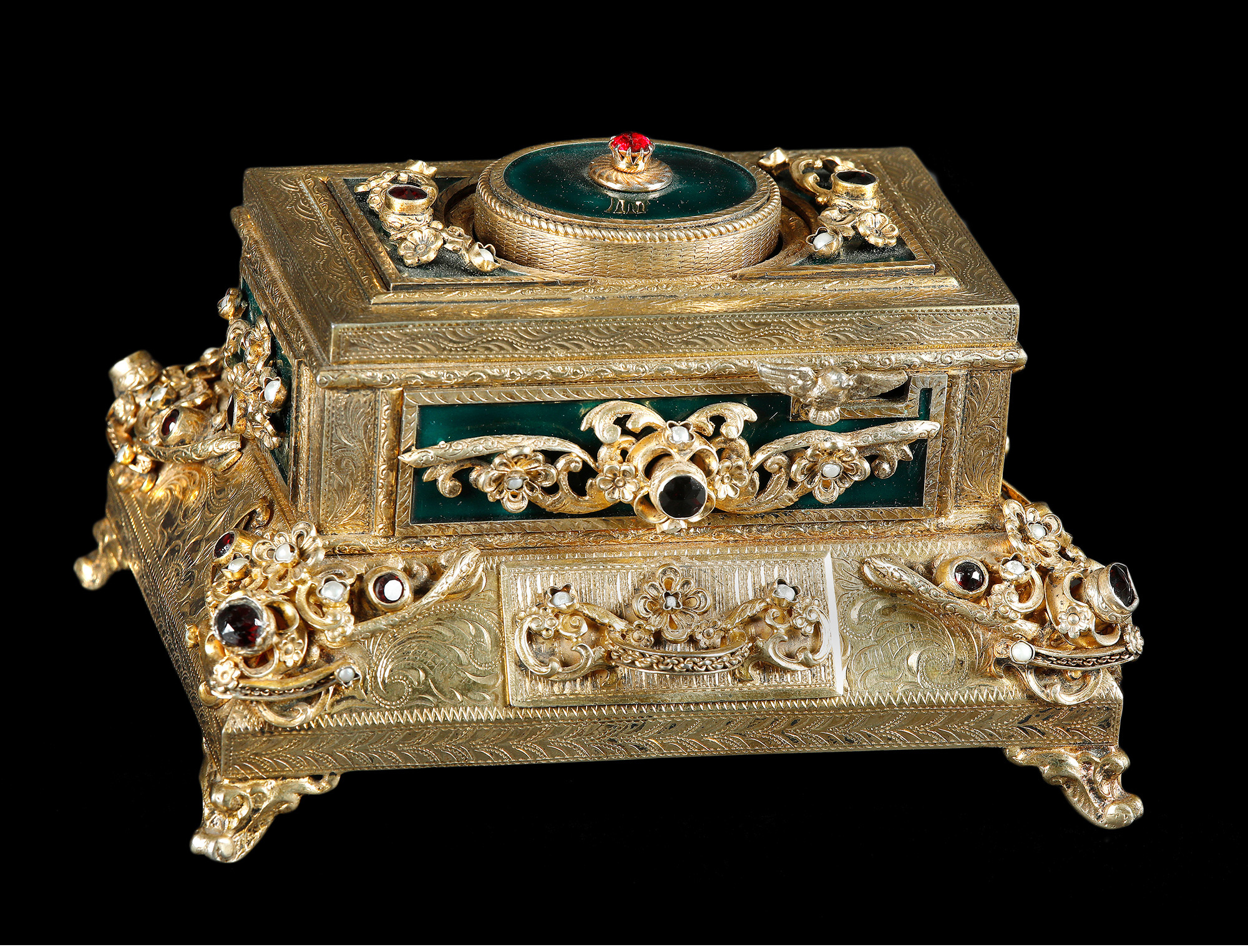 独角鹿西洋古董洛可可风格银鎏金镶珍珠半宝石绿珐琅鸣鸟八音盒