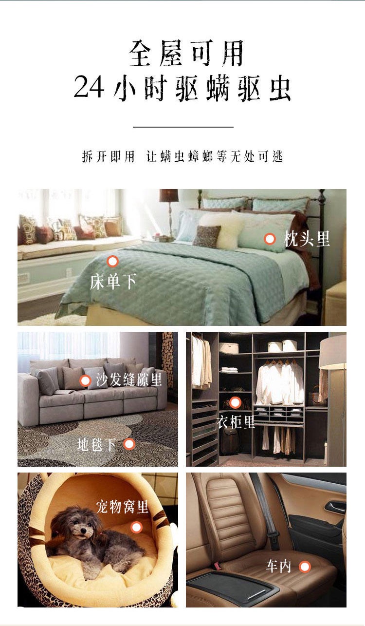 2、将产品平放于螨虫、蟑螂等容易滋生的地方,比如床单下、地毯下、衣柜内