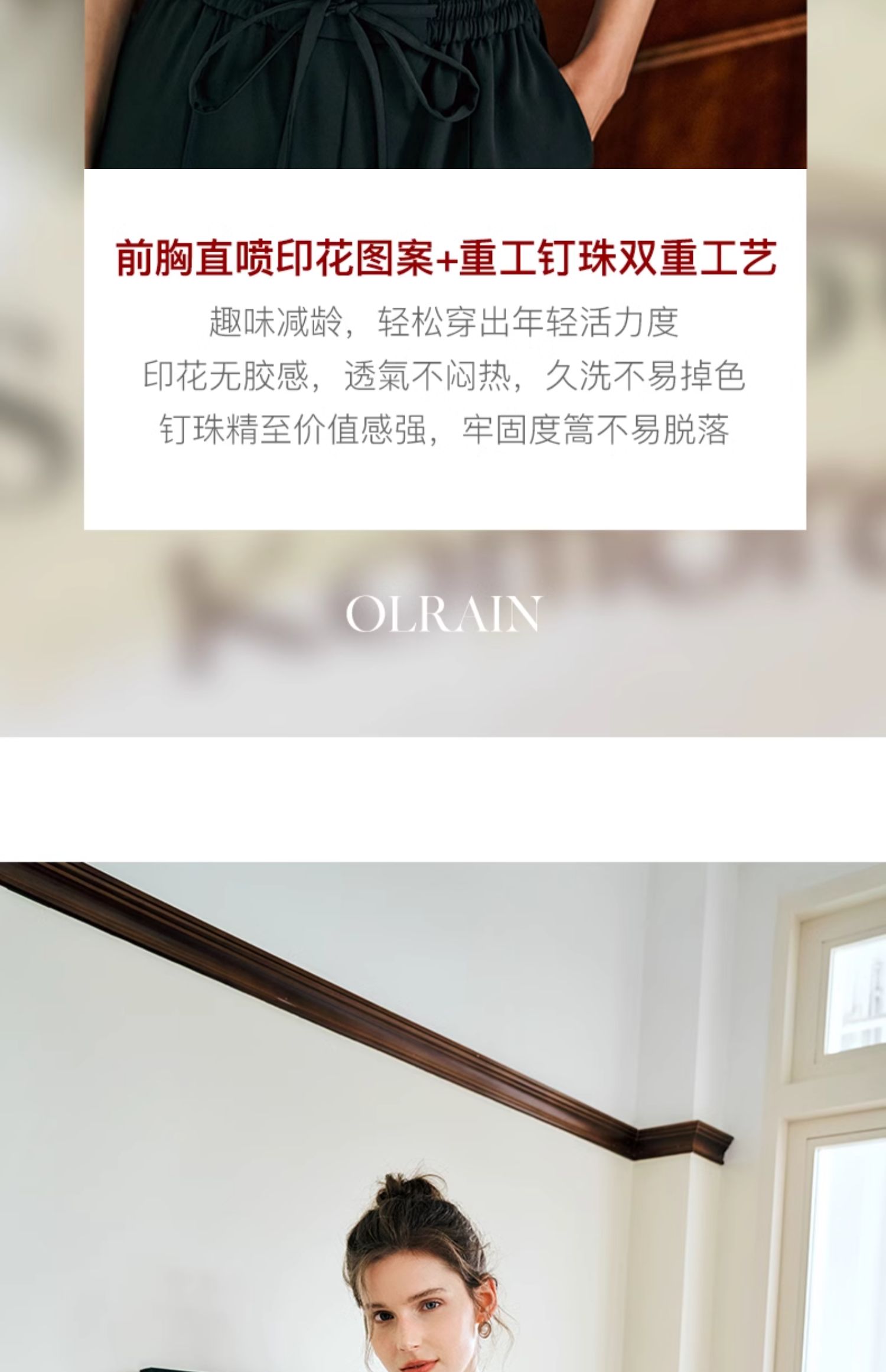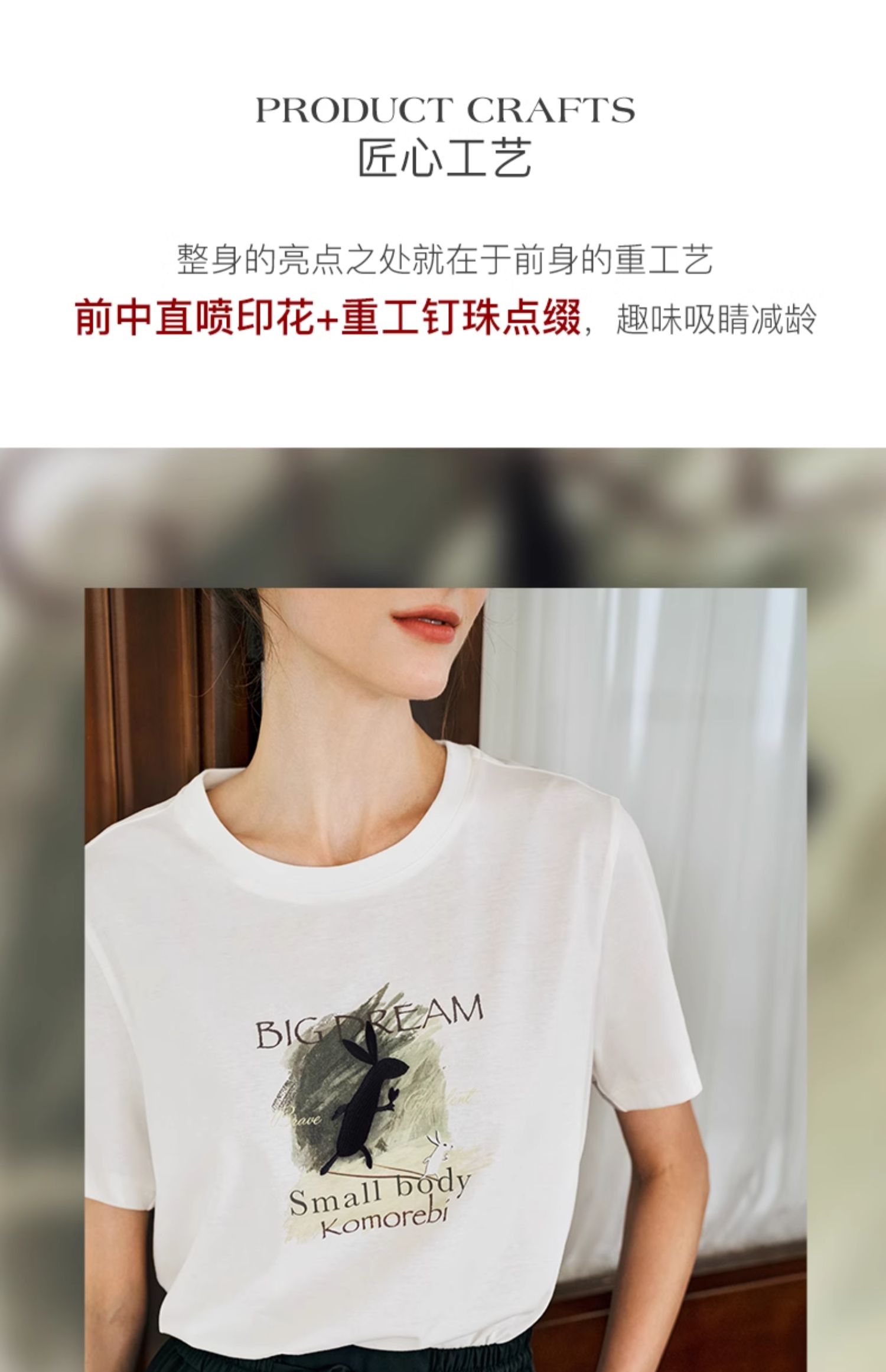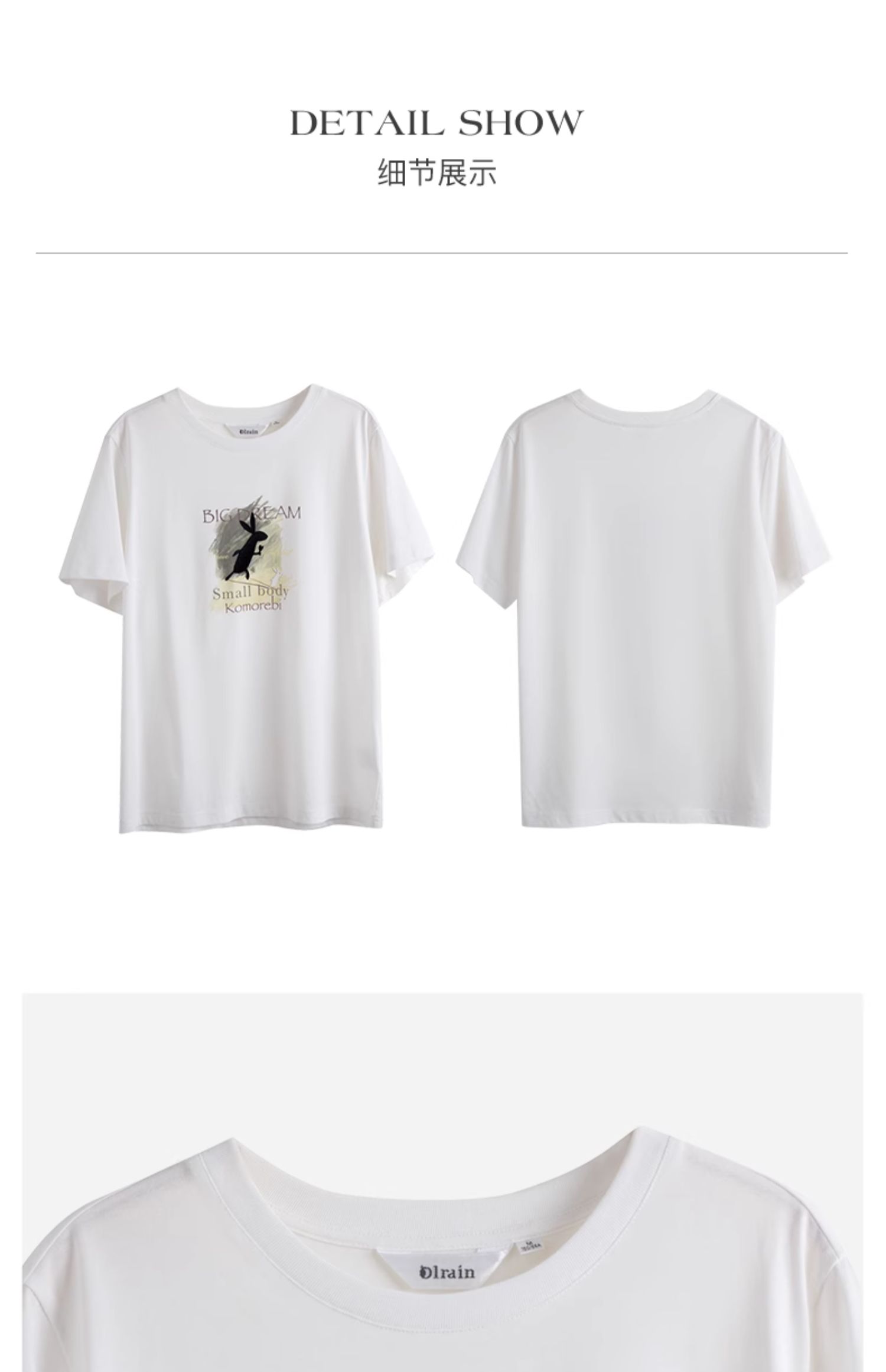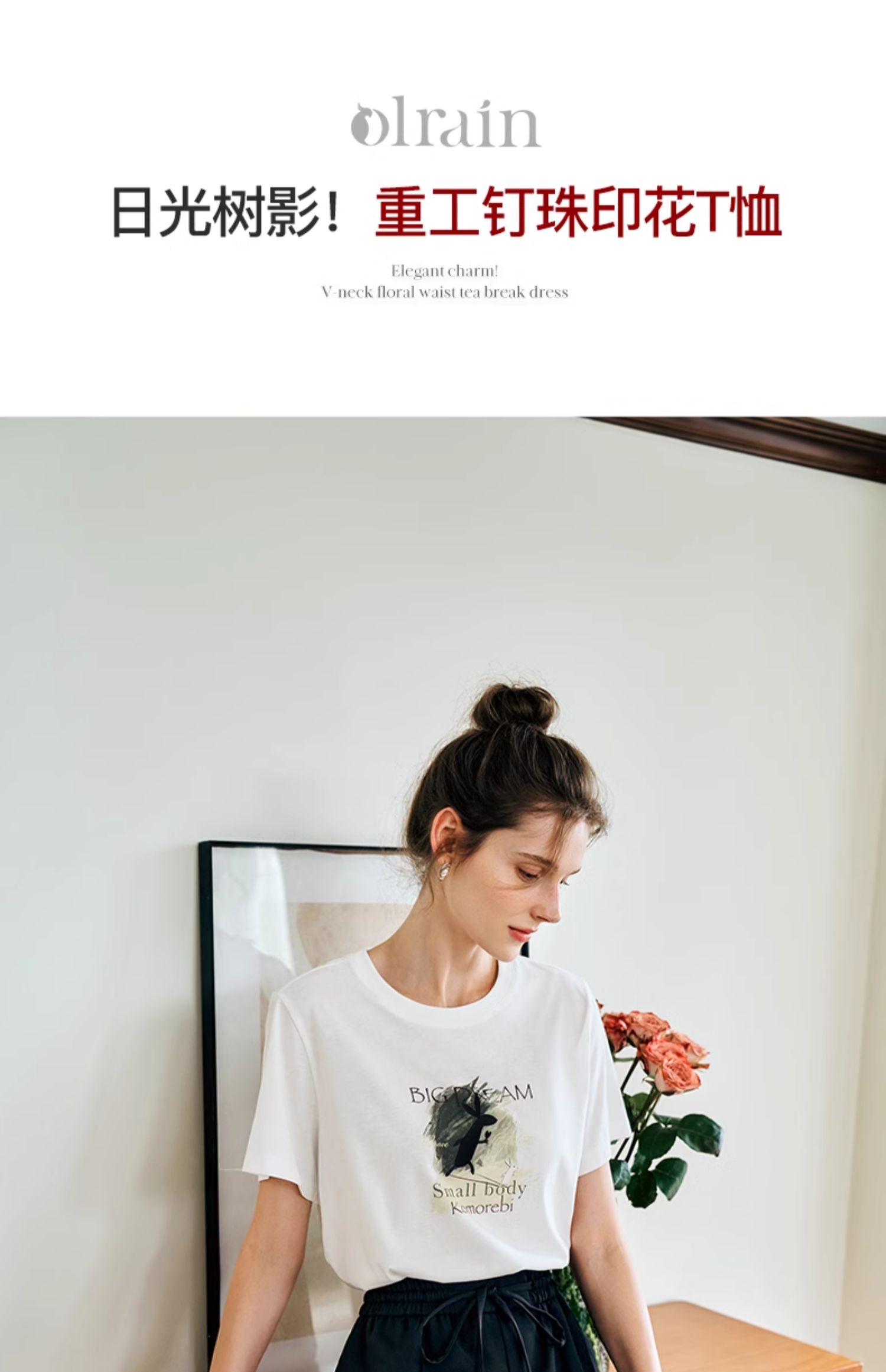 OLrain欧芮儿法式白色短袖T恤女夏2024新款钉珠印花圆领正肩上衣