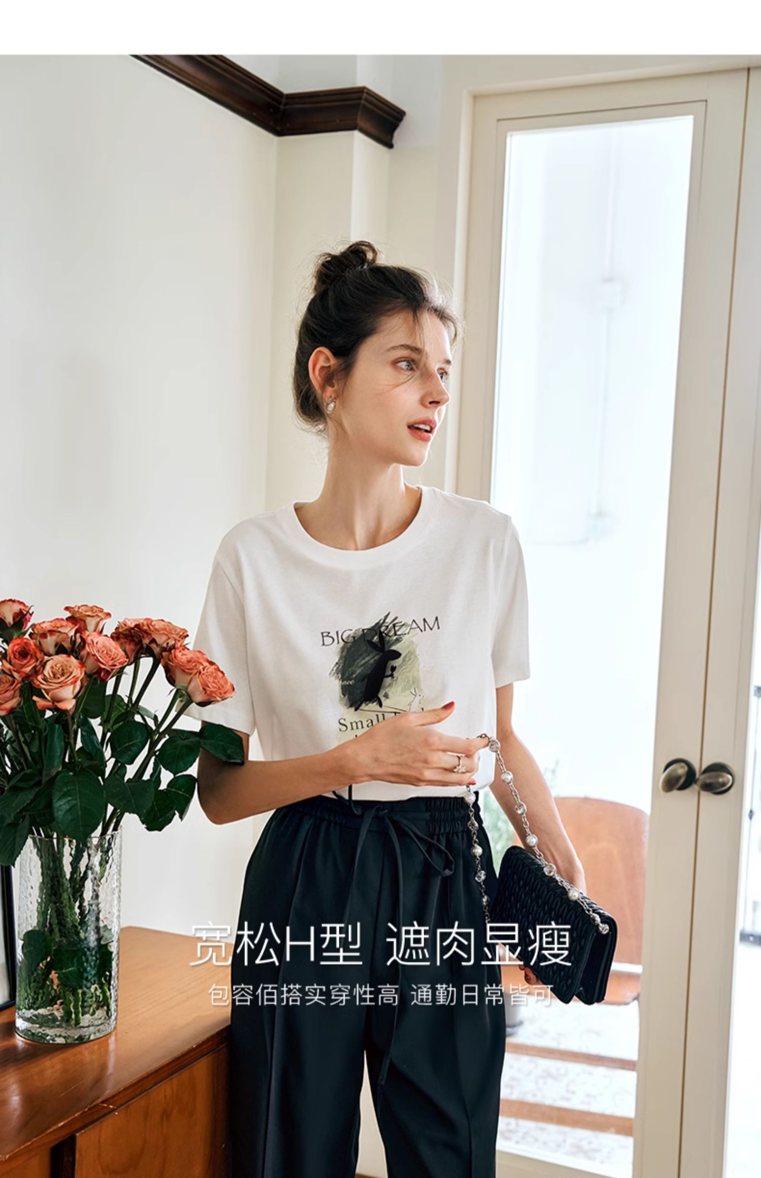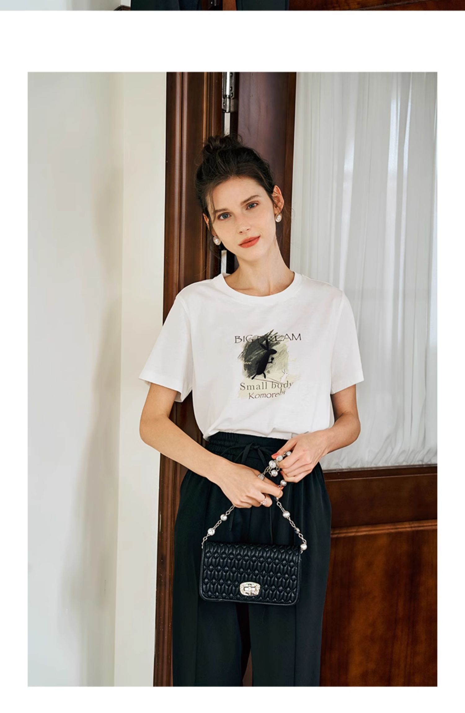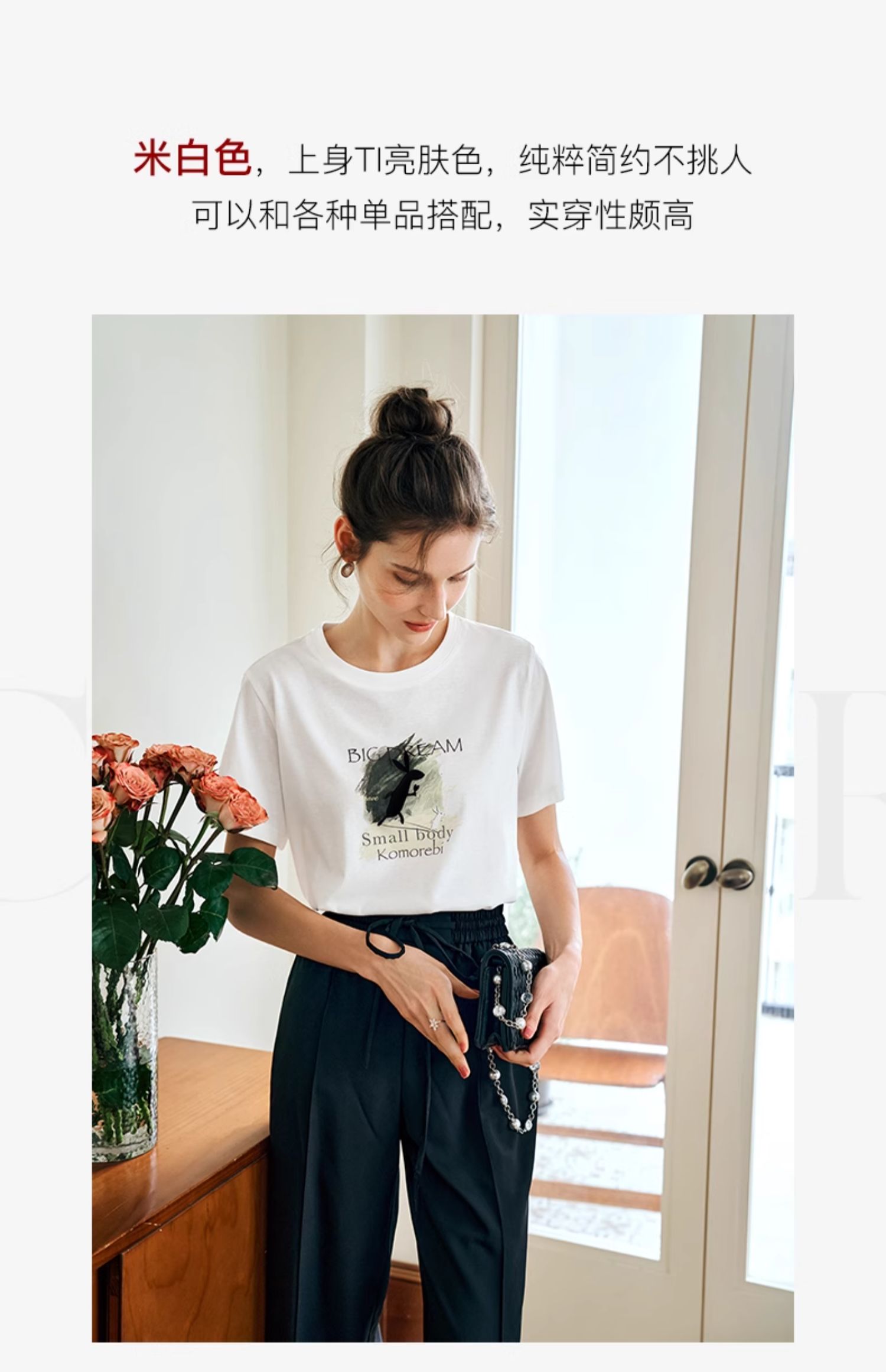 OLrain欧芮儿法式白色短袖T恤女夏2024新款钉珠印花圆领正肩上衣