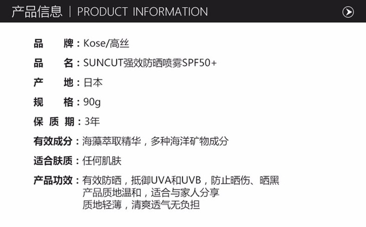 【保税仓】KOSE/高丝 Suncut 防晒喷雾 SPF50 PA+++ 90g