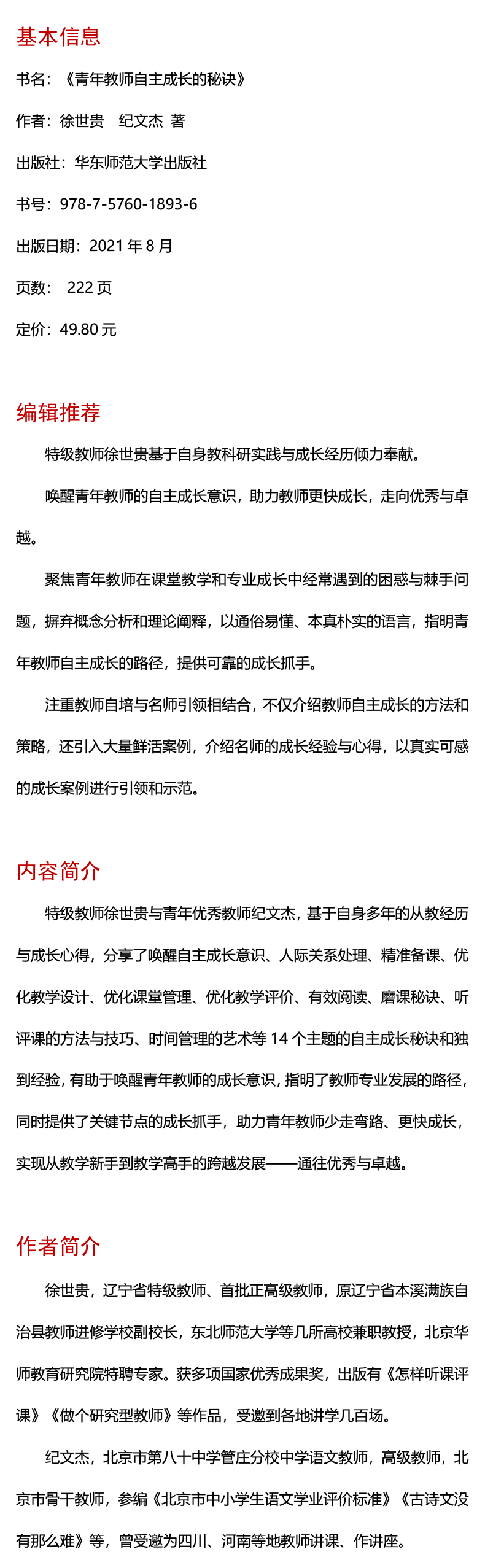 ·特级教师徐世贵基于自身教科研实践与成长经历倾力奉献。·唤醒青年教师的自主成长意识,助力教师更快成长,走向优秀与卓越。·聚焦青年教师在课堂教学和专业成长中经常遇到的困惑与棘手问题,摒弃概念分析和理论阐释,以通俗易懂、本真朴实的语言,指明青年教师自主成长的路径,提供可靠的成长抓手。·注重教师自培与名师引领相结合,不仅介绍教师自主成长的方法和策略,还引入大量鲜活案例,介绍名师的成长经验与心得,以真实可感的成长案例进行引领和示范。