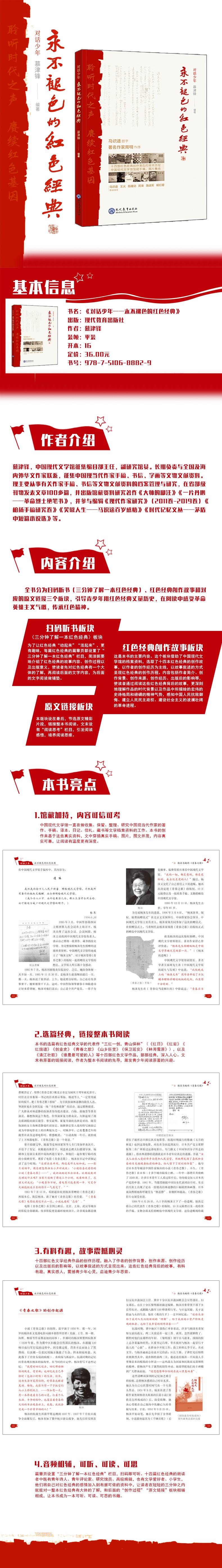 走进红色经典,赓续红色血脉,让红色资源鲜活起来,让红色文化更有感染力。馆藏加持,内容可信可考;选篇经典,链接整本书阅读;音频相辅,可听、可读、可思;有料有趣,故事震撼心灵。在时空穿越的对话中,一个个感人至深的红色经典创作故事,给青少年带来更多思索,激励他们缅怀历史,珍惜今天,更好地面向未来。
