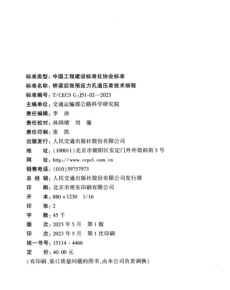 书名:桥梁后张预应力孔道压浆技术规程(T/CECS G:J51-02—2023)