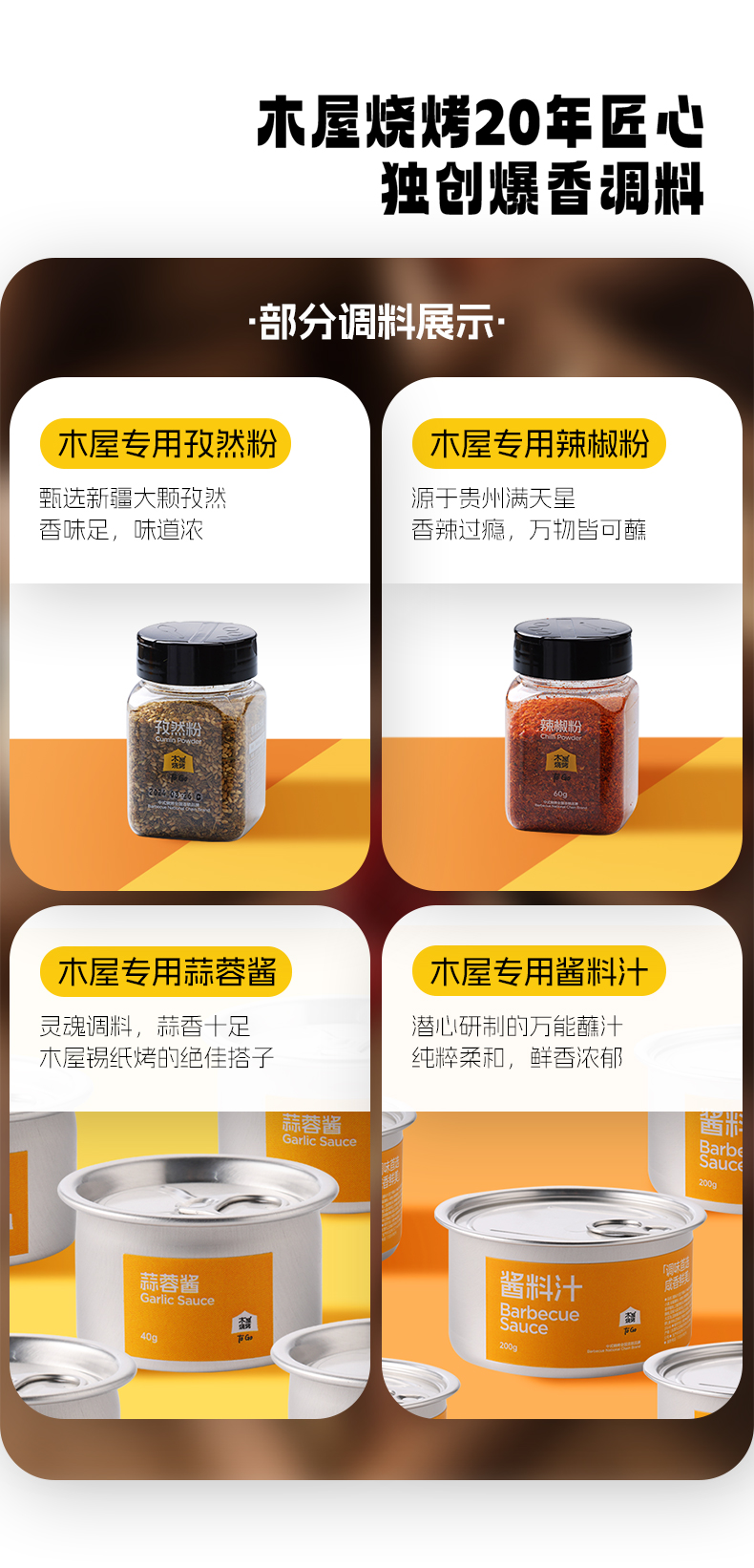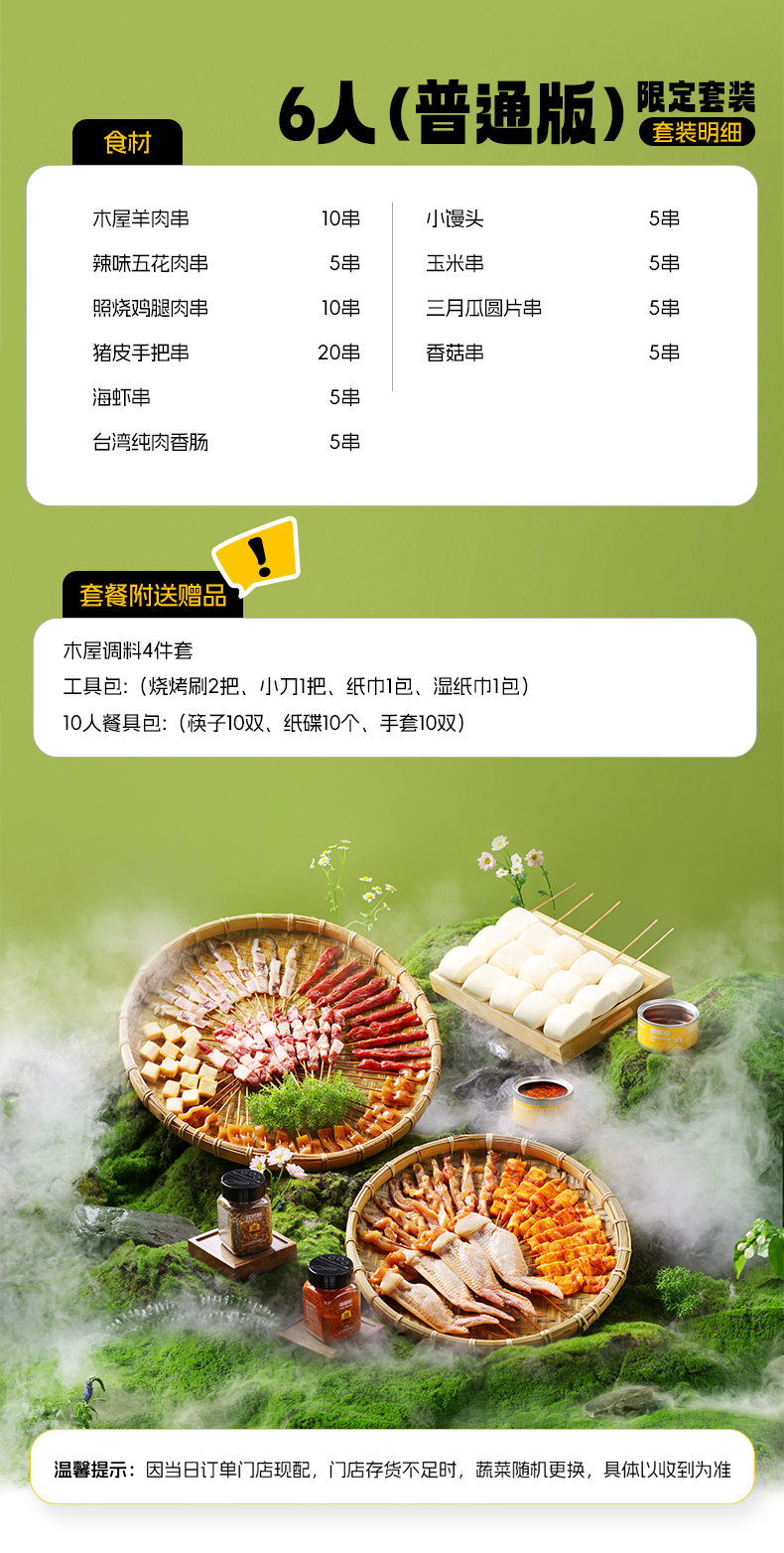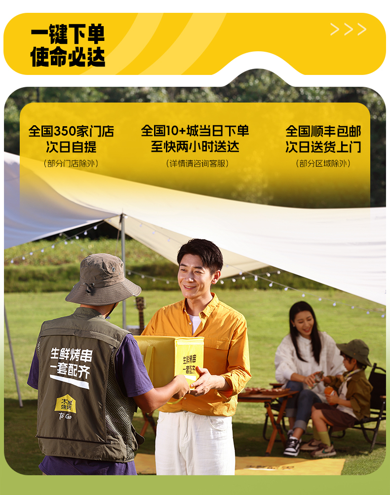 木屋烧烤半成品套装,一键下单,使命必达。 -全国300家门店支持次日到店自提 -全国顺丰包邮,当日下单,次日顺丰送货上门(部分区域除外,实际以顺丰时效为准)