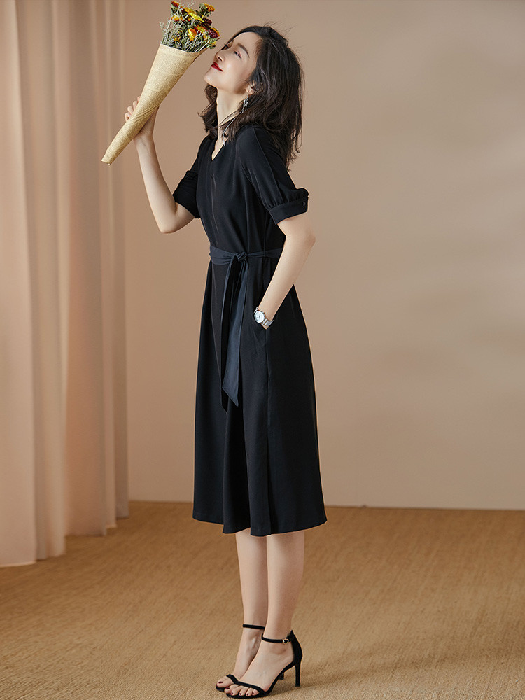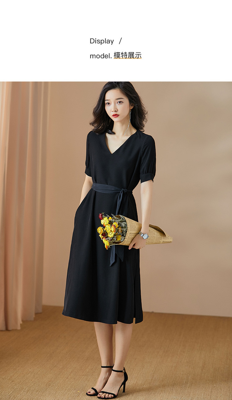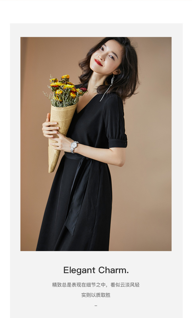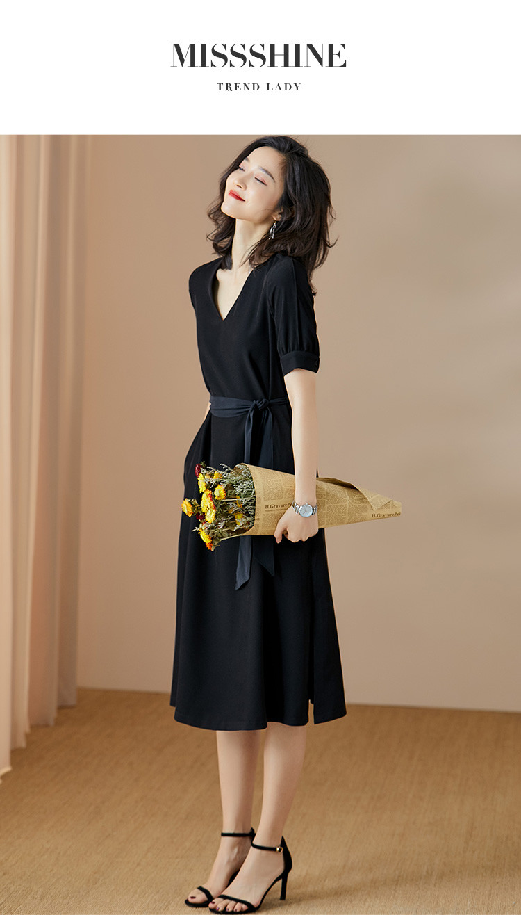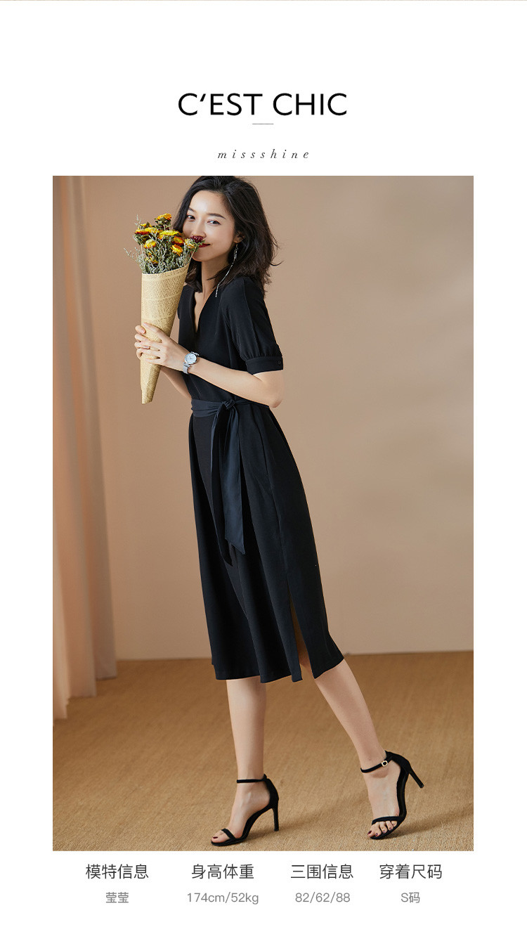 剩S 米思阳夏季2024新款简约大方纯色V领系带侧开叉连衣裙女2503