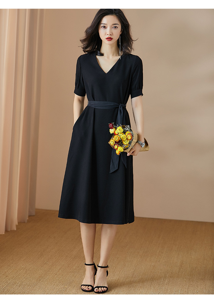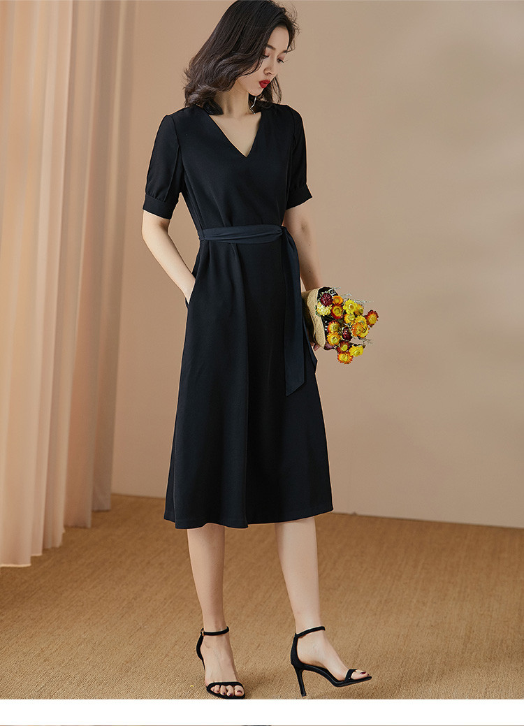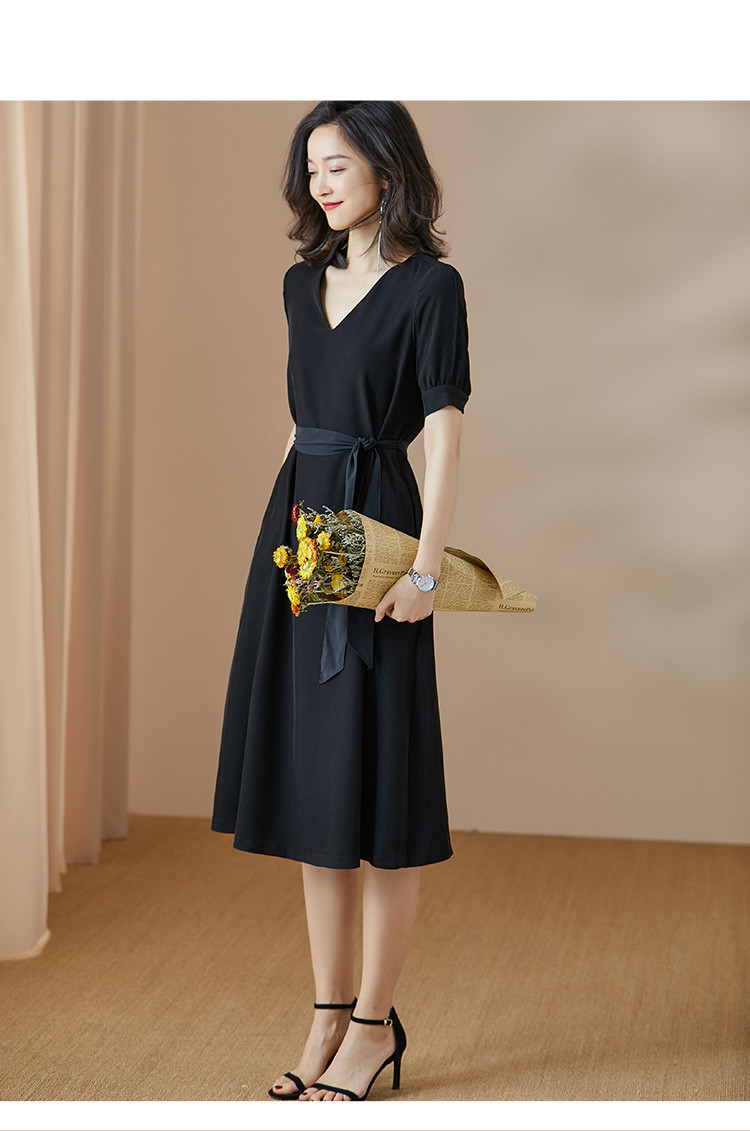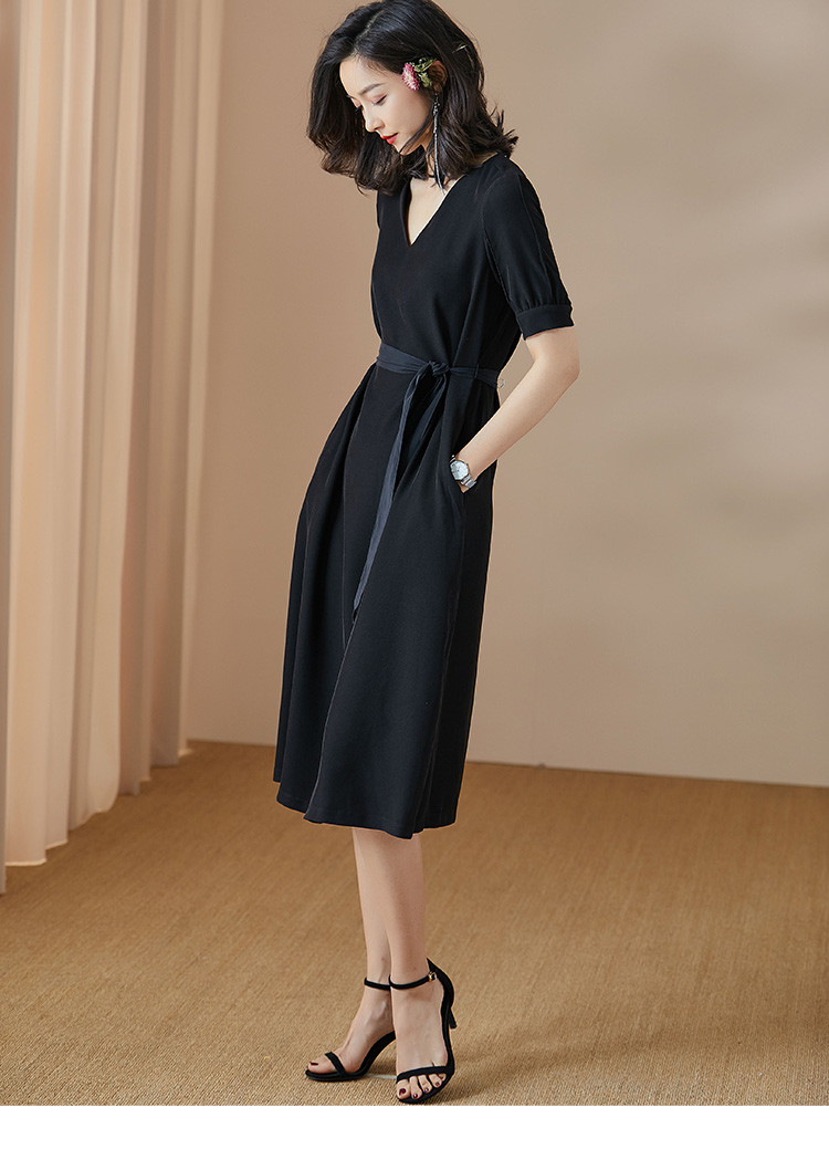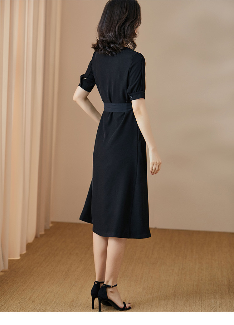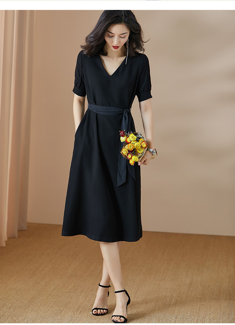 剩S 米思阳夏季2024新款简约大方纯色V领系带侧开叉连衣裙女2503