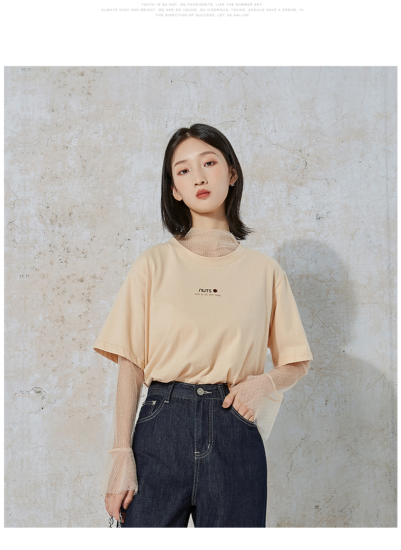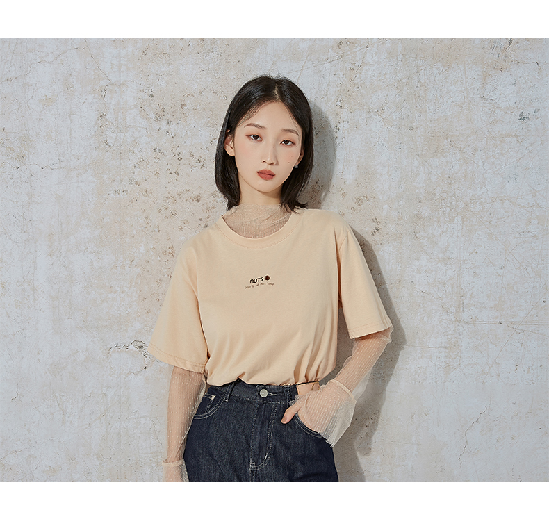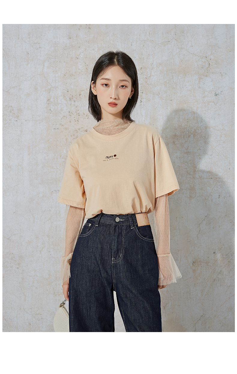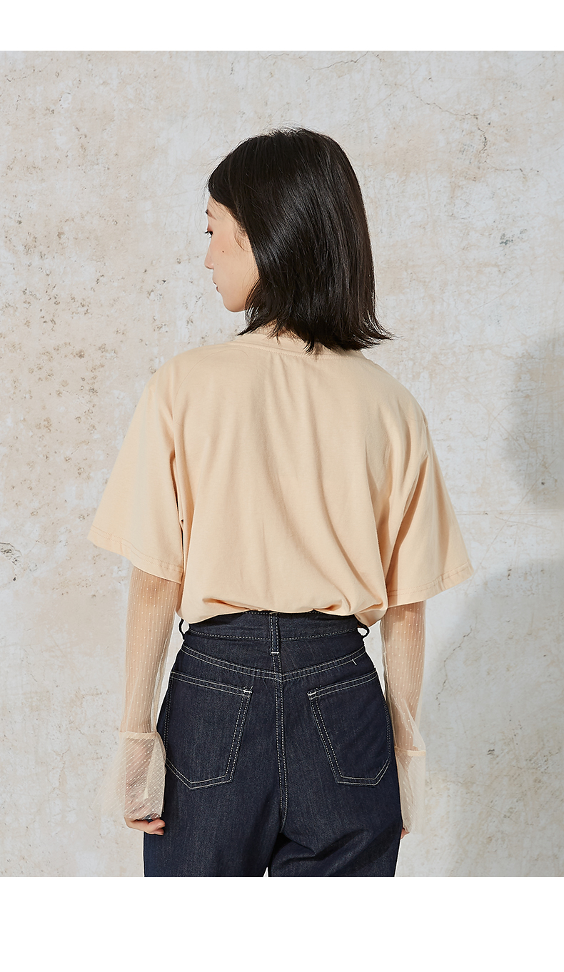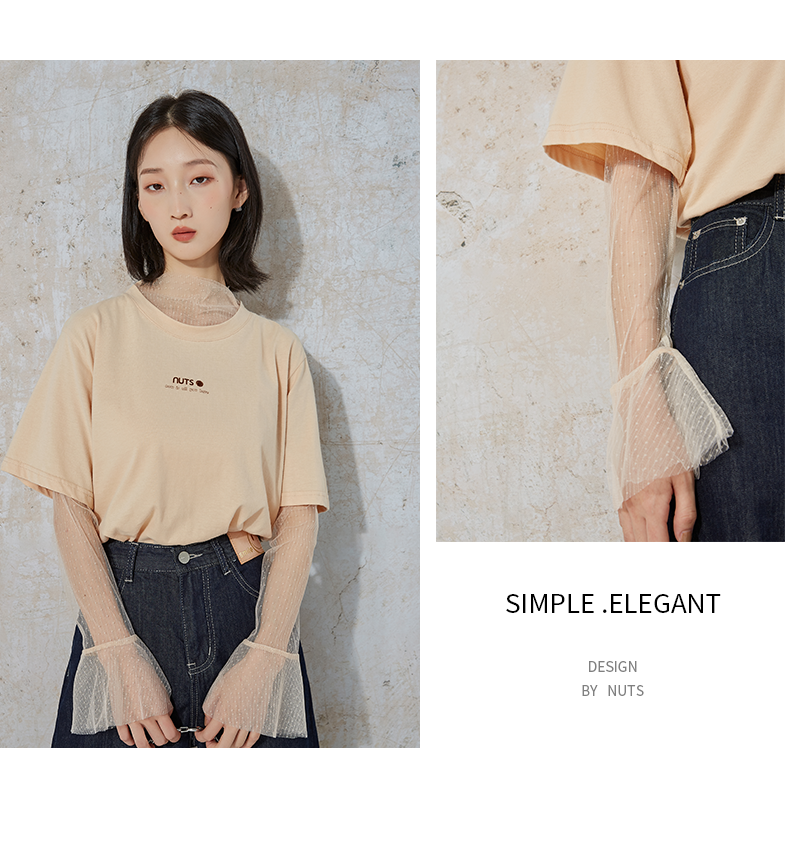 NUTS夏季新款时尚休闲风宽松显瘦长袖T恤女 含内件网纱231023074B