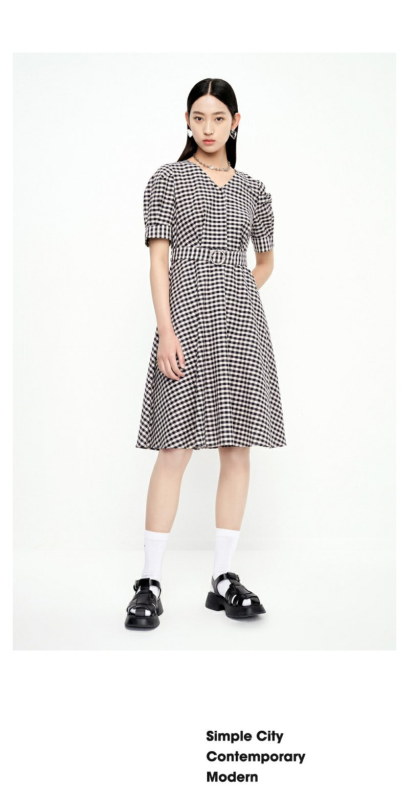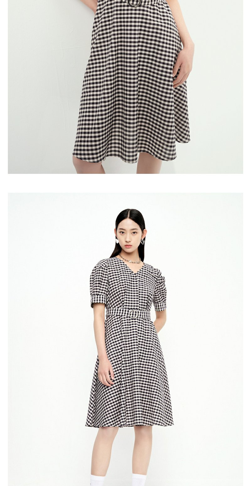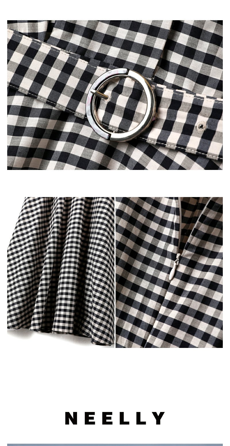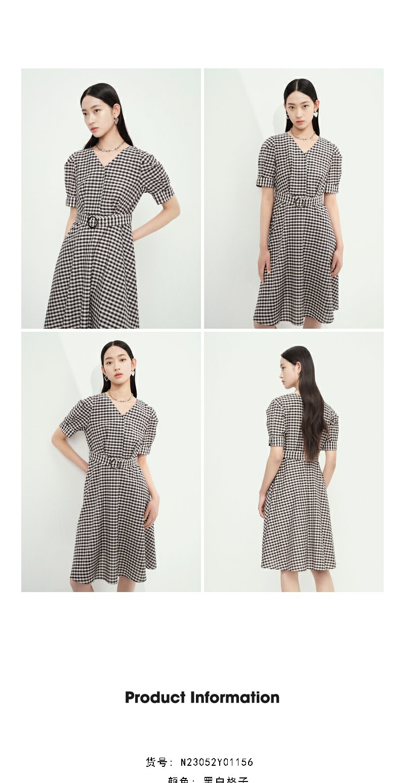 NEELLY纳俪商场同款V领黑白格子连衣裙女泡泡袖收腰中长款A字裙子N23052Y01156
