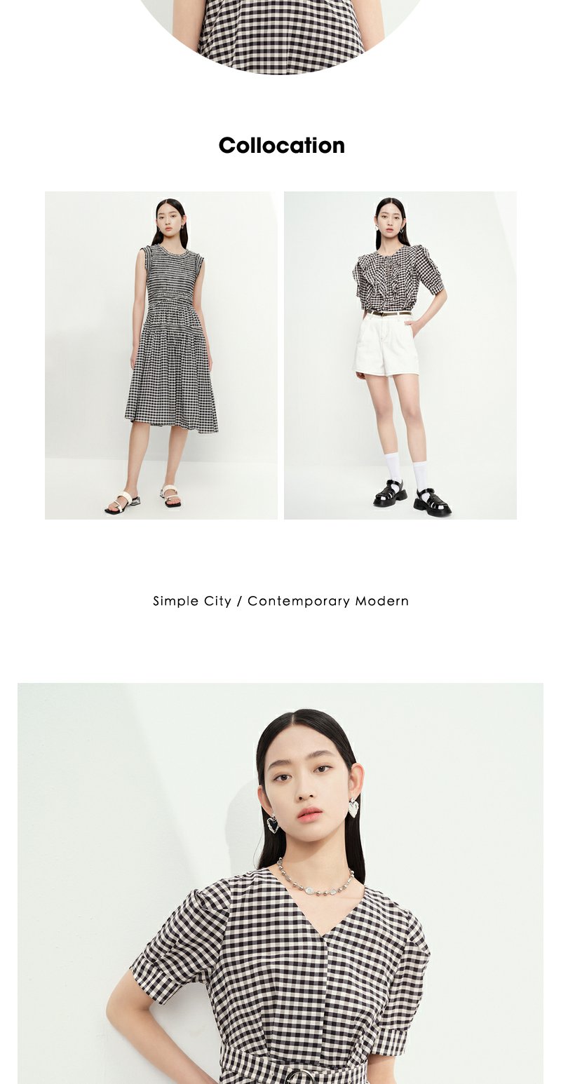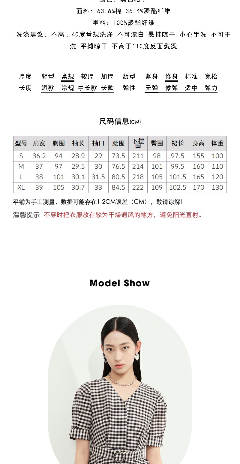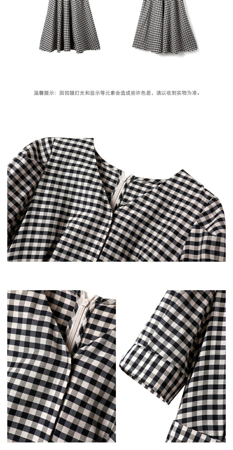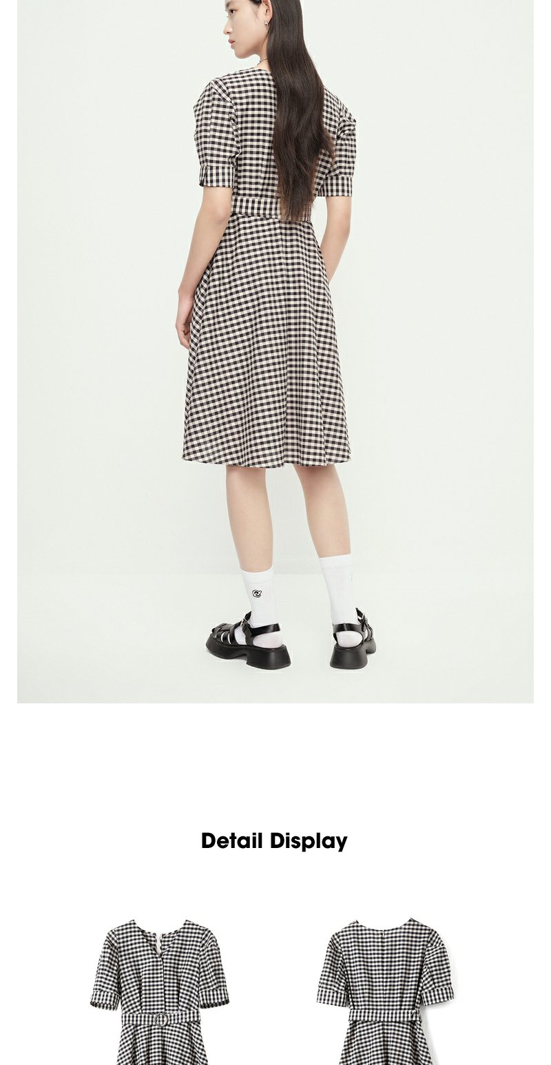 NEELLY纳俪商场同款V领黑白格子连衣裙女泡泡袖收腰中长款A字裙子N23052Y01156