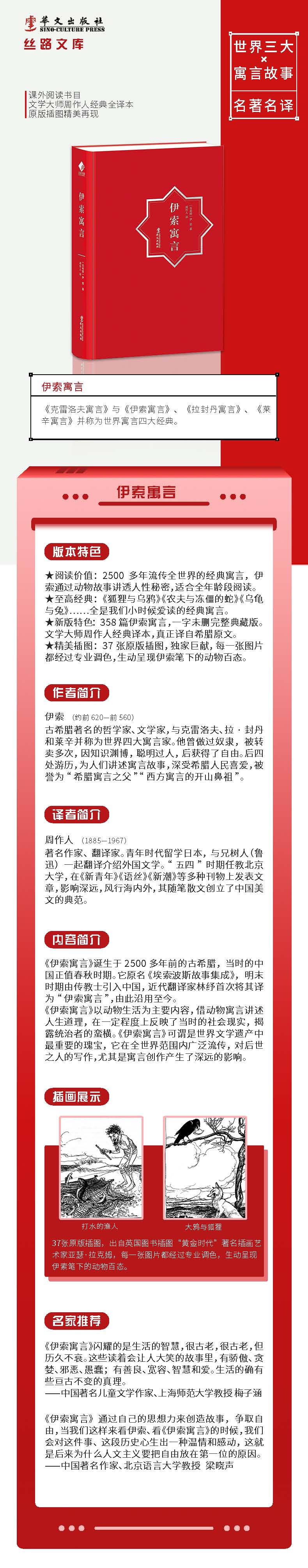 《伊索寓言》诞生于2500多年前的古希腊,当时的中国正值春秋时期。它原名《埃索波斯故事集成》,明末时期由传教士引入中国,近代翻译家林纾首次将其译为“伊索寓言”,由此沿用至今。 《伊索寓言》以动物生活为主要内容,借动物寓言讲述人生道理,在一定程度上反映了当时的社会现实,揭露统治者的蛮横。《伊索寓言》可谓是世界文学遗产中最重要的瑰宝,它在全世界范围内广泛流传,对后世之人的写作,尤其是寓言创作产生了深远的影响。