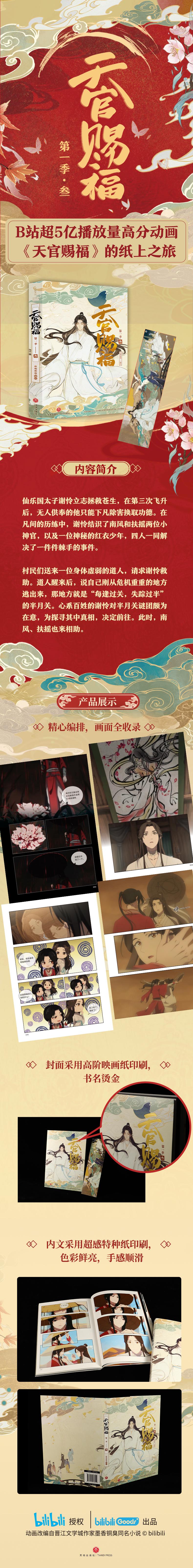 《天官赐福·第一季》实体书根据B站高分动画《天官赐福》剧集画面制作而成,第一季讲述了一个关于救赎与守护的故事。仙乐国太子谢怜立志拯救苍生,在第三次飞升后,无人供奉的他只能下凡除害换取功德。在凡间的历练中,谢怜结识了南风和扶摇两位小神官,以及一位神秘的红衣少年,四人一同解决了一件件棘手的事件。