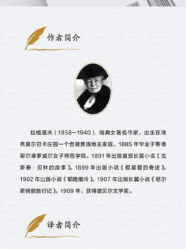塞尔玛·拉格洛夫(1858—1940),瑞典女著名作家。出生在瑞典莫尔巴卡庄园一个世袭贵族地主家庭。1885年毕业于斯德哥尔摩罗威尔女子师范学院。1891年出版首部长篇小说《古斯泰•贝林的故事》。1899年出版小说《假基督的奇迹》。1902年出版小说《耶路撒冷》。1907年出版长篇小说《尼尔斯骑鹅旅行记》。1909年,获得诺贝尔文学奖。