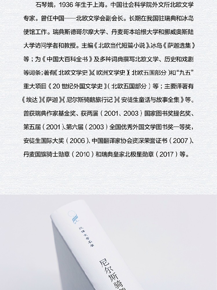 石琴娥,1936年生于上海。中国社会科学院外文所北欧文学专家。曾任中国——北欧文学会副会长。长期在我国驻瑞典和冰岛使馆工作。瑞典斯德哥尔摩大学、丹麦哥本哈根大学和挪威奥斯陆大学访问学者和教授。主编《北欧当代短篇小说》、冰岛《萨迦选集》等;为《中国大百科全书》及多种词典撰写北欧文学、历史和戏剧等词条;著有《北欧文学史》、《欧洲文学史》(北欧五国部分)和“九五”重大项目《20世纪外国文学史》(北欧五国部分)等;主要译著有《埃达》《萨迦》《尼尔斯骑鹅旅行记》《安徒生童话与故事全集》等。曾获瑞典作家基金奖、获两届(2001、2003)国家图书奖提名奖、第五届(2001)、第六届(2003)全国优秀外国文学图书奖一等奖,安徒生国际大奖(2006)、中国翻译家协会资深荣誉证书(2007)、丹麦国旗骑士勋章(2010)和瑞典皇家北极星勋章(2017)等。