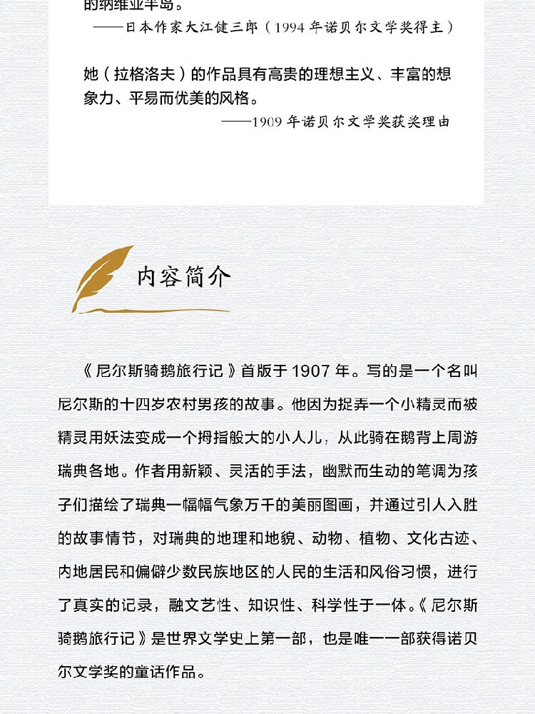 《尼尔斯骑鹅旅行记》首版于1907年。写的是一个名叫尼尔斯的十四岁农村男孩的故事。他因为捉弄一个小精灵而被精灵用妖法变成一个拇指般大的小人儿,从此骑在鹅背上周游瑞典各地。作者用新颖、灵活的手法,幽默而生动的笔调为孩子们描绘了瑞典一幅幅气象万千的美丽图画,并通过引人入胜的故事情节,对瑞典的地理和地貌、动物、植物、文化古迹、内地居民和偏僻少数民族地区的人民的生活和风俗习惯,进行了真实的记录,融文艺性、知识性、科学性于一体。《尼尔斯骑鹅旅行记》是世界文学史上第一部,也是唯一一部获得诺贝尔文学奖的童话作品。
