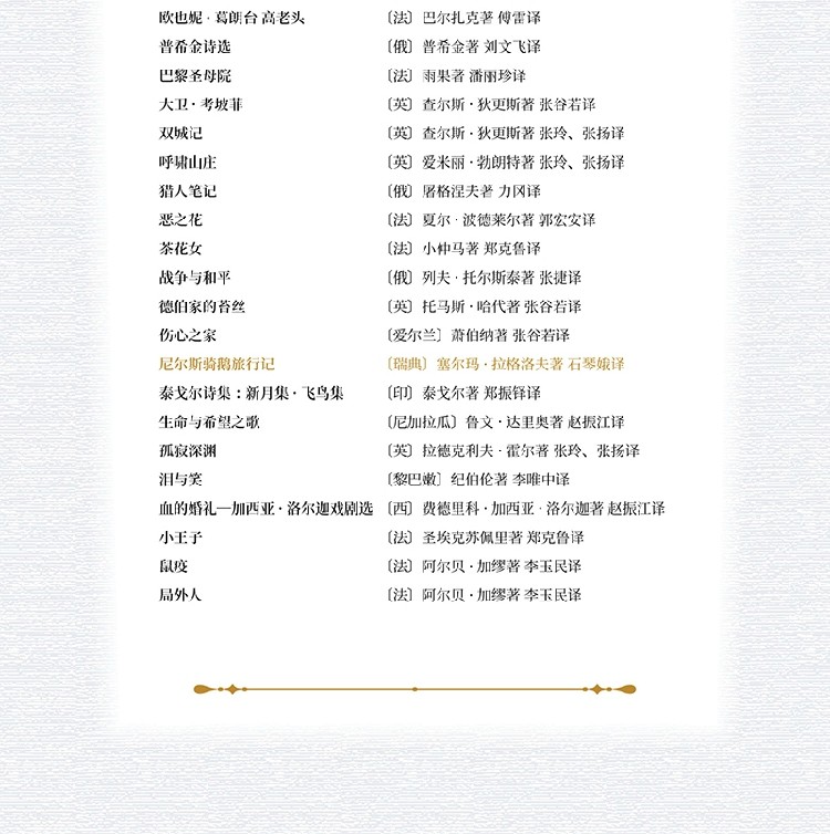 第一辑30种:《伊索寓言》《一千零一夜》《托尔梅斯河的拉撒路》《培根随笔全集》《伯爵家书》《弃儿汤姆•琼斯史》《少年维特的烦恼》《傲慢与偏见》《红与黑》《欧也妮•葛朗台 高老头》《普希金诗选》《巴黎圣母院》《大卫•考坡菲》《双城记》《呼啸山庄》《猎人笔记》《恶之花》《茶花女》《战争与和平》《德伯家的苔丝》《伤心之家》《尼尔斯骑鹅旅行记》《泰戈尔诗集:新月集•飞鸟集》《生命与希望之歌》《孤寂深渊》《泪与笑》《血的婚礼:加西亚•洛尔迦戏剧选》《小王子》《鼠疫》《局外人》。