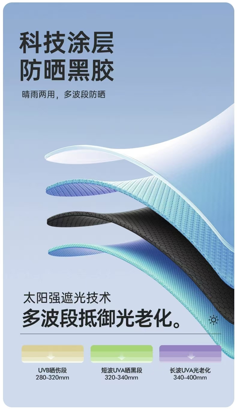 【材质】骨架:6K黑漆钢伞架+玻纤伞骨 伞布:RIB NUMBER高密度黑胶防晒碰击布