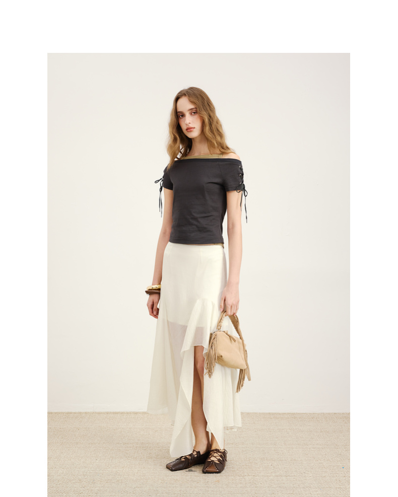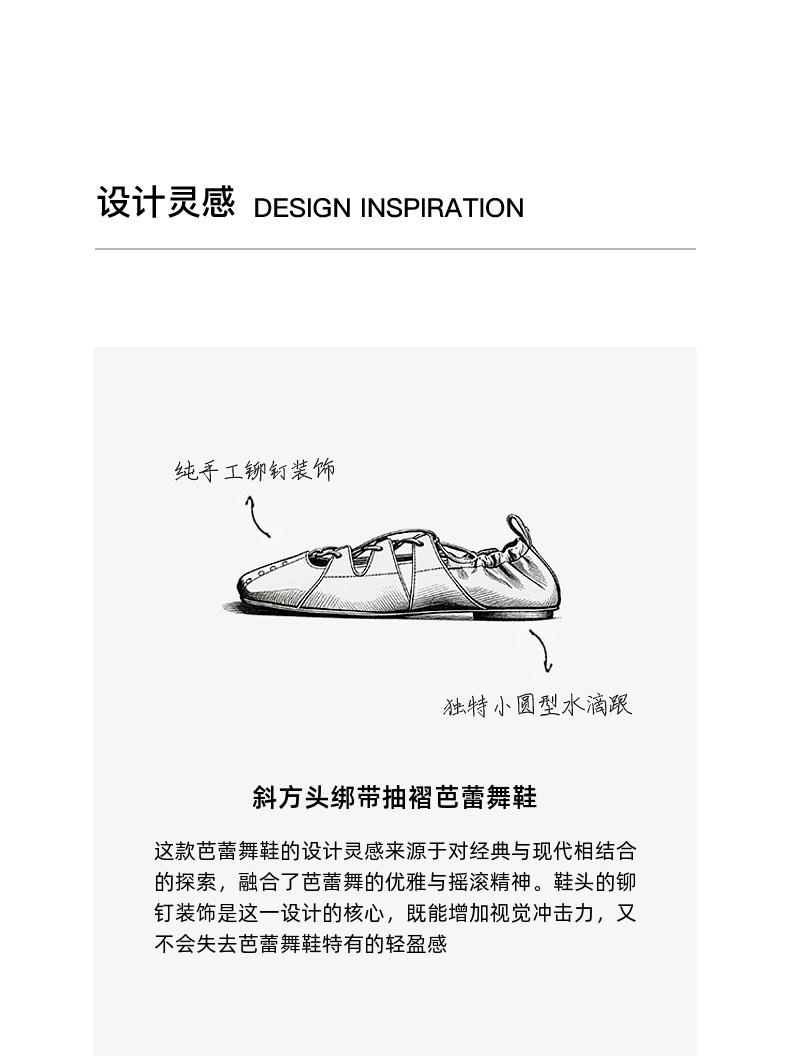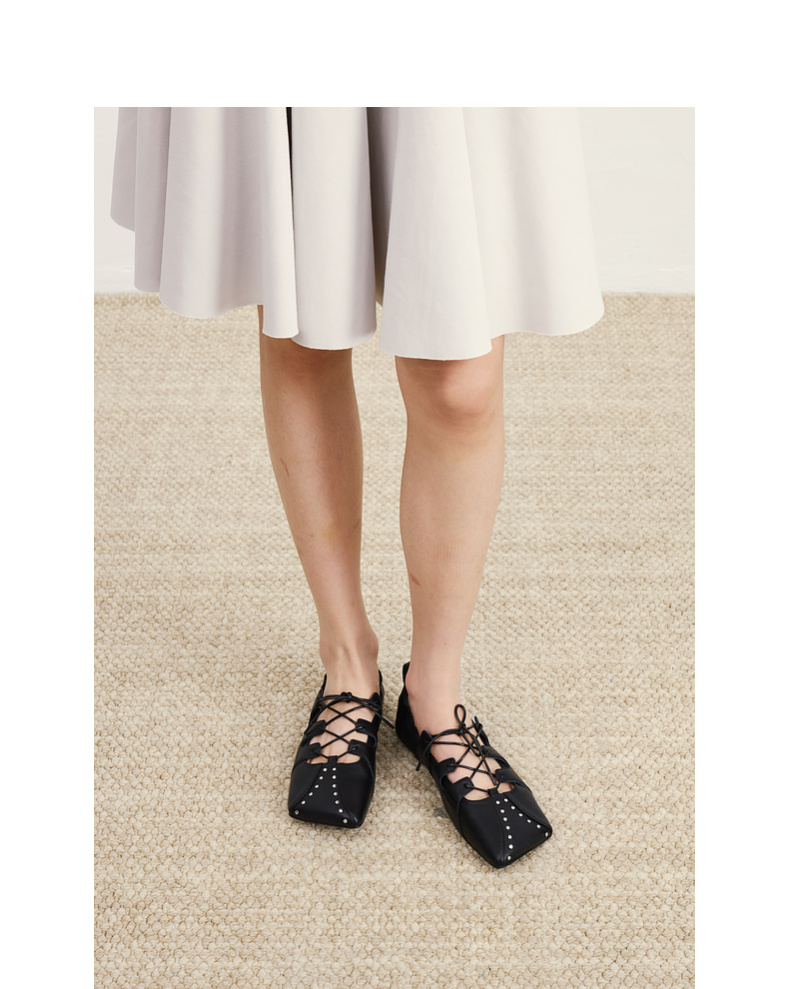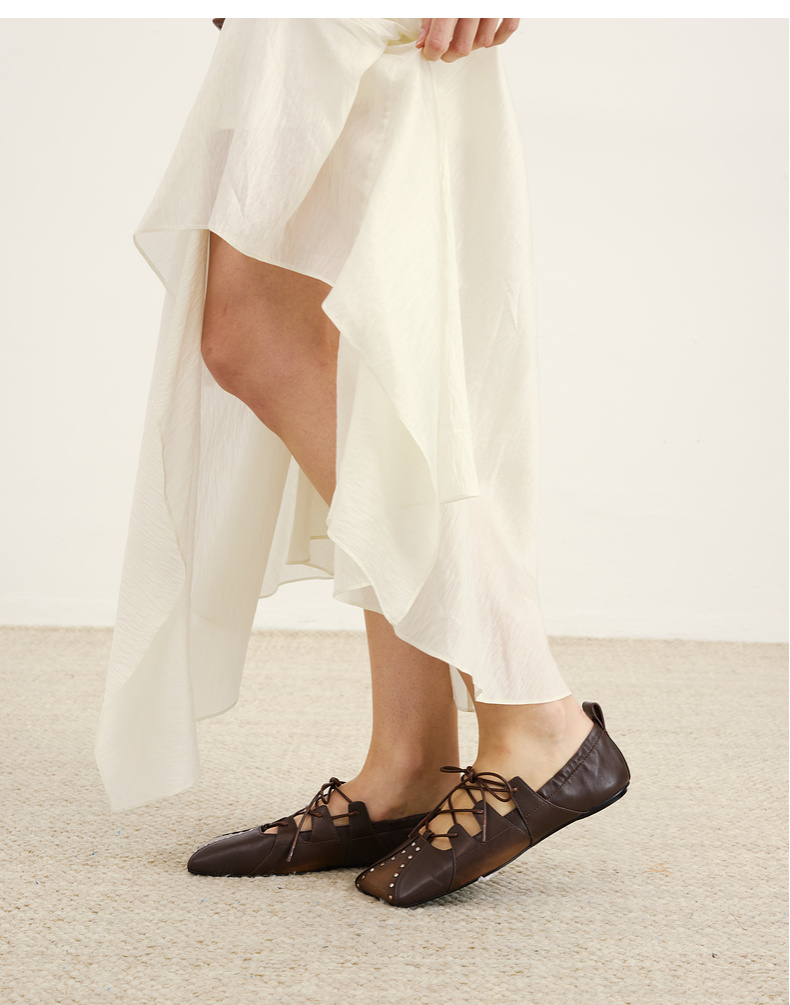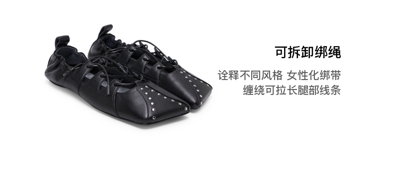 lost in echo2026春夏新款个性铆钉斜方头绑带抽褶真皮芭蕾舞鞋女