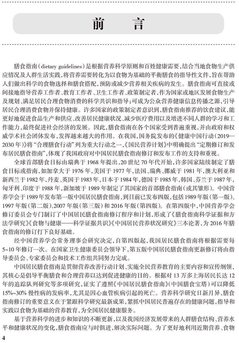 中国营养学会自1989年发布第一版《中国居民膳食指南》以来,目前已发布四版。基于近年来营养膳食与健康研究科学证据的不断更新和发展,中国居民饮食方式和膳食结构不断发生新变化,2016年经中国营养学会常务理事会研究决定,我国居民膳食指南将根据需要每5~10年修订一次。为了更好地制定新版膳食指南,充分利用营养、食物与健康的科学研究成果,组织编写本报告,为制定《中国居民膳食指南(2021)》提供科学依据。本书在2016版《食物与健康-科学证据共识》基础上,汇集近五年来国内外有关食物与健康研究的新证据,结合我国居民食物与营养健康现况及变化趋势,同时参考国外指南的趋势特点,从合理膳食模式、食物选择与健康、各国膳食指南比较、身体活动与饮食等方面进行科学论证。
