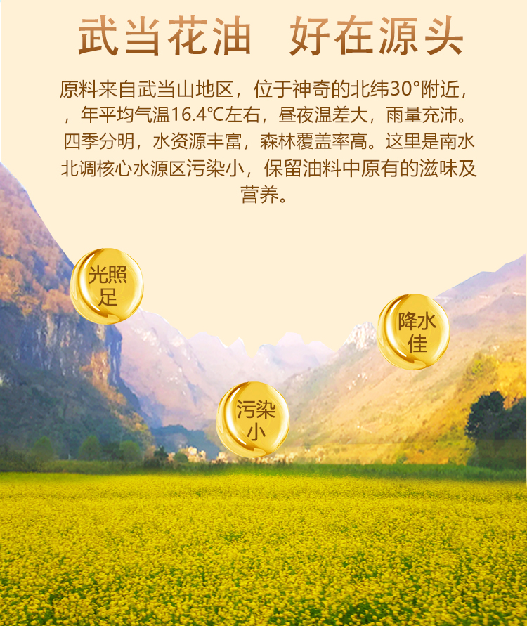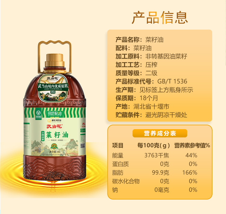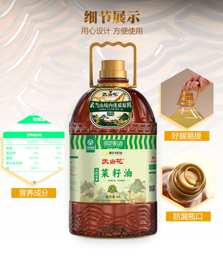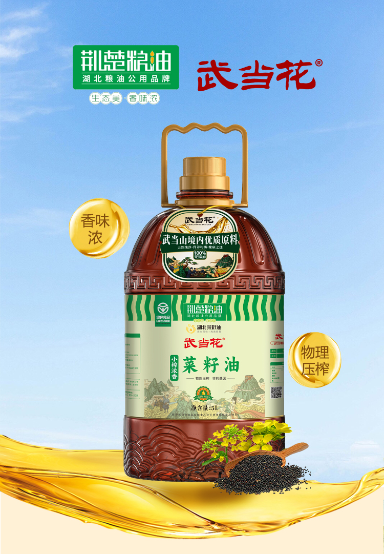 【严选】荆楚粮油湖北菜籽油 甄选非转基因物理压榨 武当花小榨浓香菜籽油5L/桶(厂家直发)