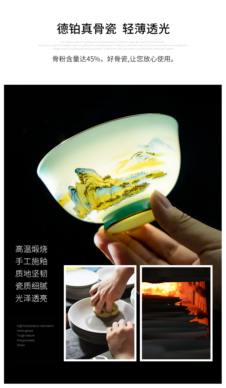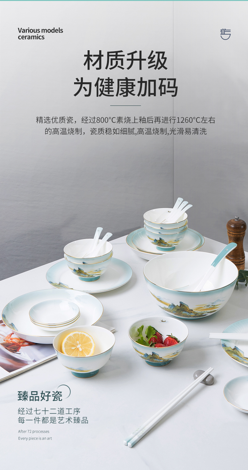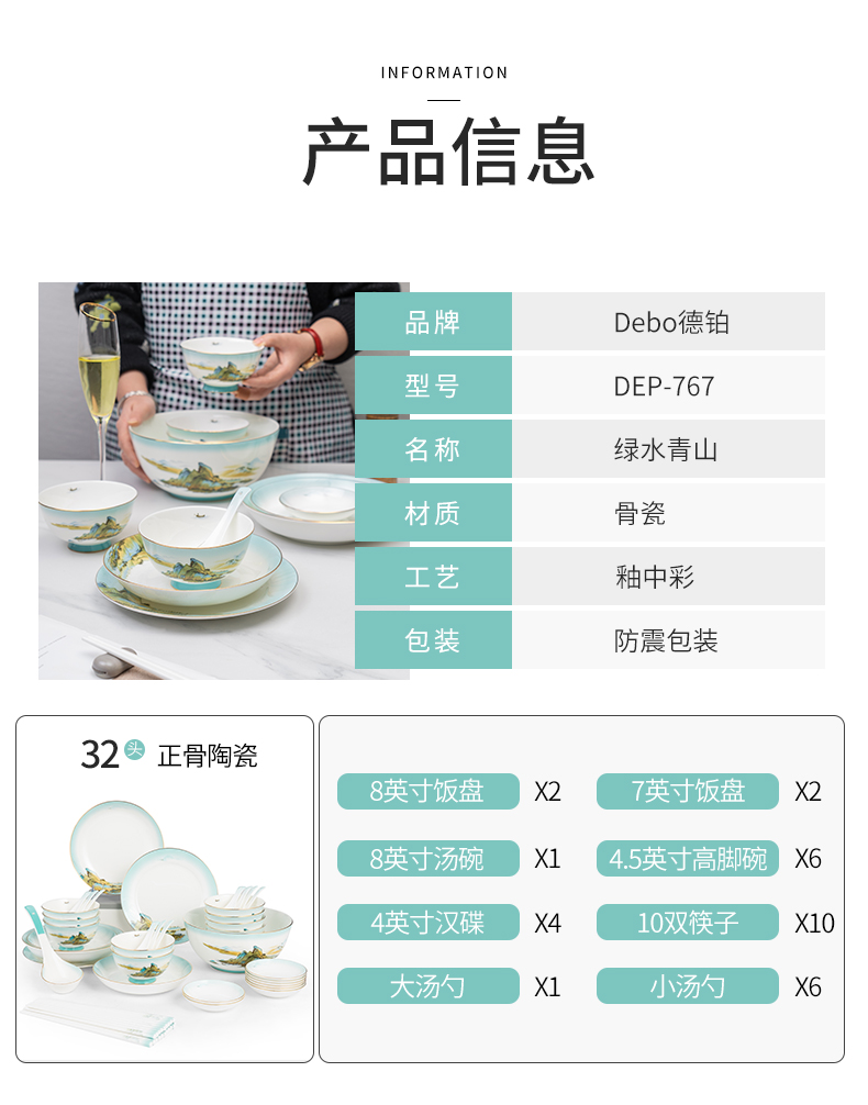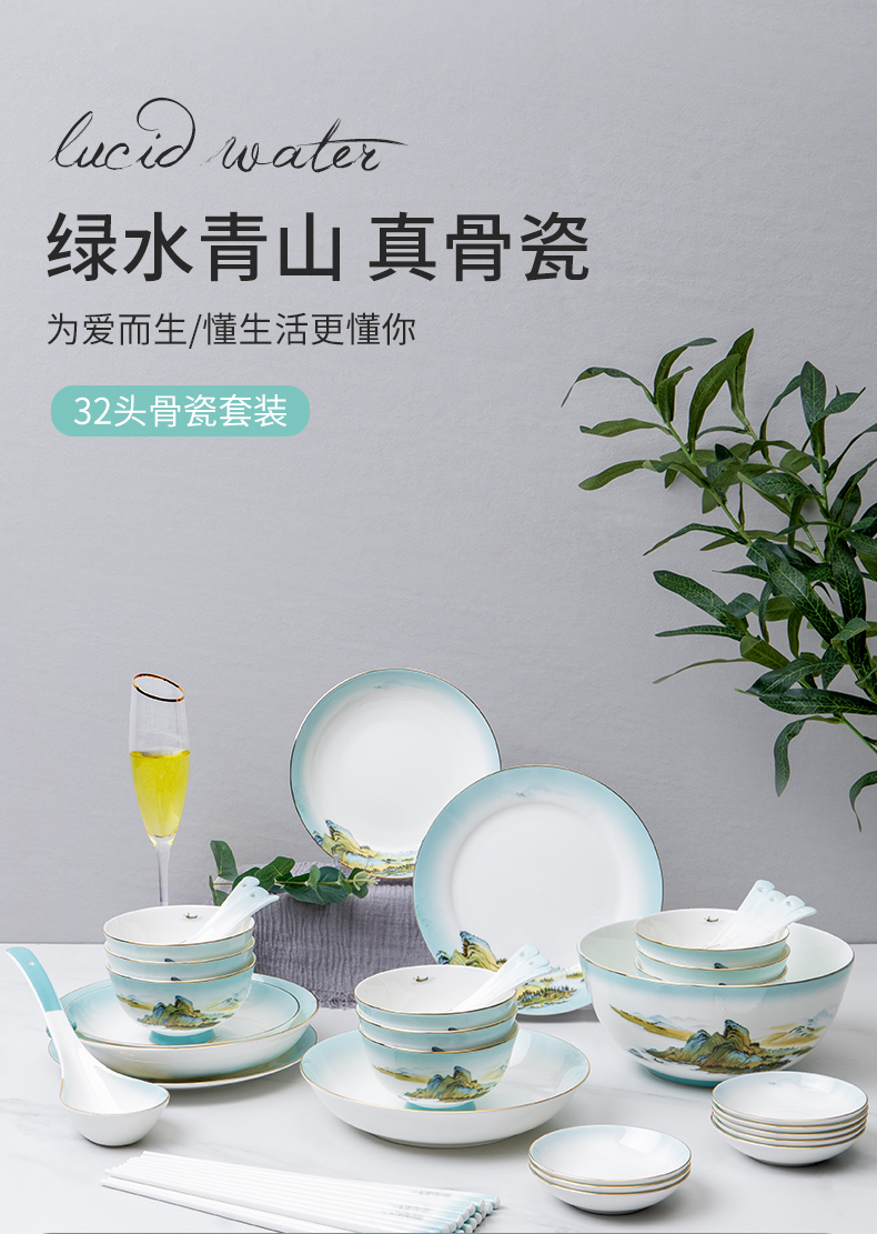 Debo德铂绿水青山高档山水画风格家用正骨陶瓷餐具碗筷32头