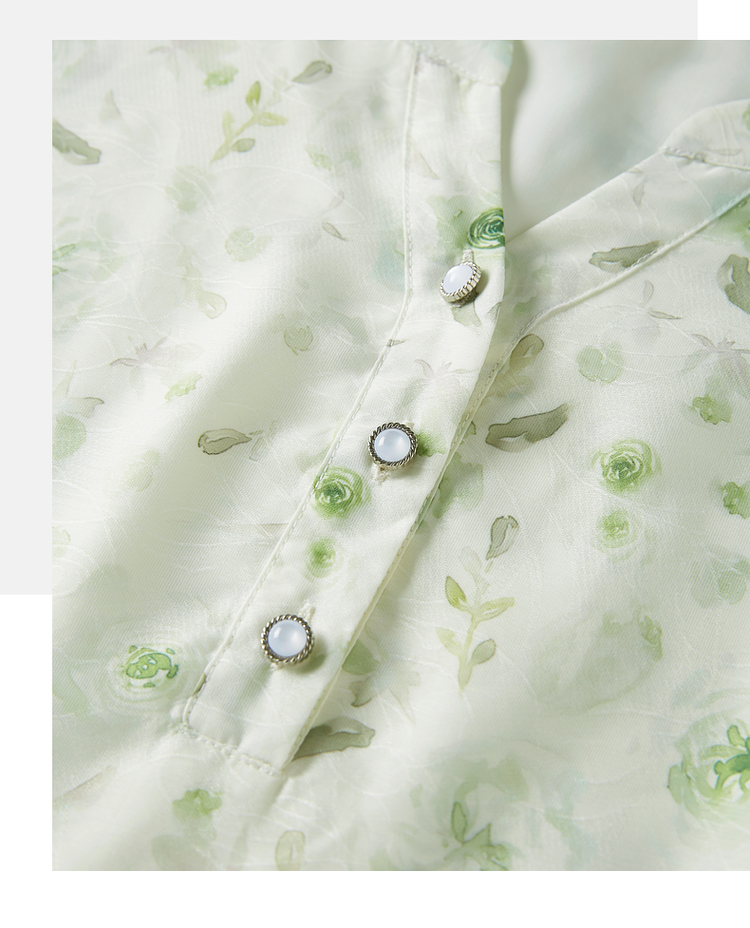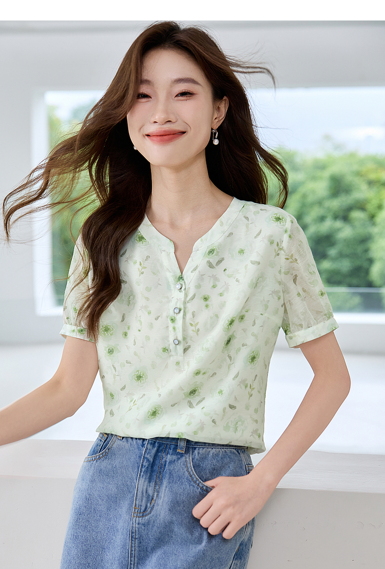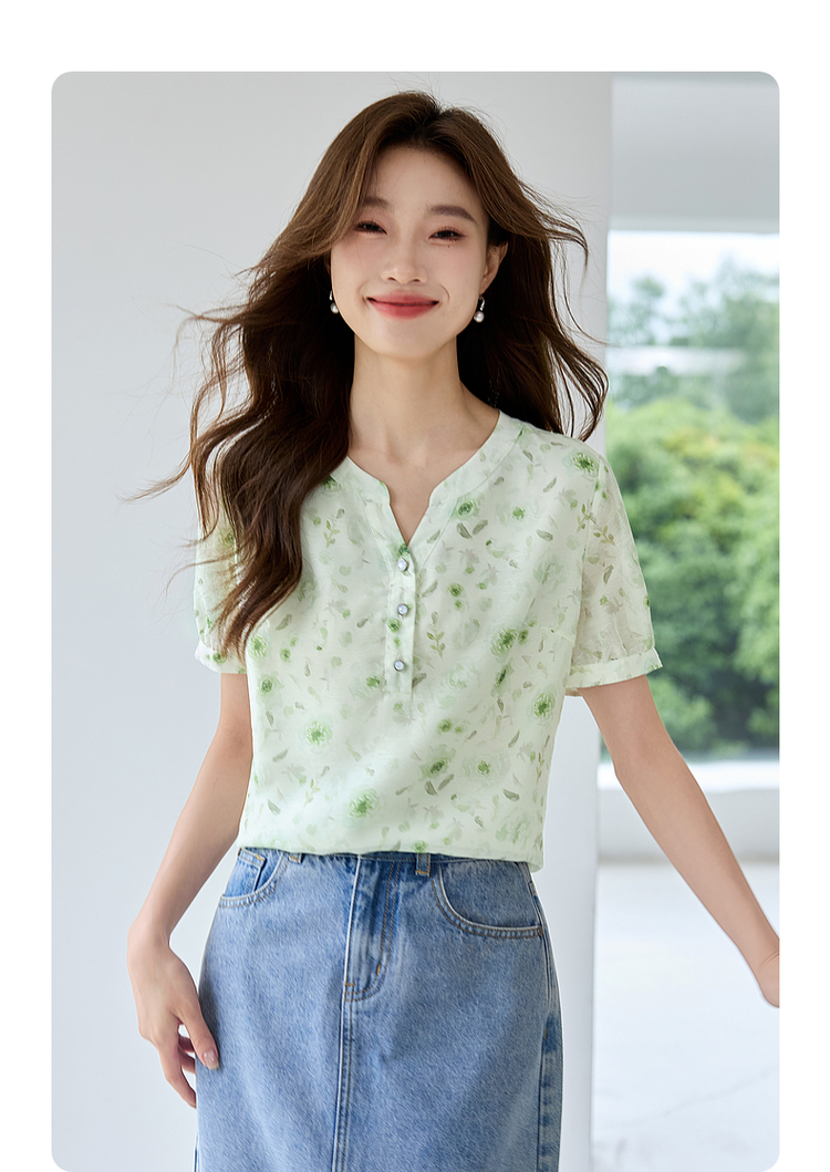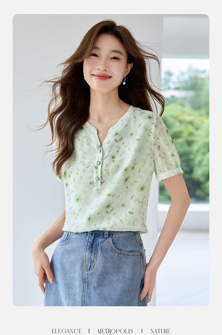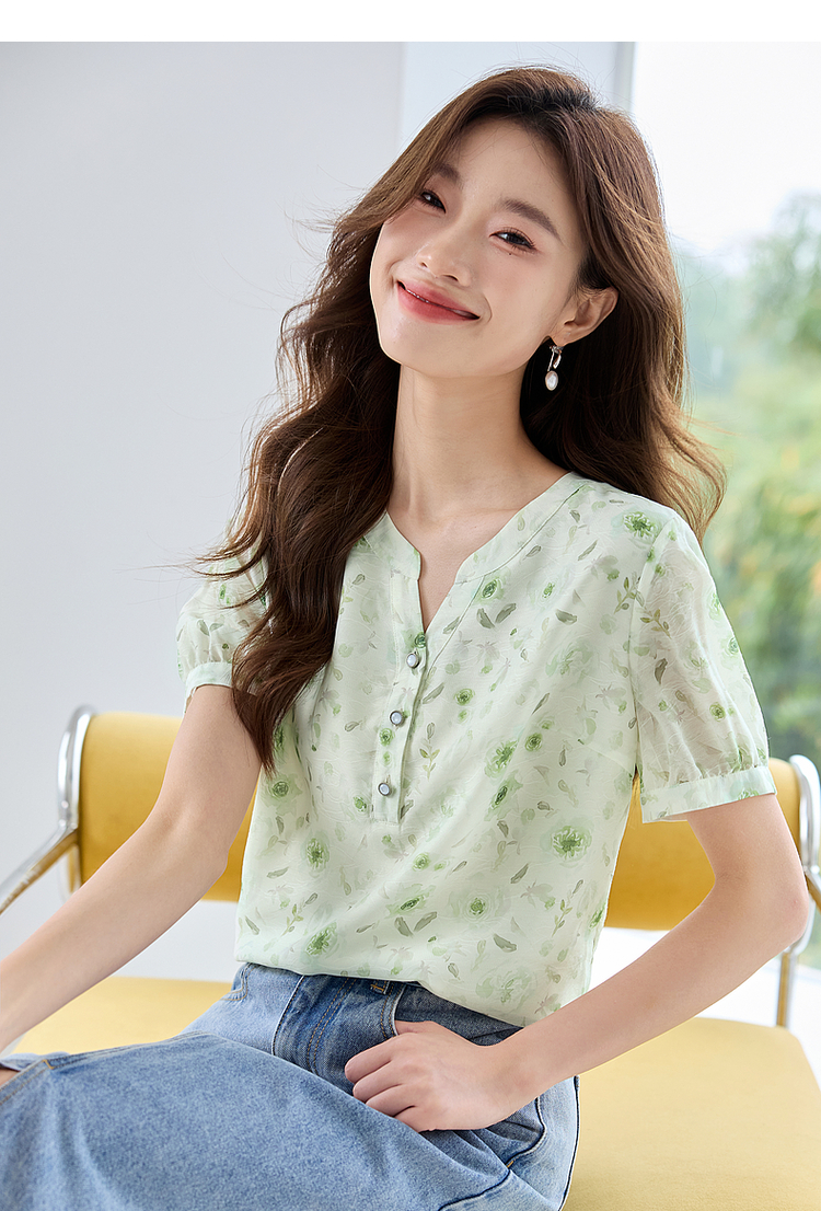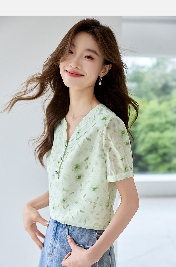 【专属特价】熙世界2025夏季新款薄荷曼波碎花雪纺衬衫女法式泡泡袖绿色小衫